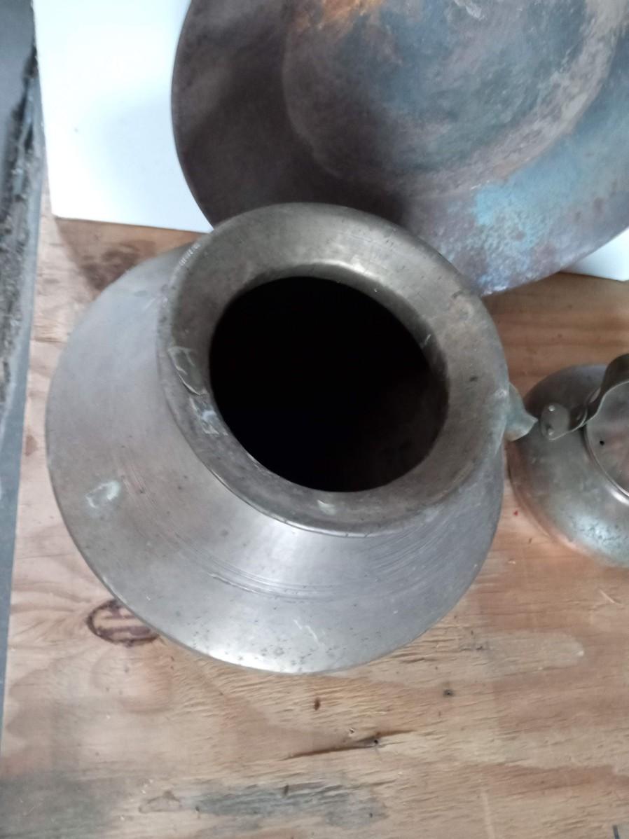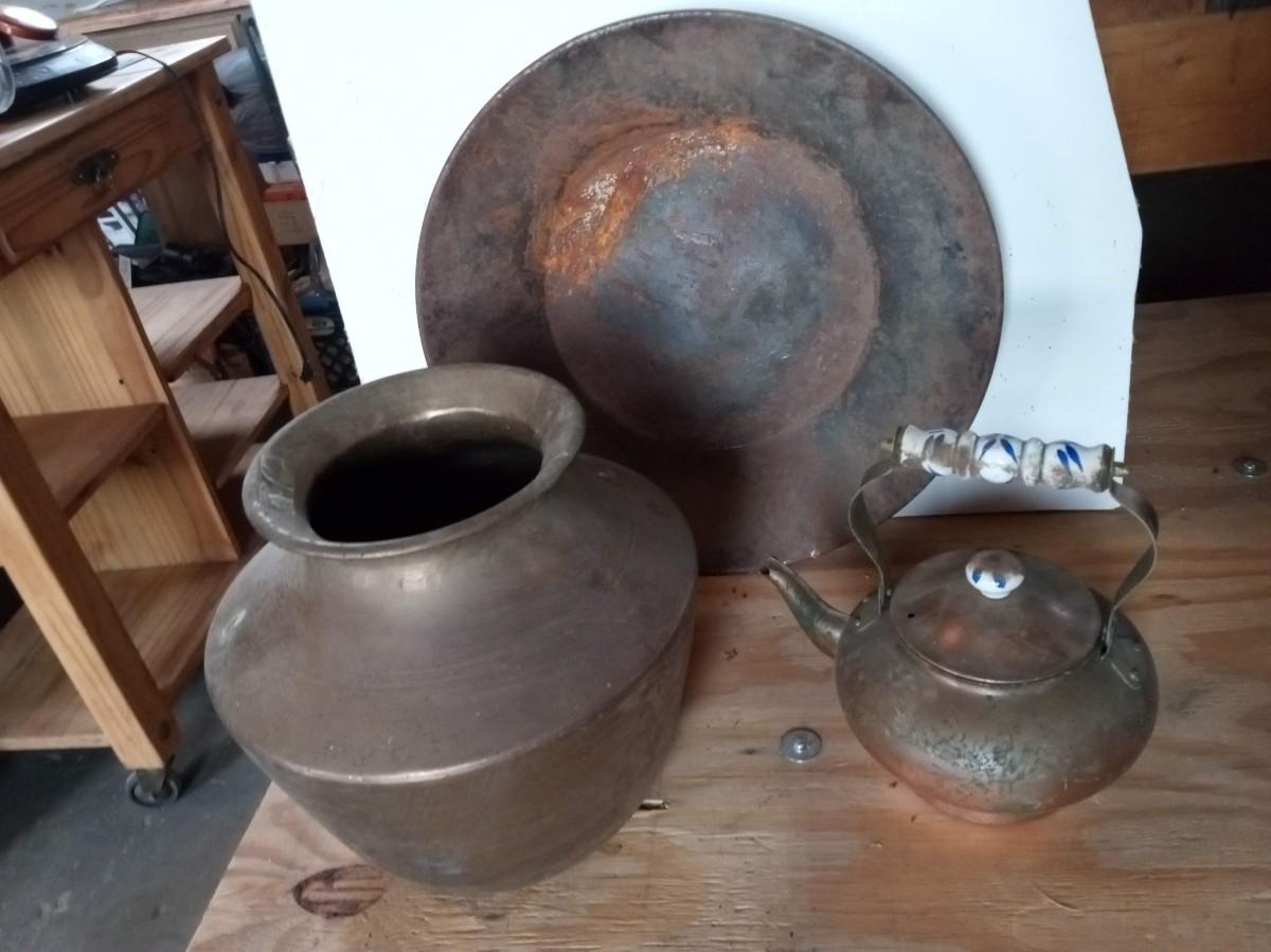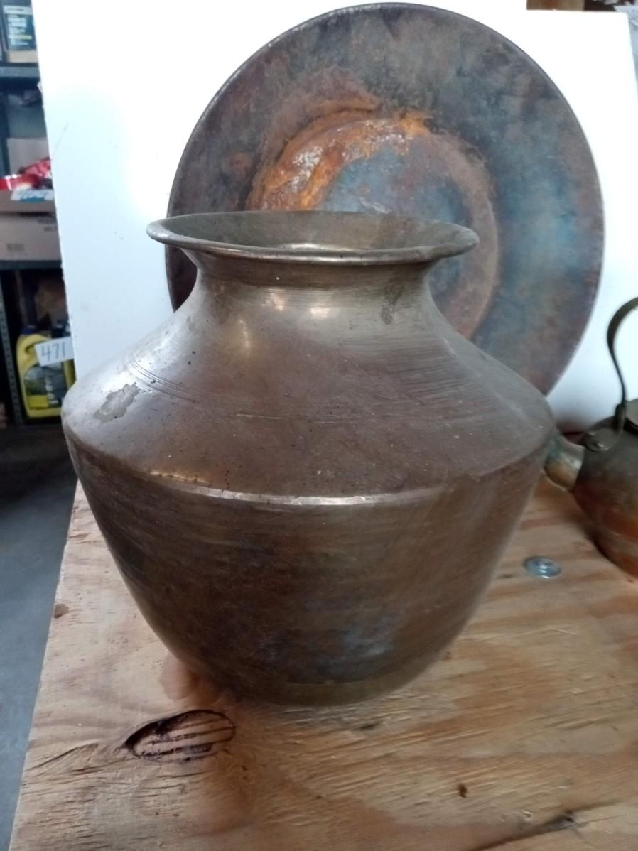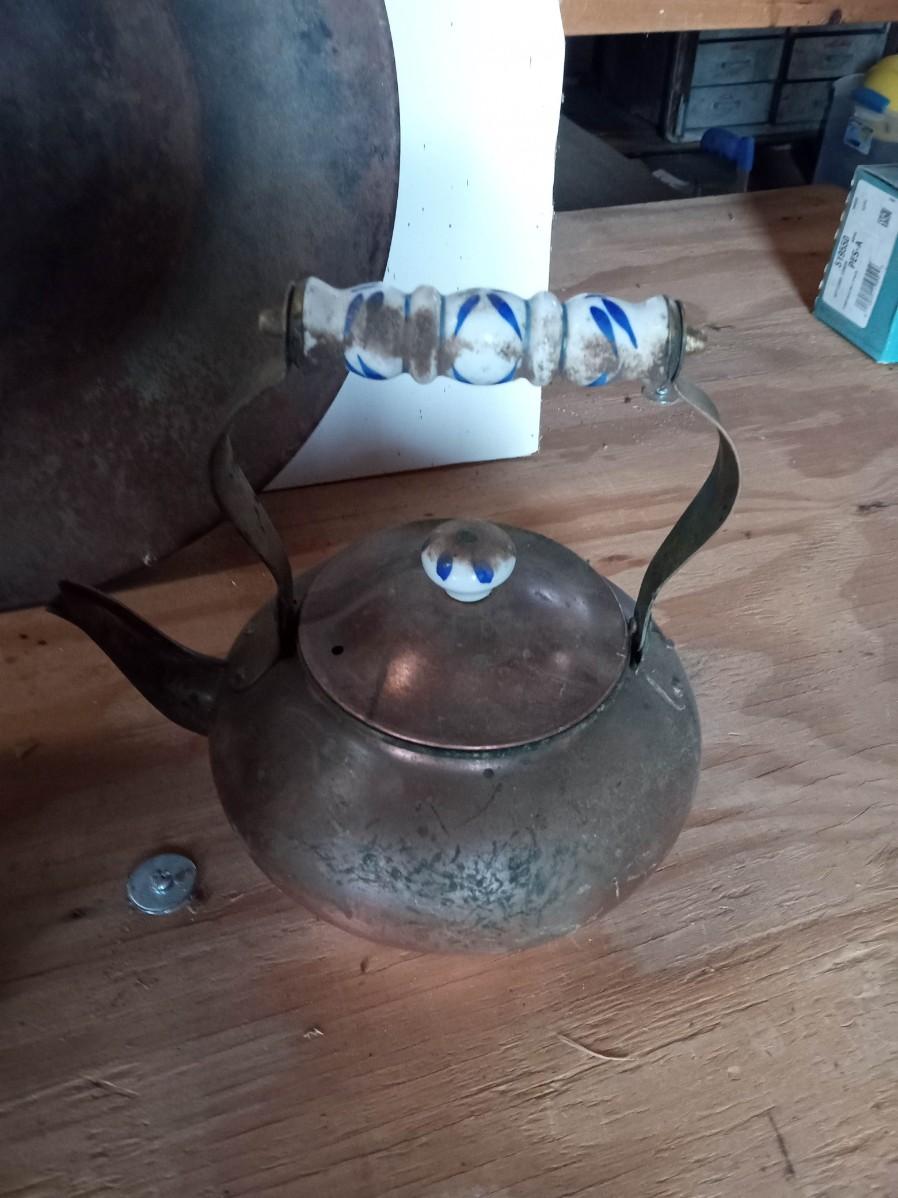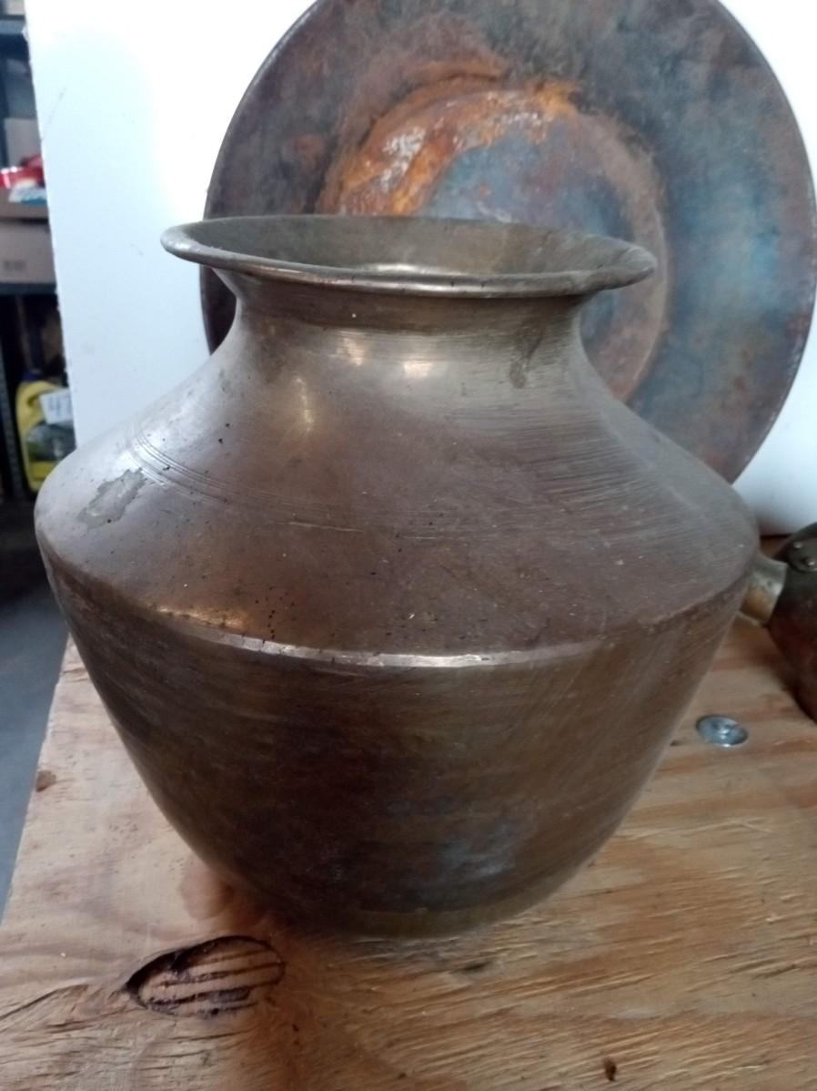 THE SPITOON IS VERY NICE WITH ONLY SMALL DINGS ON THE BOTTOM, THE PAN IS A BIT RUSTY AND THE KETTLE NEEDS TO BE CLEANED