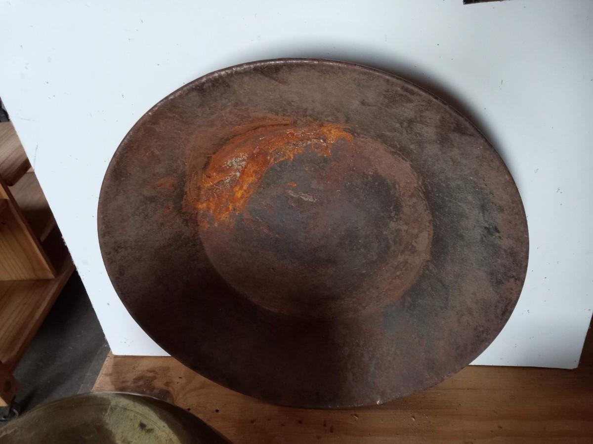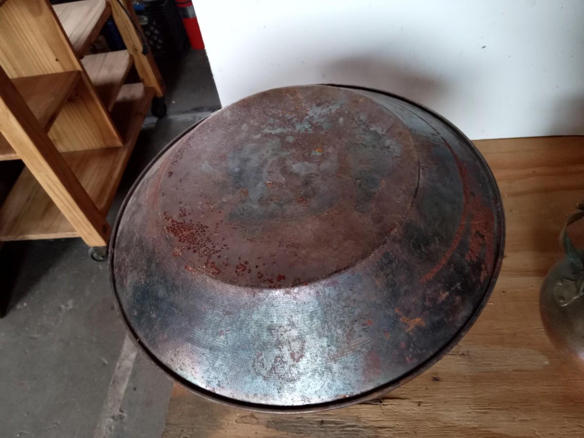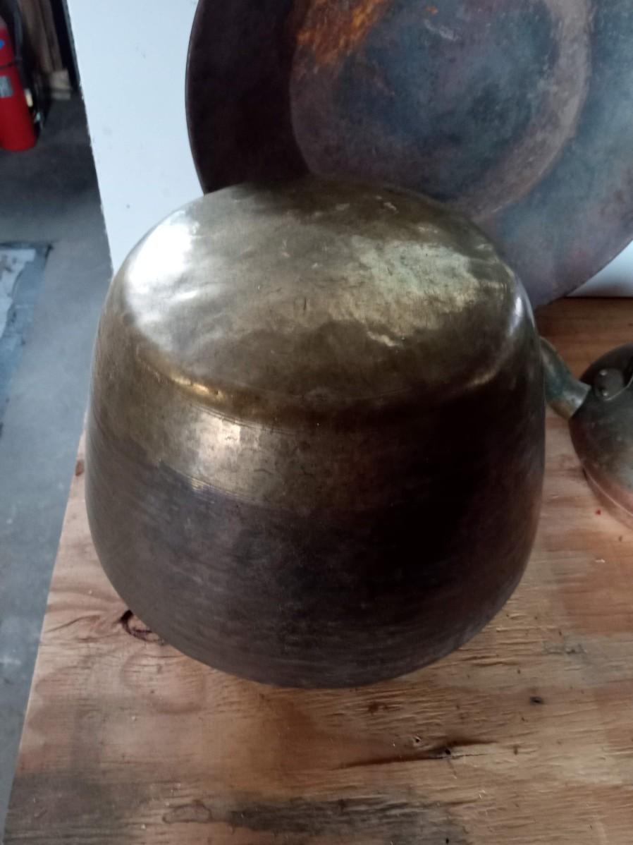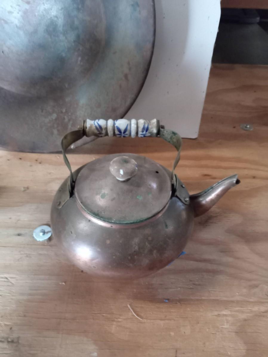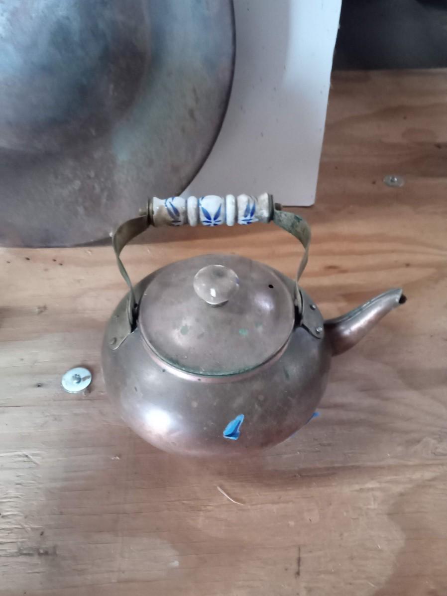 THE SPITOON IS VERY NICE WITH ONLY SMALL DINGS ON THE BOTTOM, THE PAN IS A BIT RUSTY AND THE KETTLE NEEDS TO BE CLEANED