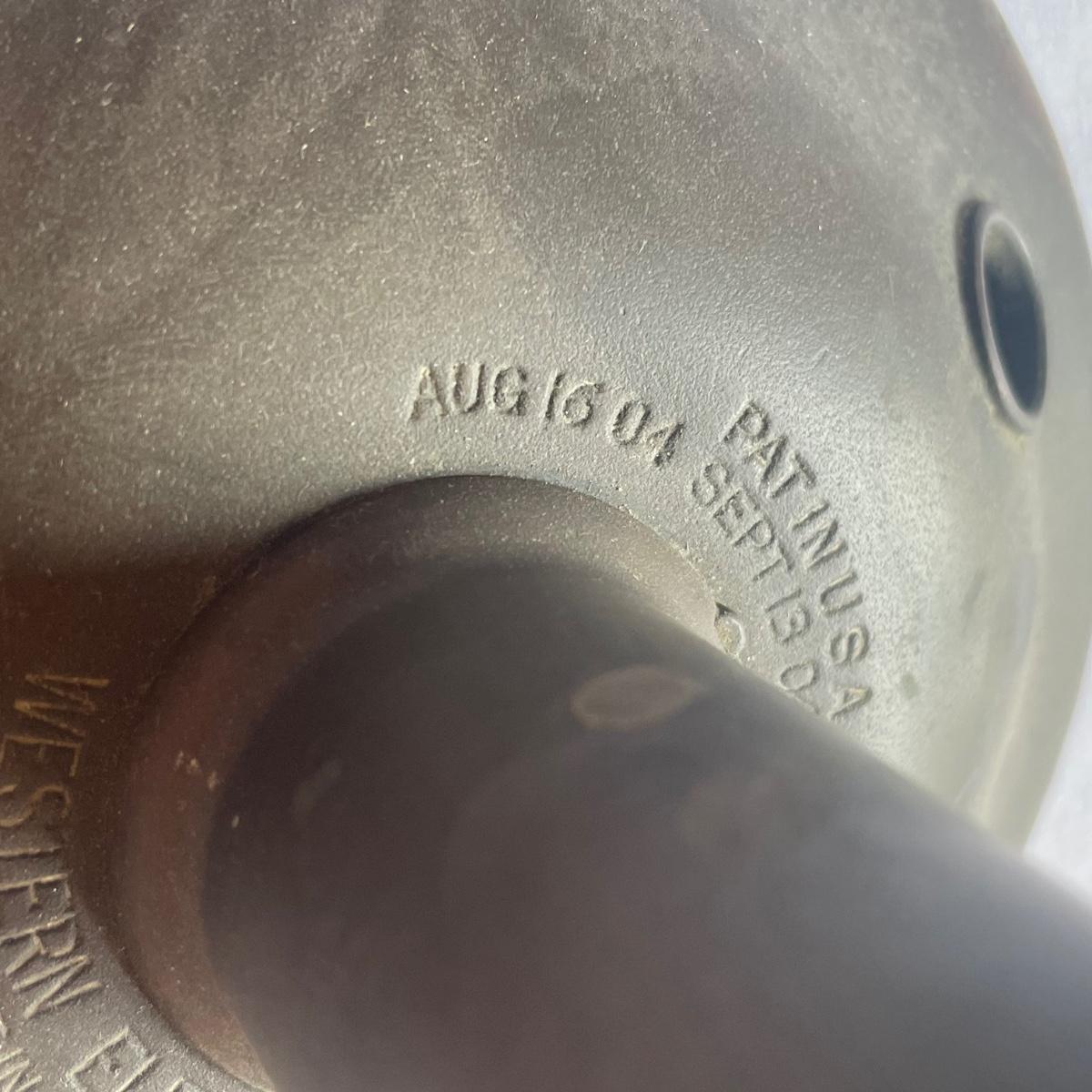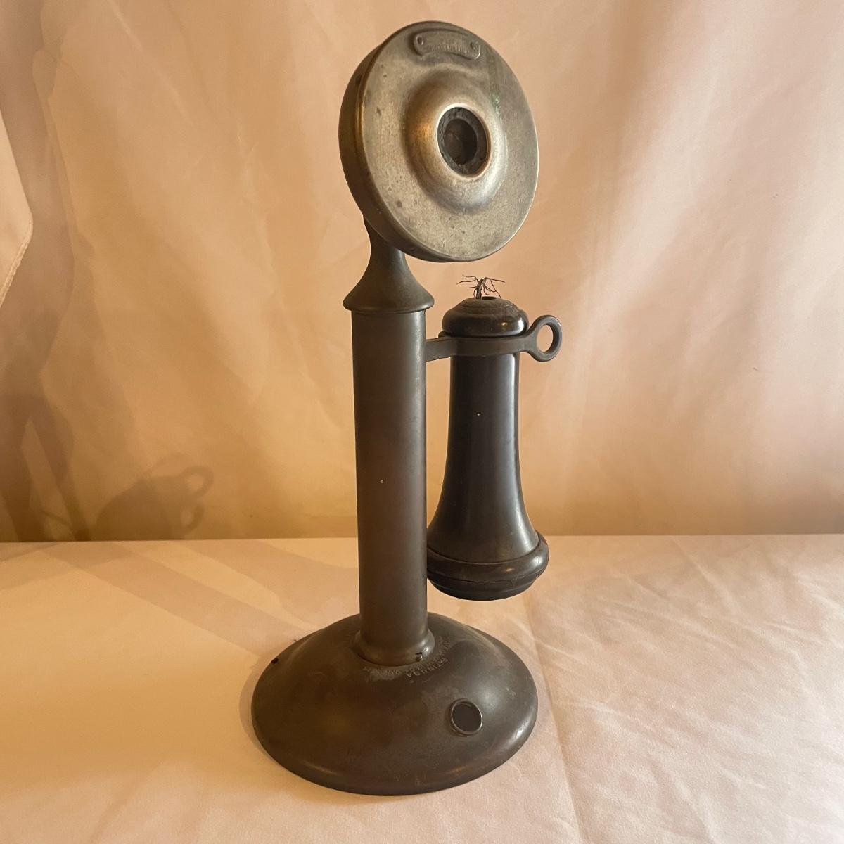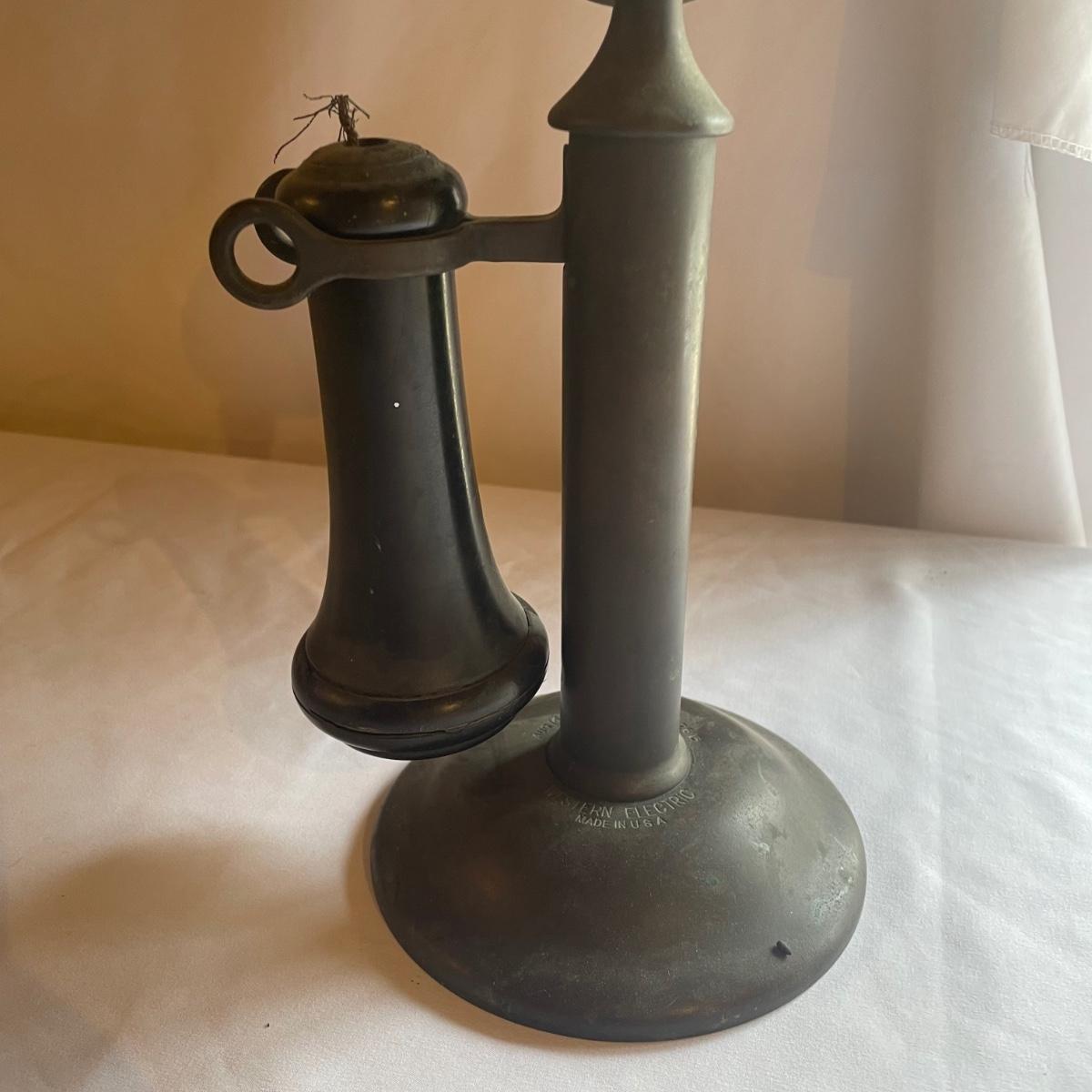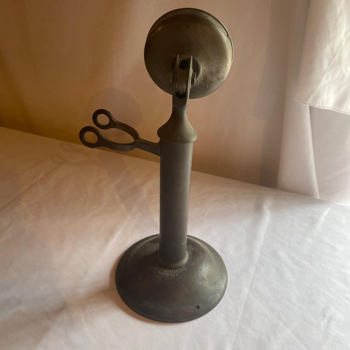Multiple dates are etched into this antique phone from Western Electric - Jan 26 15, Aug 16 04 and Sep 15 04. Note, phone cord is missing.
