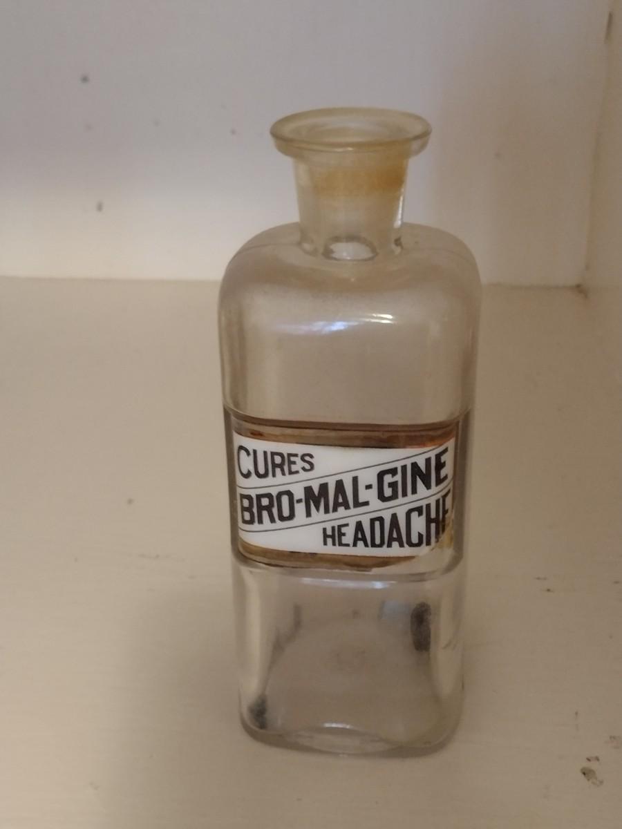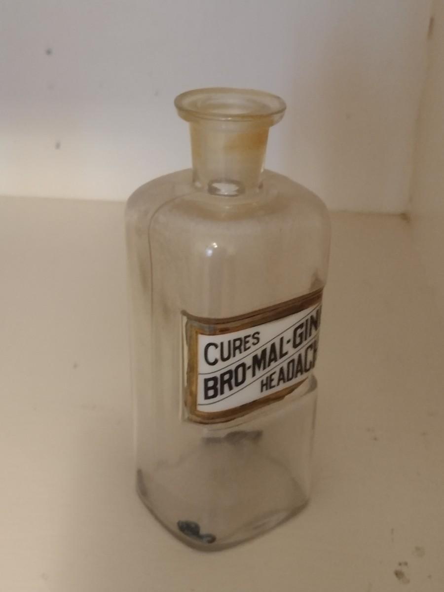 Antique Bro-Mai-Gine Cures Headaches Medicine Bottle with Label. See pictures for condition of label.
