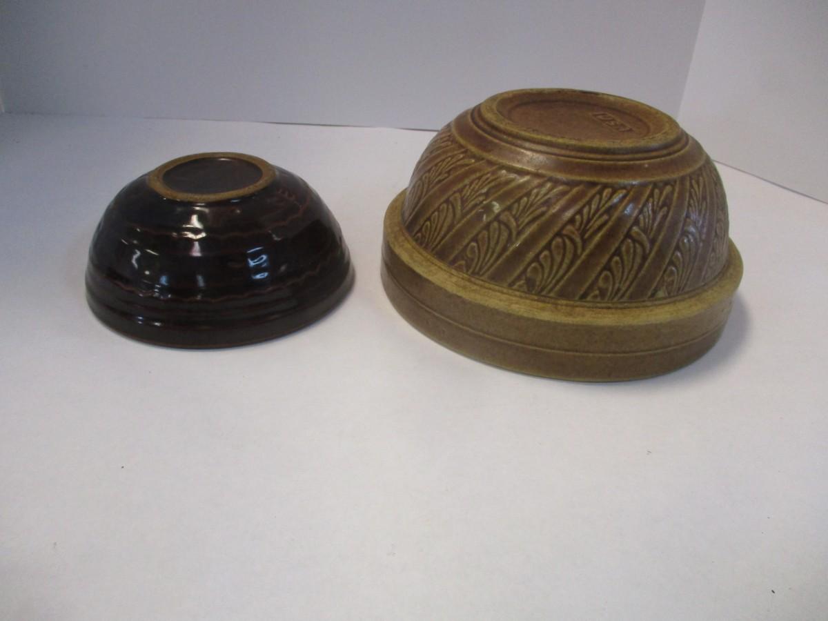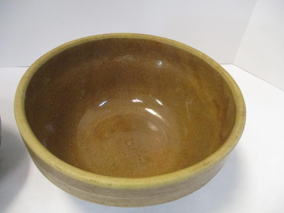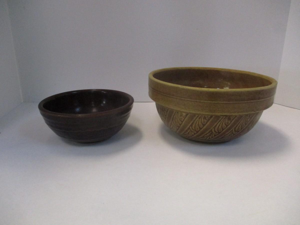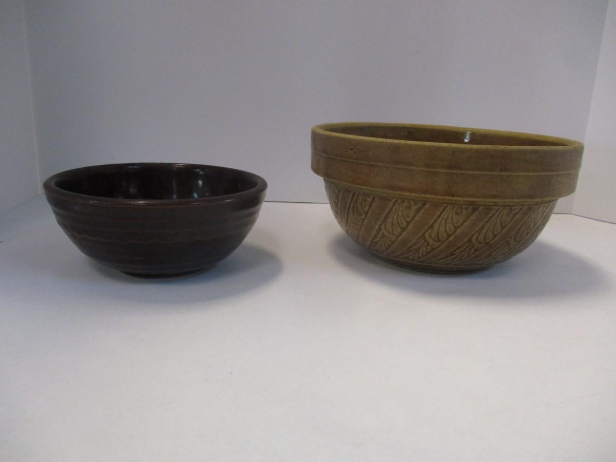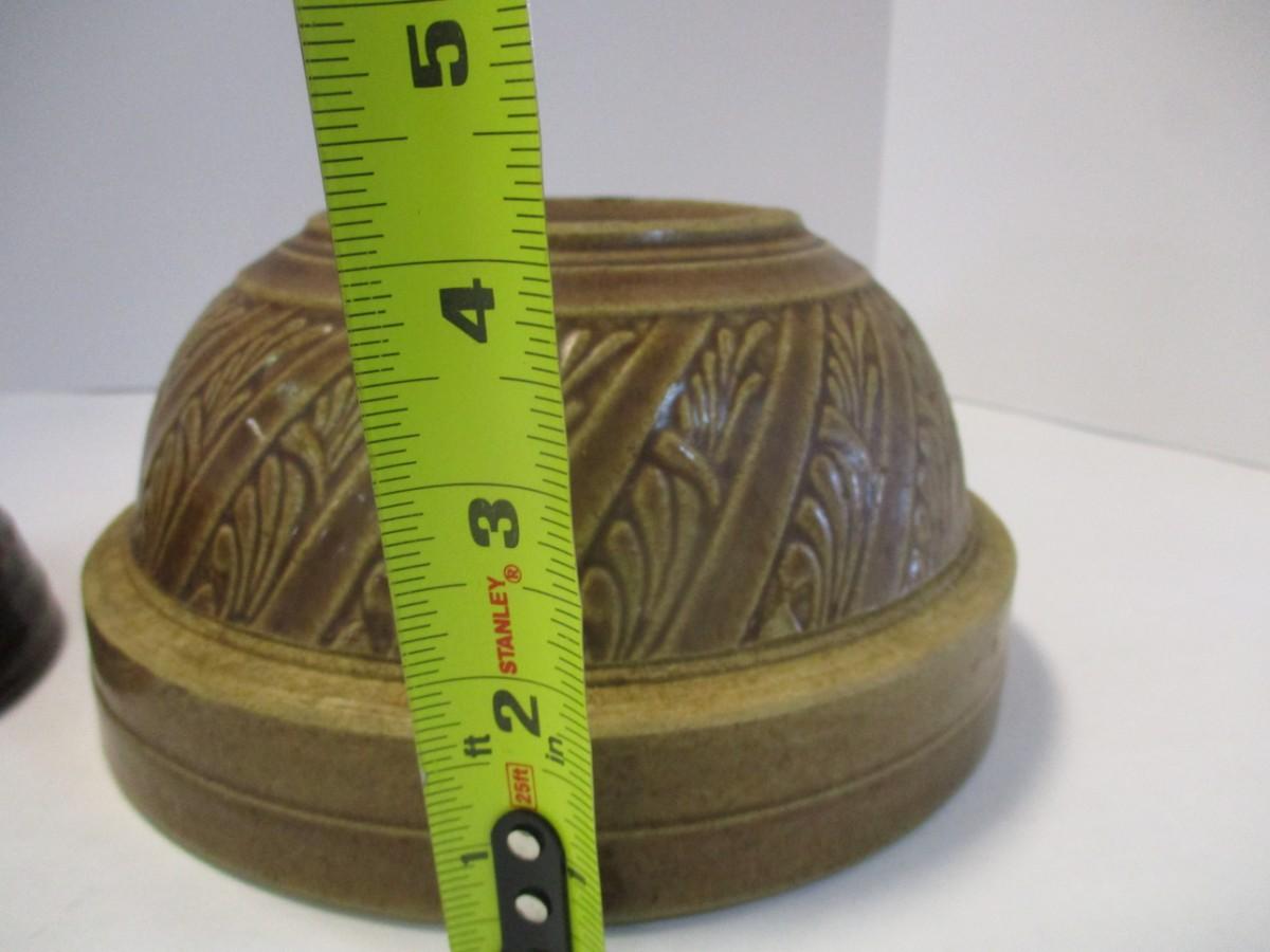 Antique Brown Embossed Stoneware Pottery Mixing Bowls Primitive Farmhouse Made In USA
