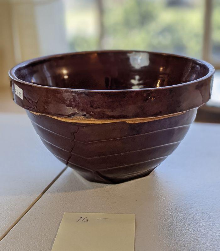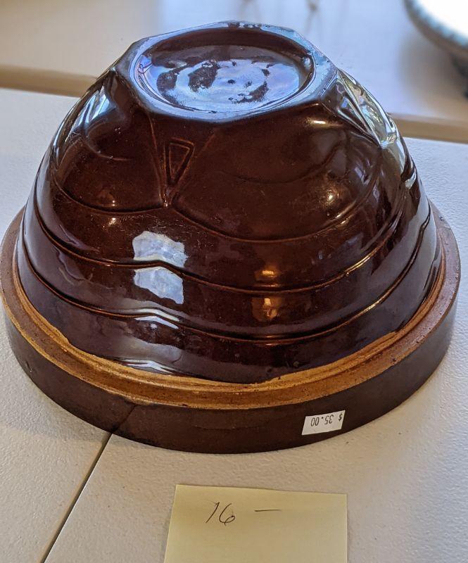 Antique brown glaze crockery bowl, scalloped banding (#16)