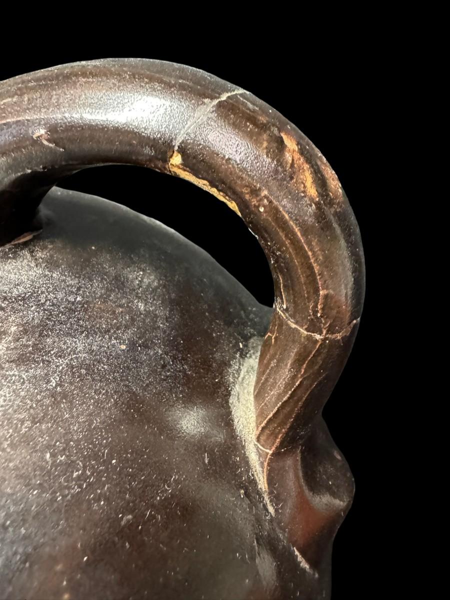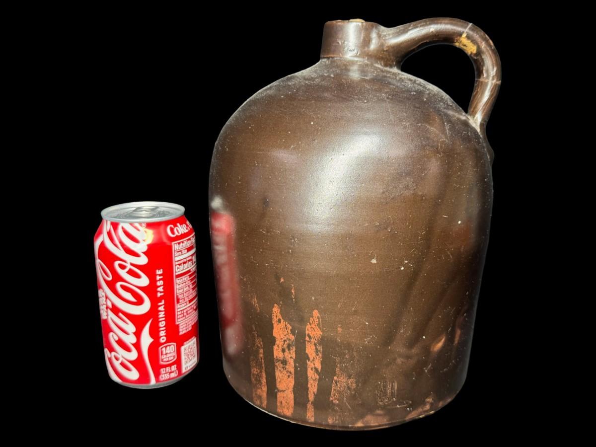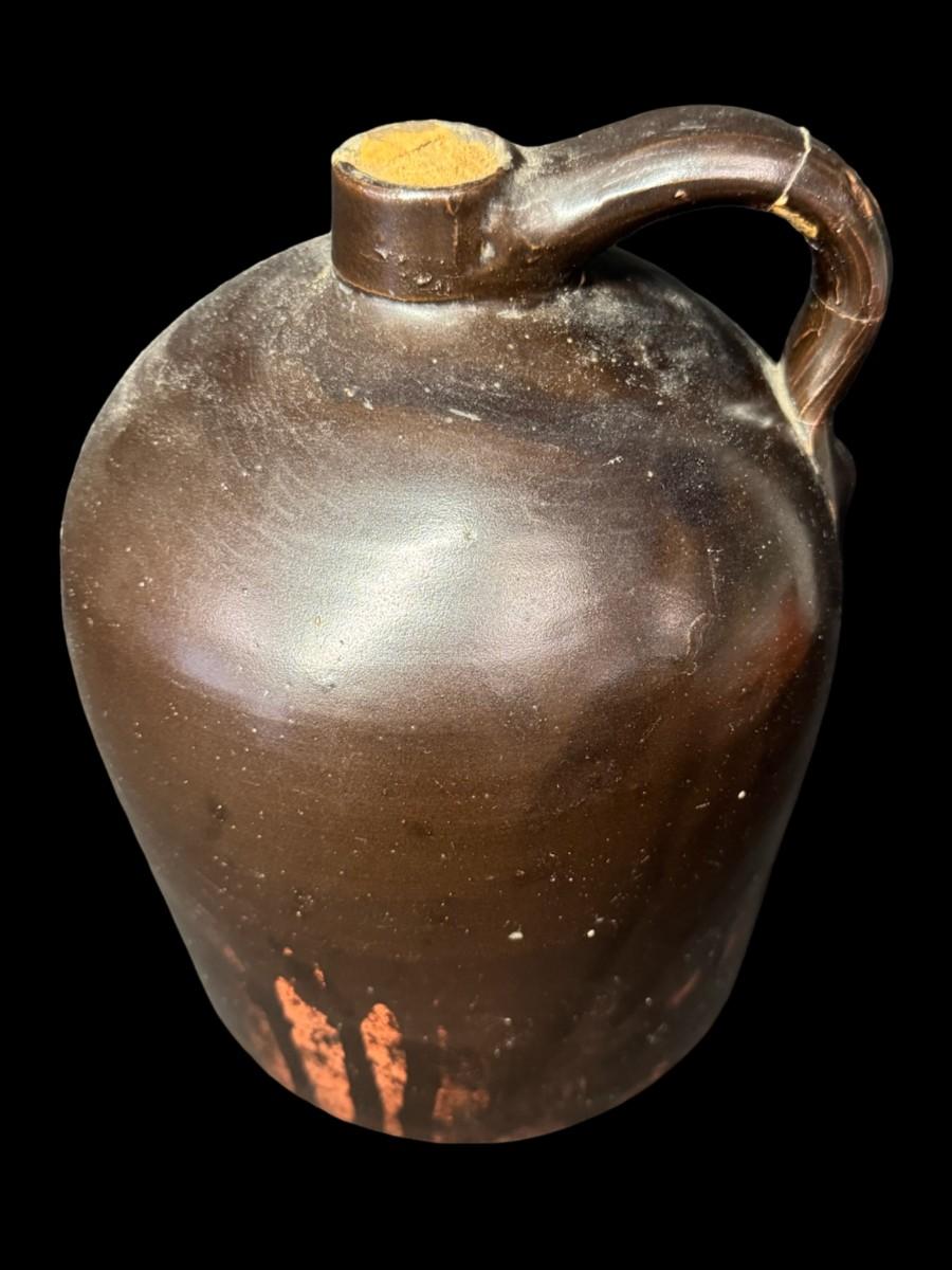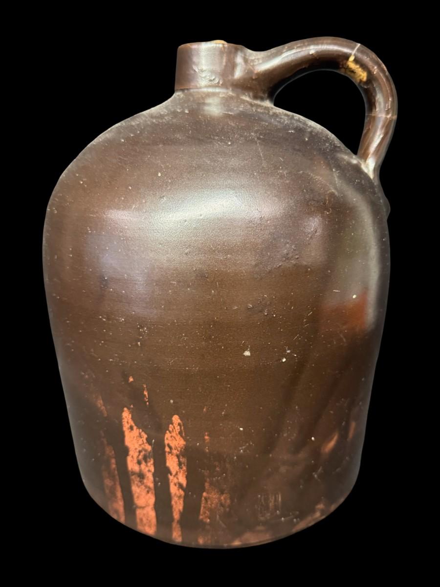This jug has a deep brown glaze. There is a chip on the base, and the handle has been repaired. There is general age related wear, including some surface scratches. Measurement; 10”H x 7”W. [SR]