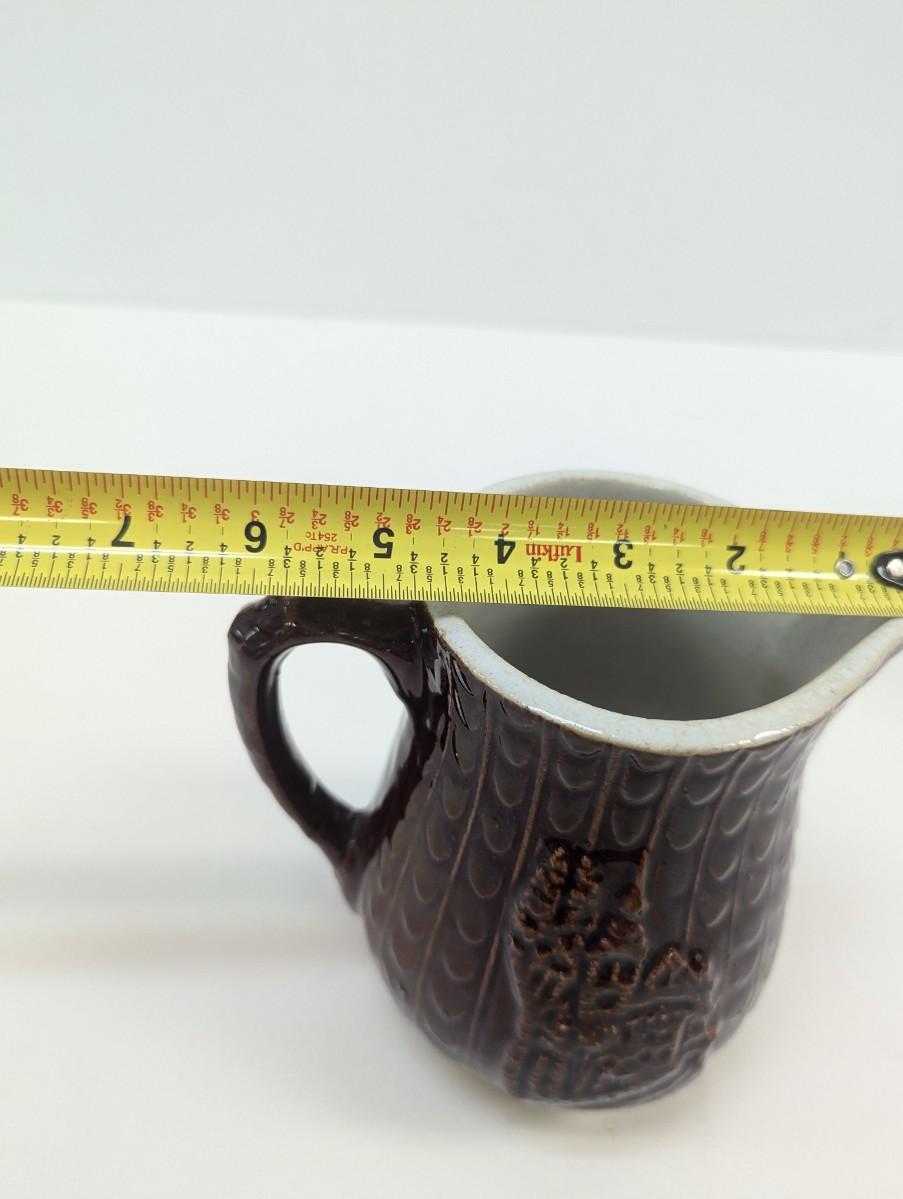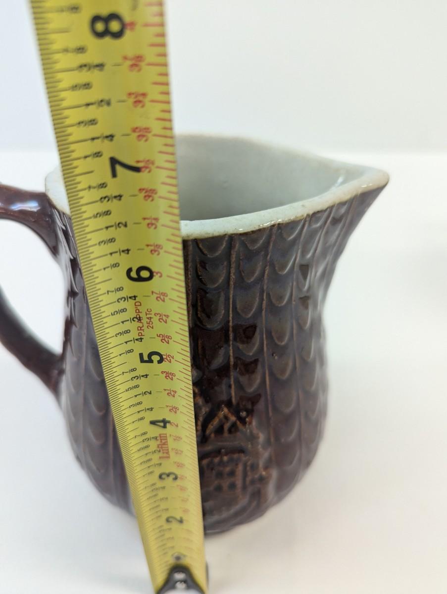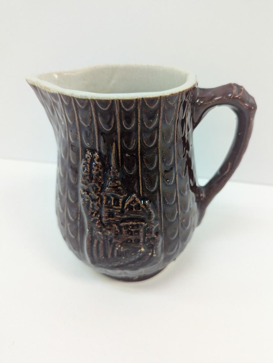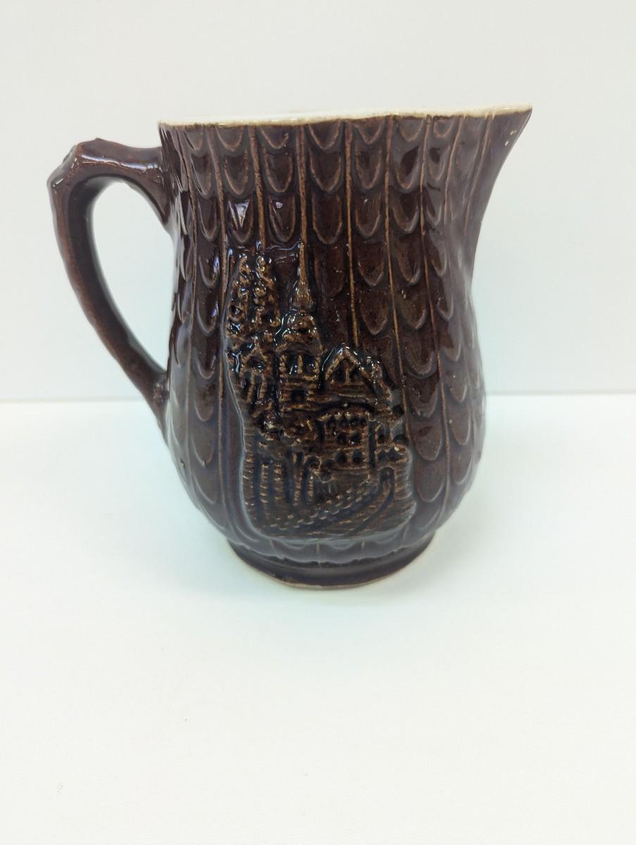 Antique Brown Stoneware Pitcher With Brown Glaze House Relief Pattern