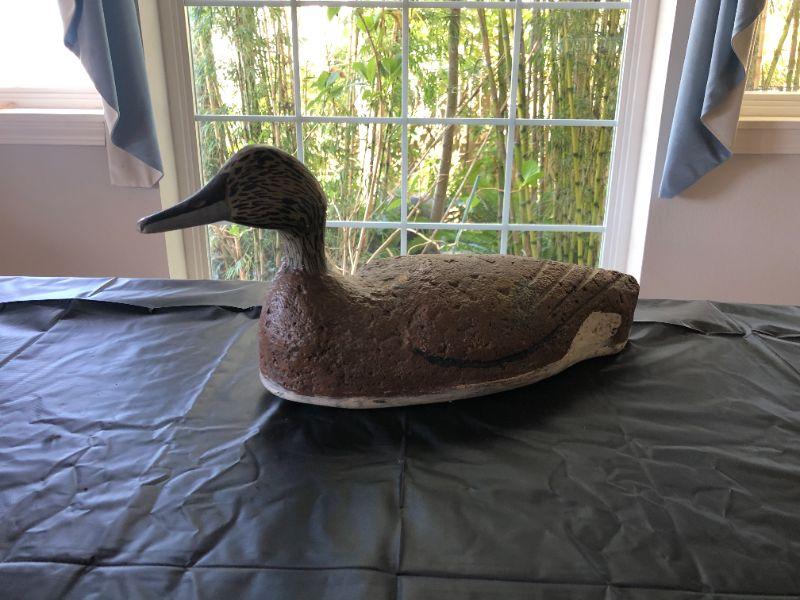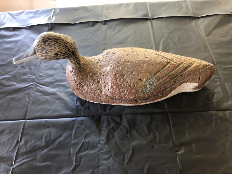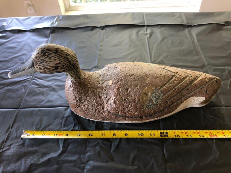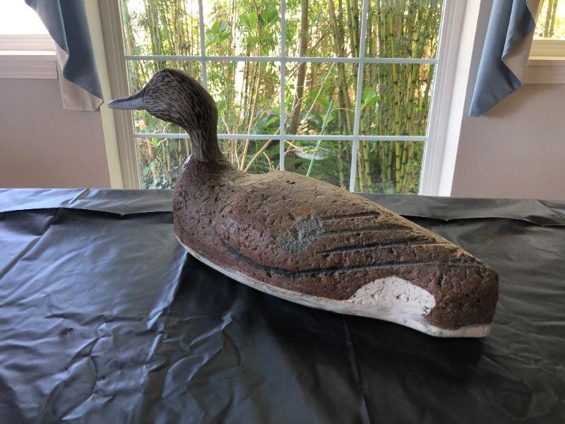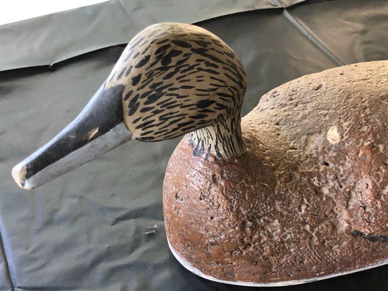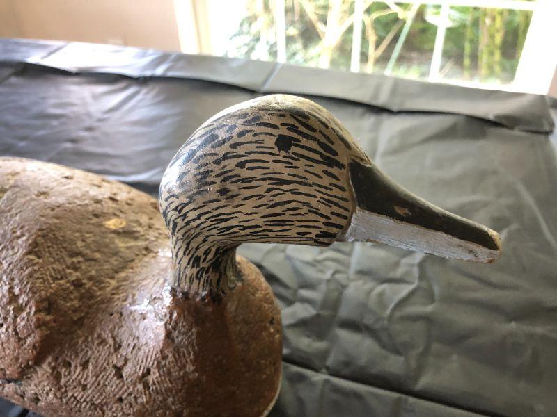 Antique wood decoy duck, brown in color, with painted and carved details. In good condition given the age, please review images carefully.