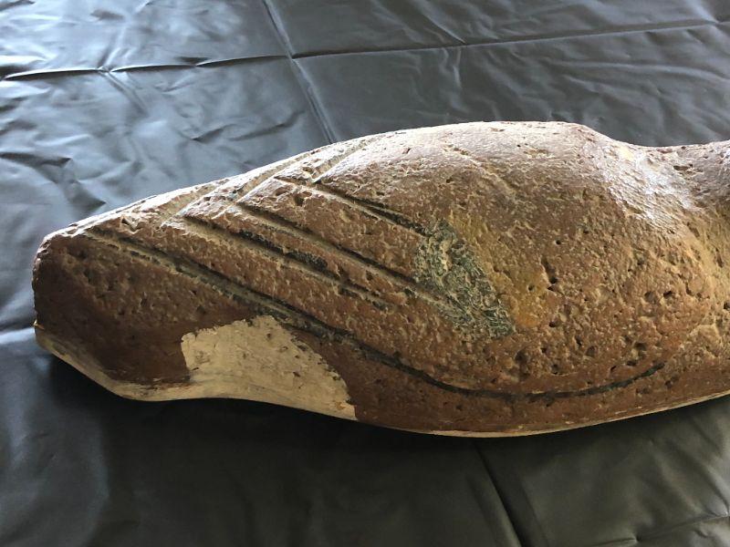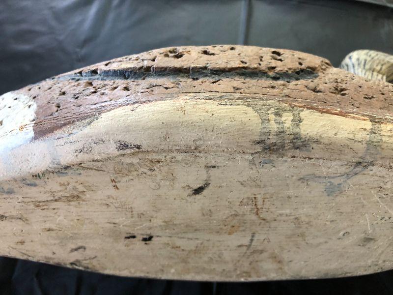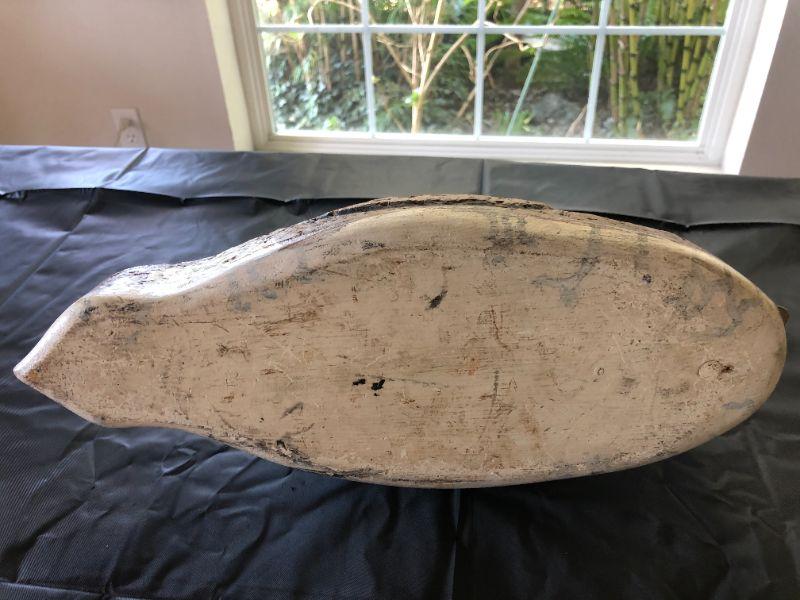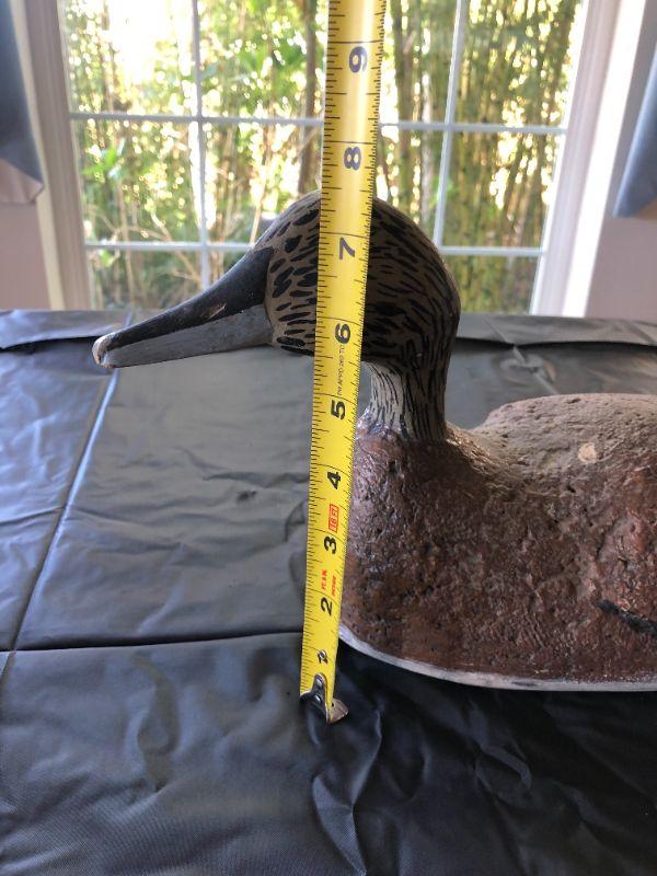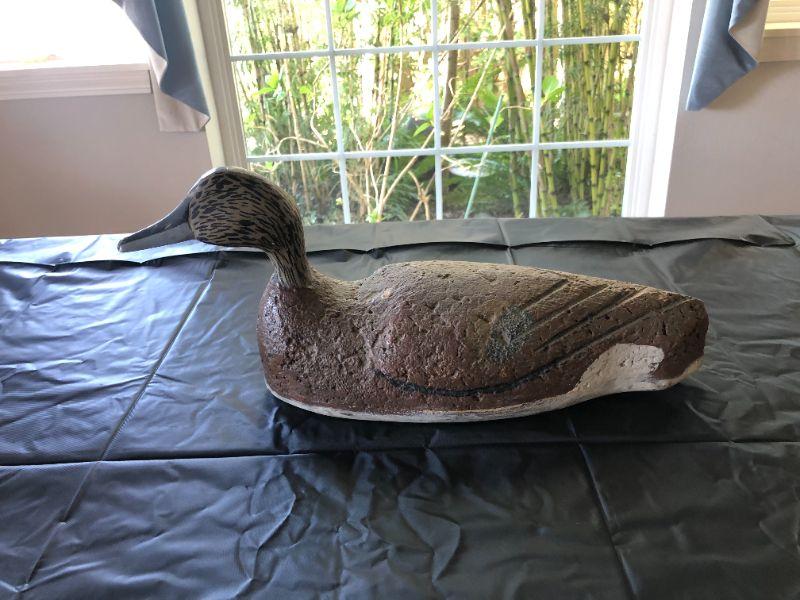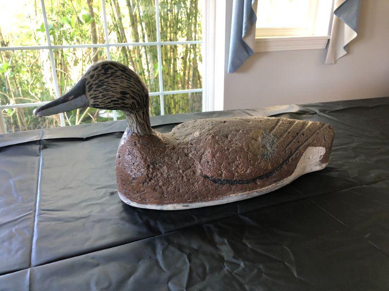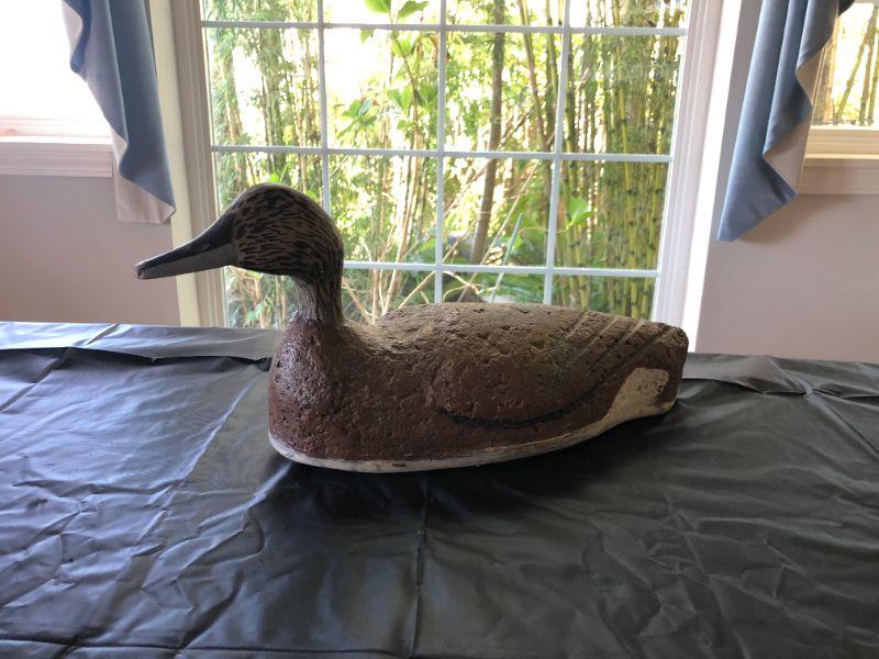 Antique wood decoy duck, brown in color, with painted and carved details. In good condition given the age, please review images carefully.