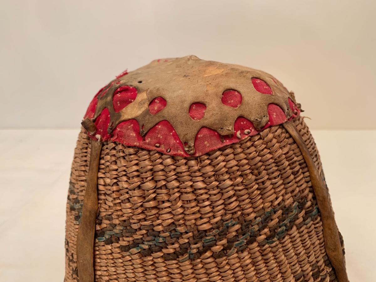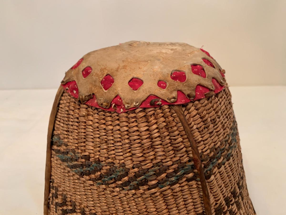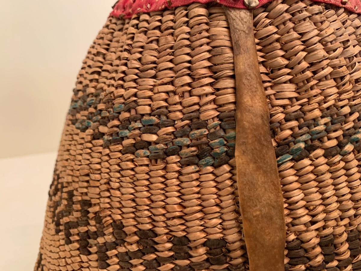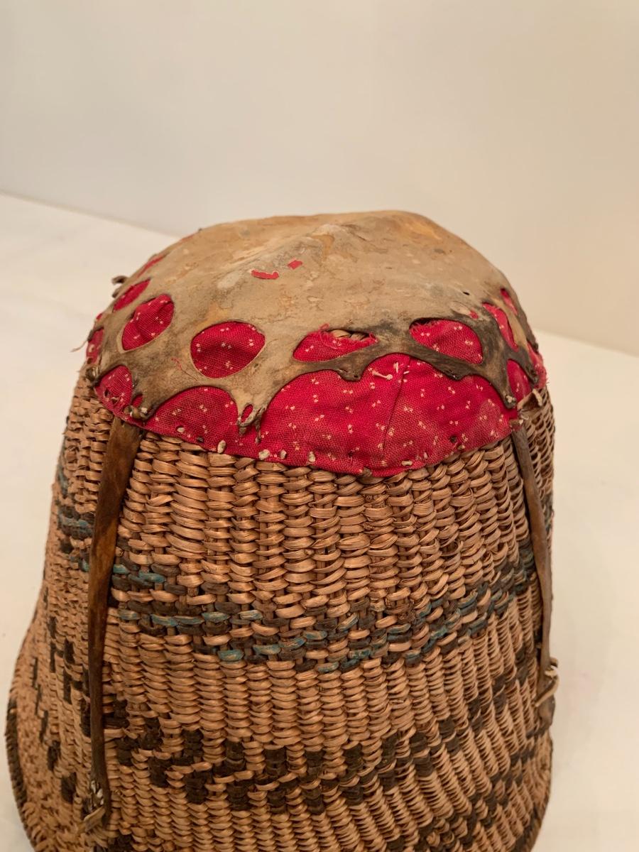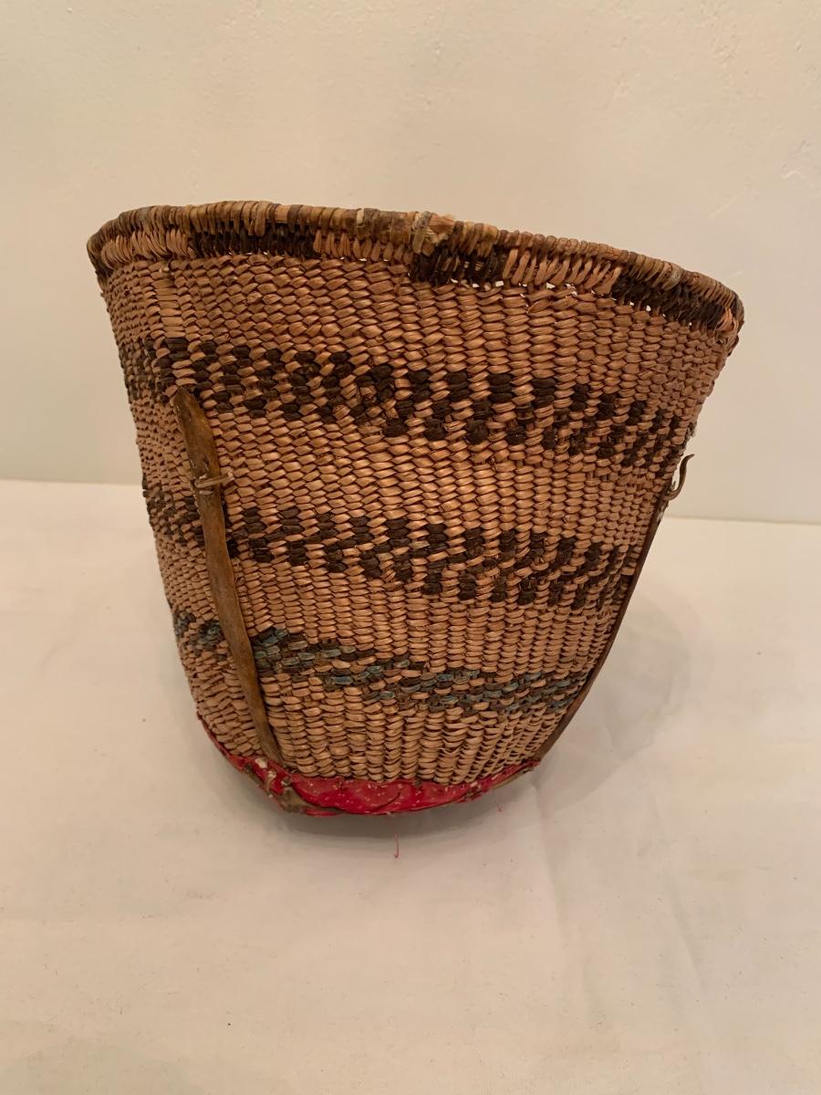 Antique Native American burden basket with leather short leather straps and bottom hide leather and red calico fabric curved bottom.