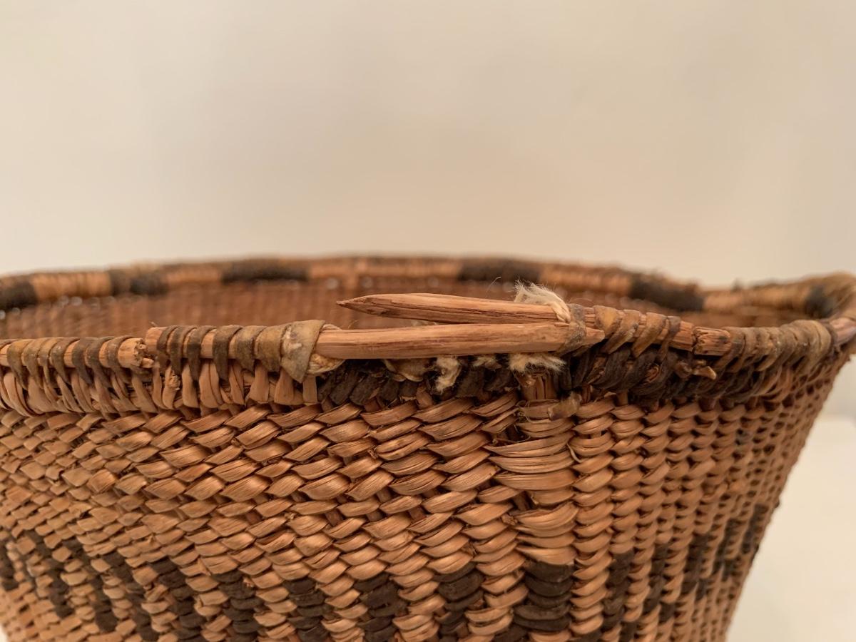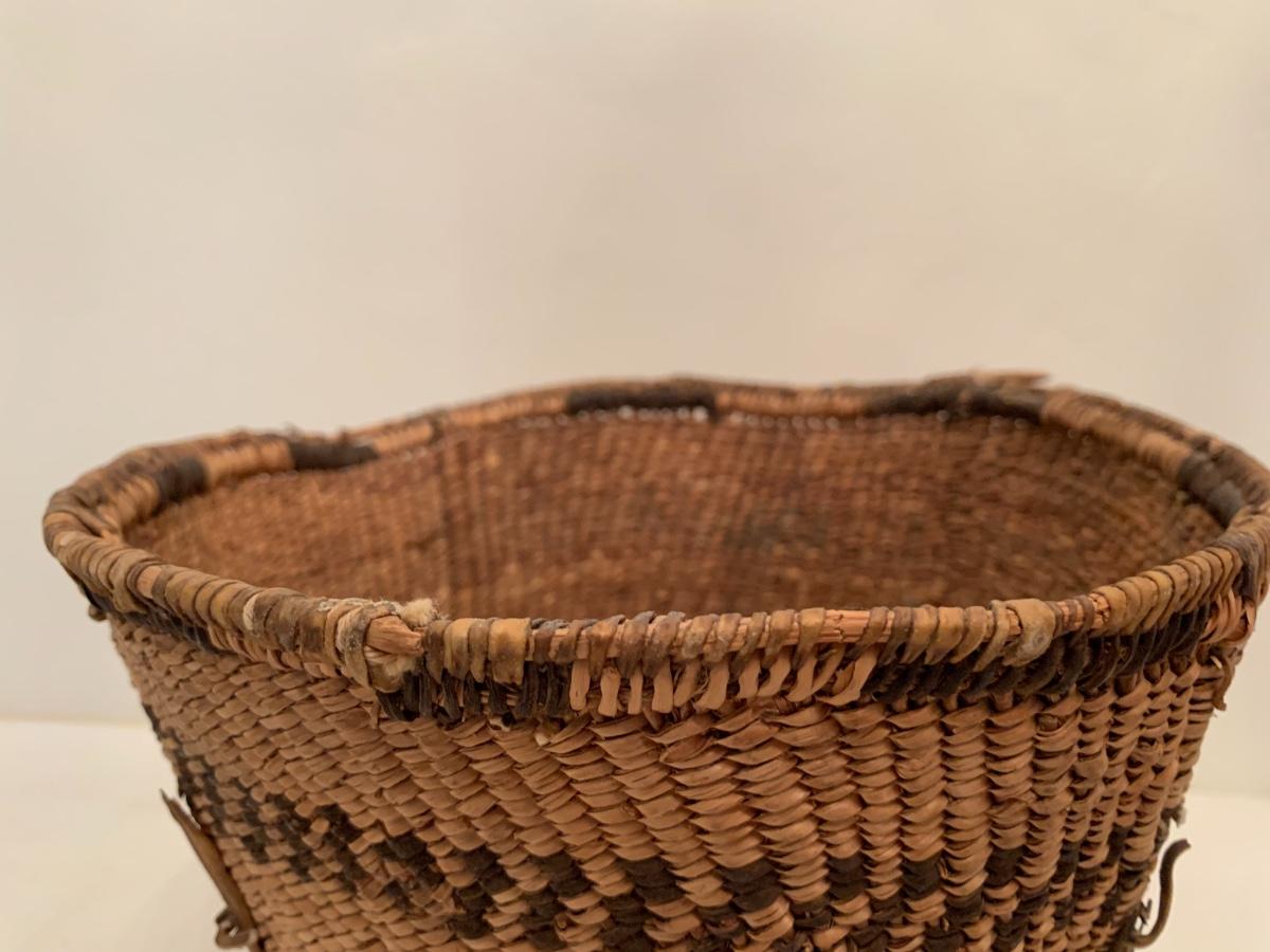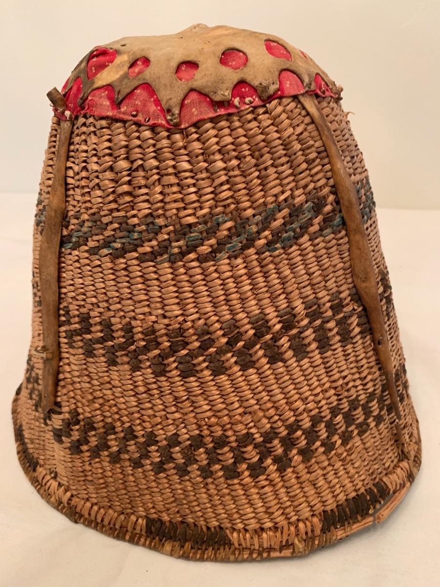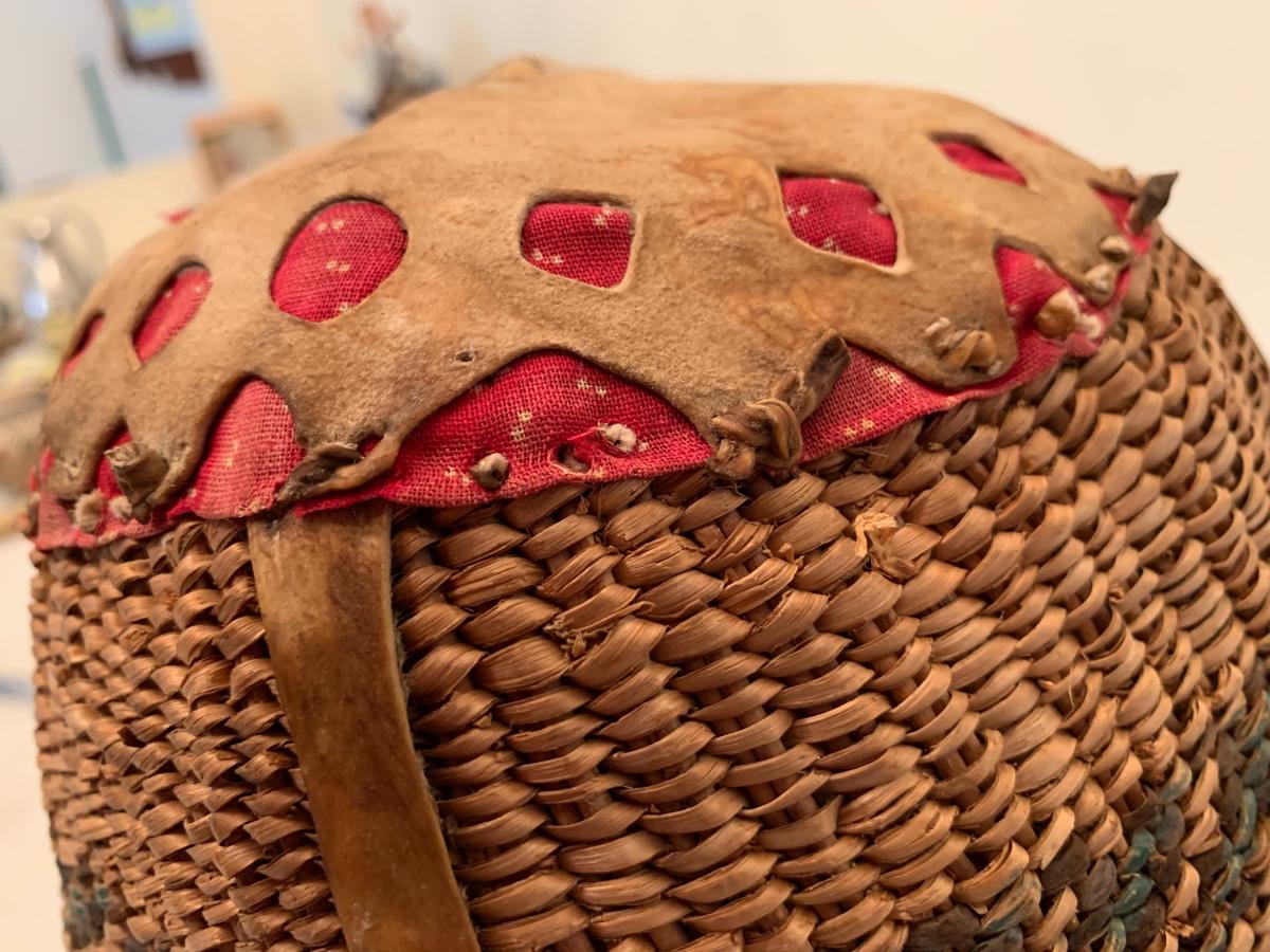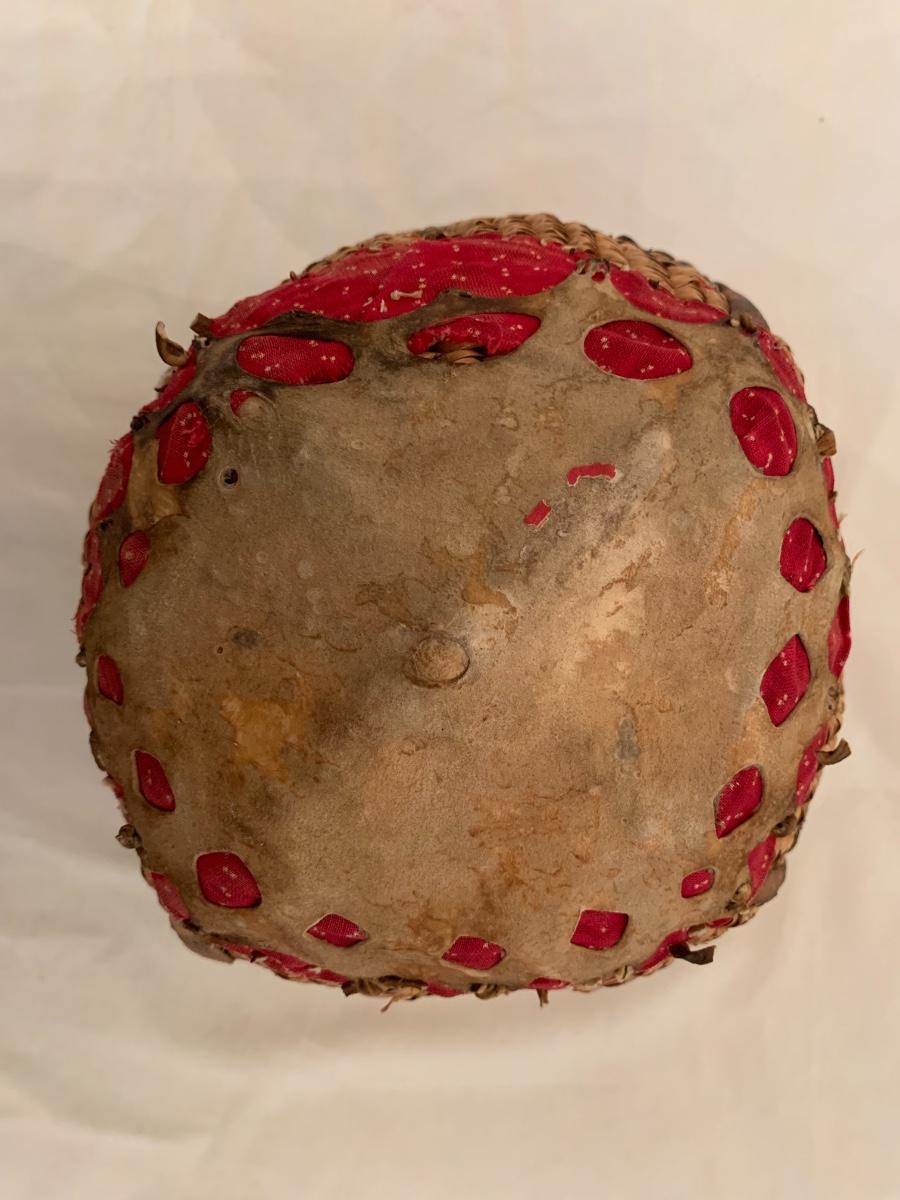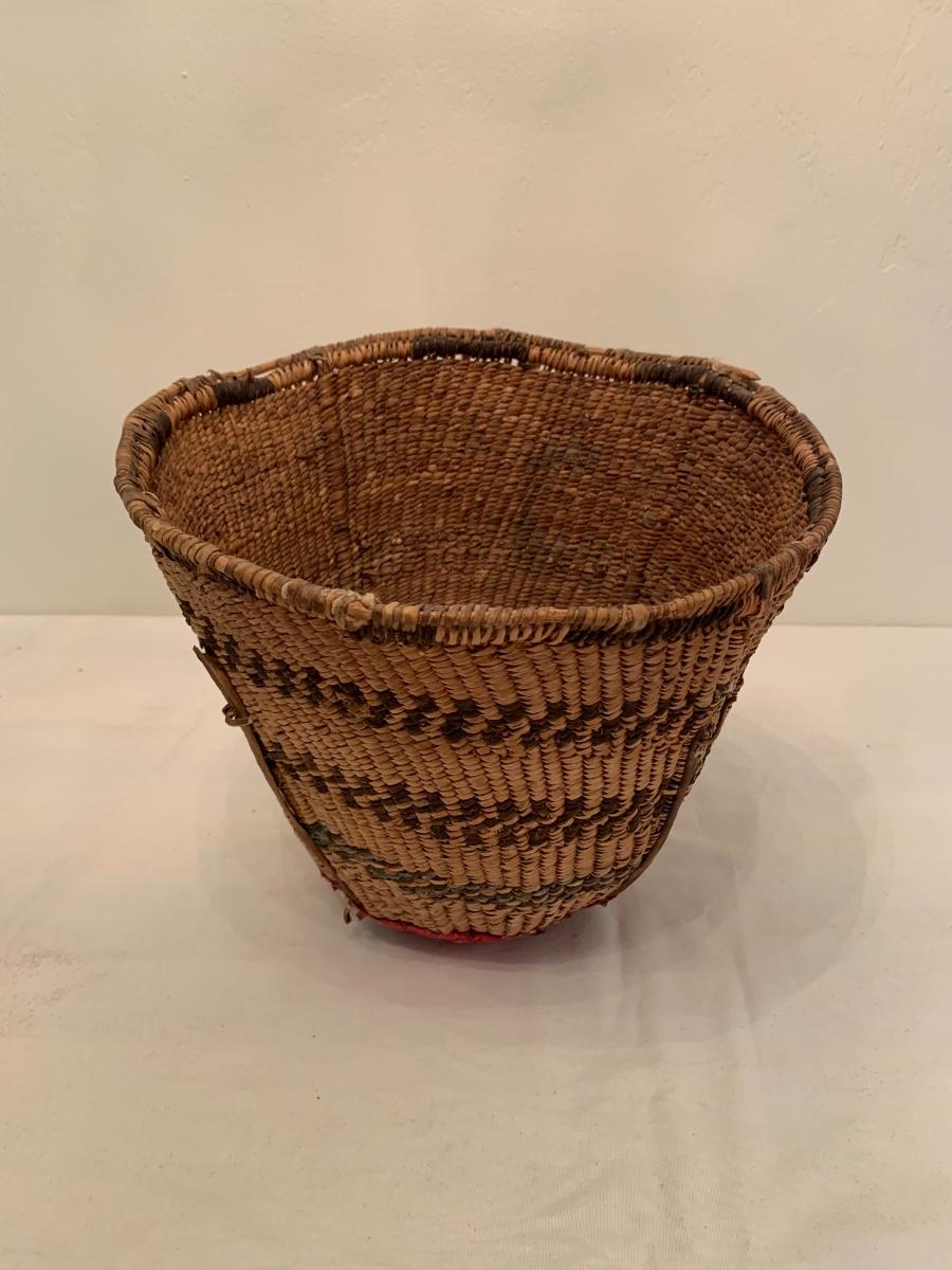 Antique Native American burden basket with leather short leather straps and bottom hide leather and red calico fabric curved bottom.