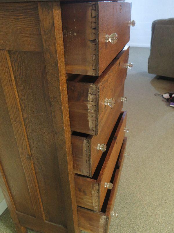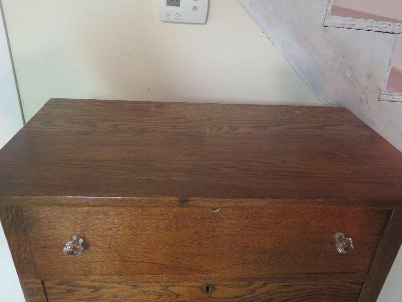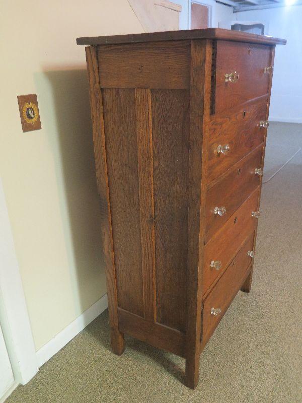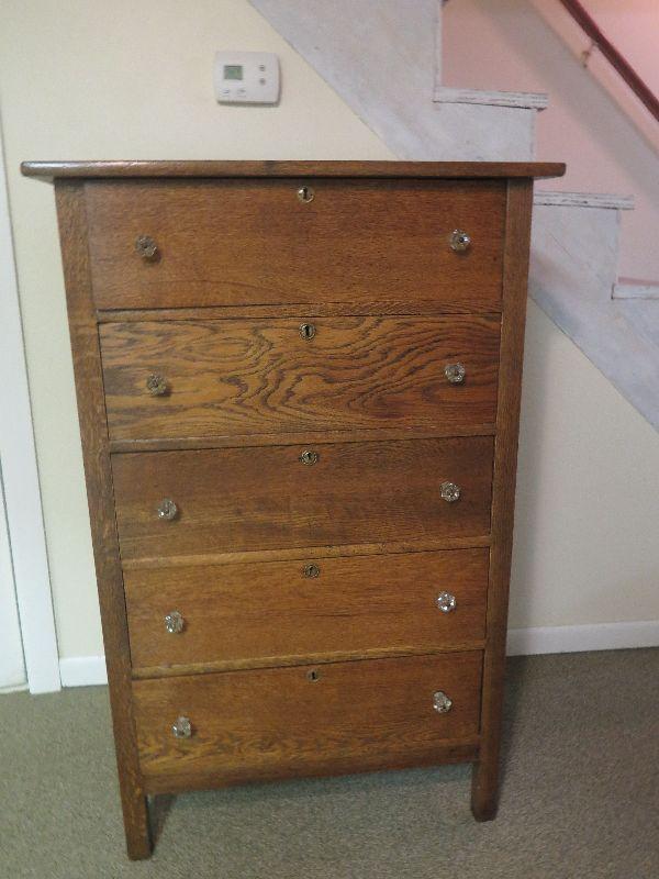 Solid wood bureau with crystal knobs. Five dove tail drawers. Heavy, bring help to move from basement.