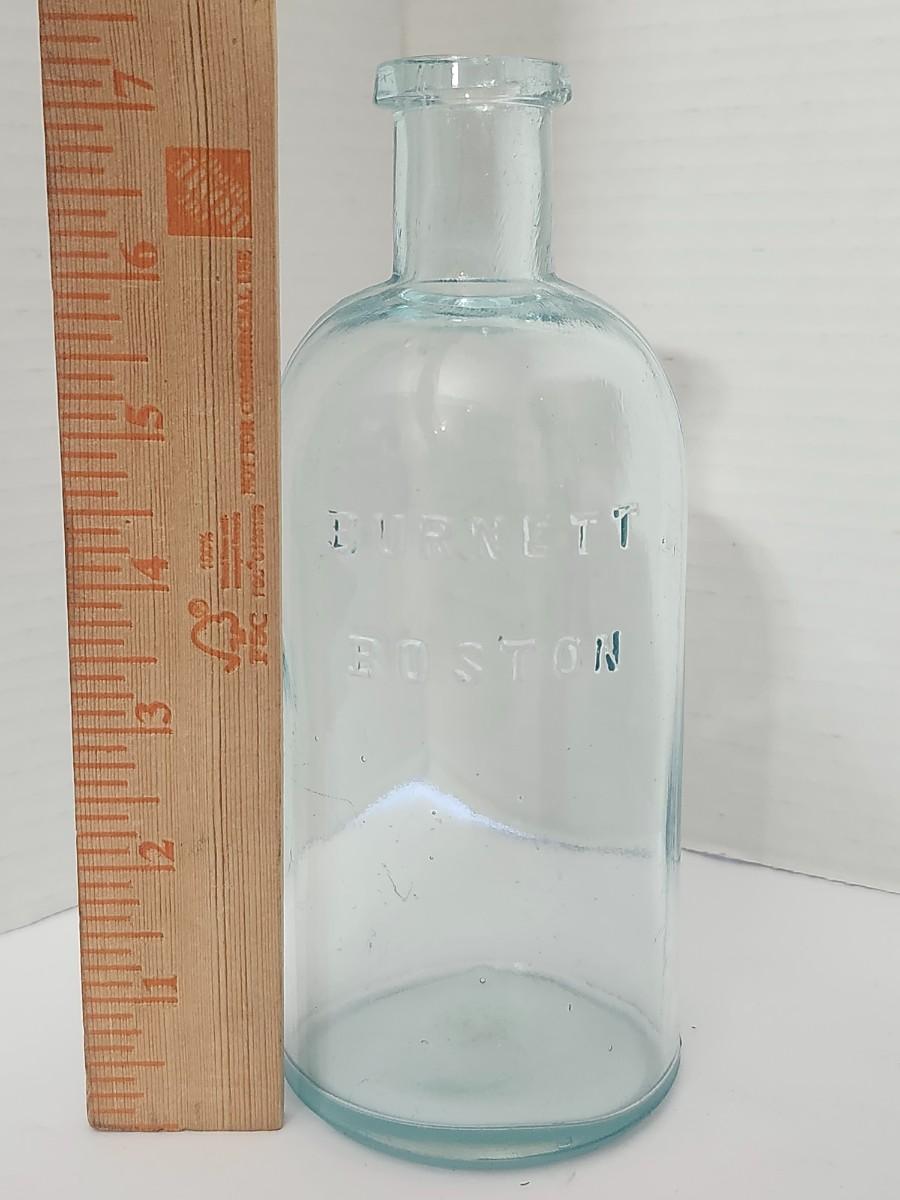 Clear aqua glass bottle embossed Burnett Boston on the front. Cylindrical body with rounded shoulders and applied lip, consistent with early American apothecary or pharmaceutical bottles. Likely associated with the Burnett name used by 19th century Boston druggists or manufacturers, produced for medicinal or chemical contents. Unmarked base, hand blown characteristics visible including bubbles and light waviness in the glass. A classic piece of antique American bottle history, well suited for collectors of apothecary bottles, early Boston glass, or primitive display. Ideal for shelf display, historic decor, or bottle collections.