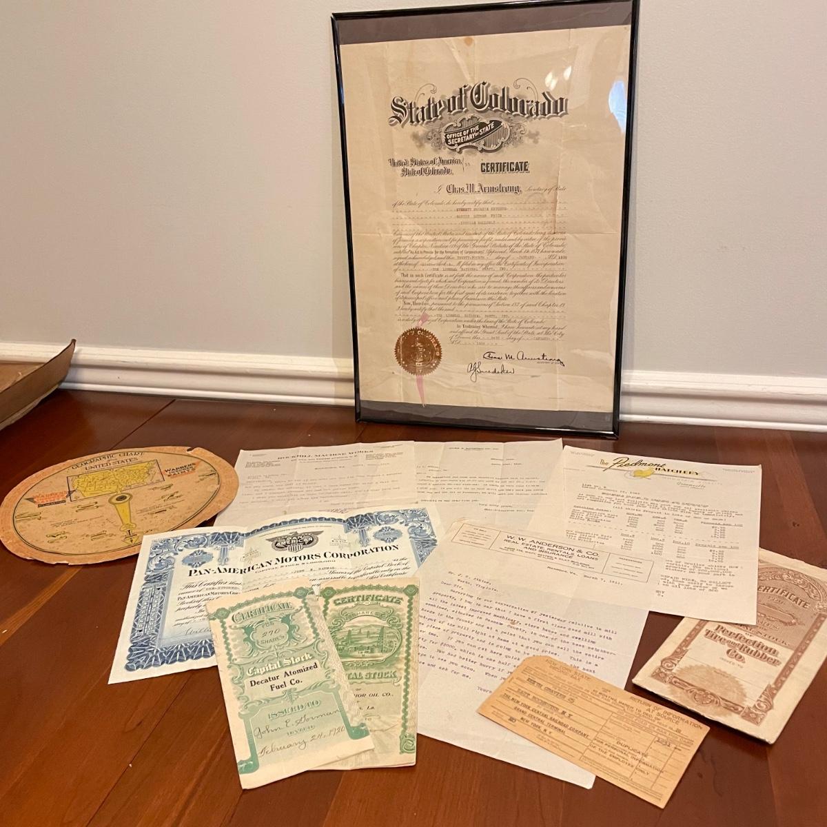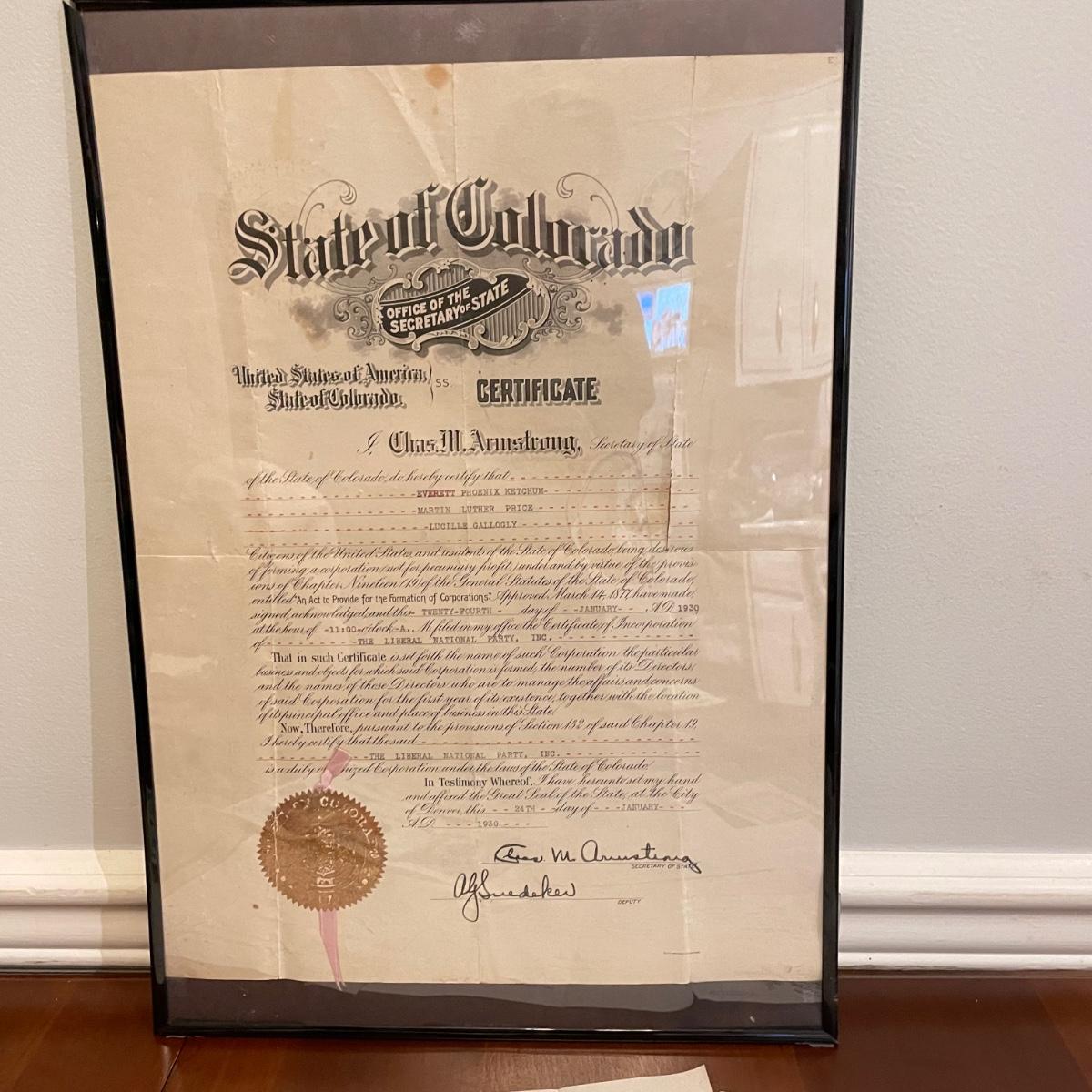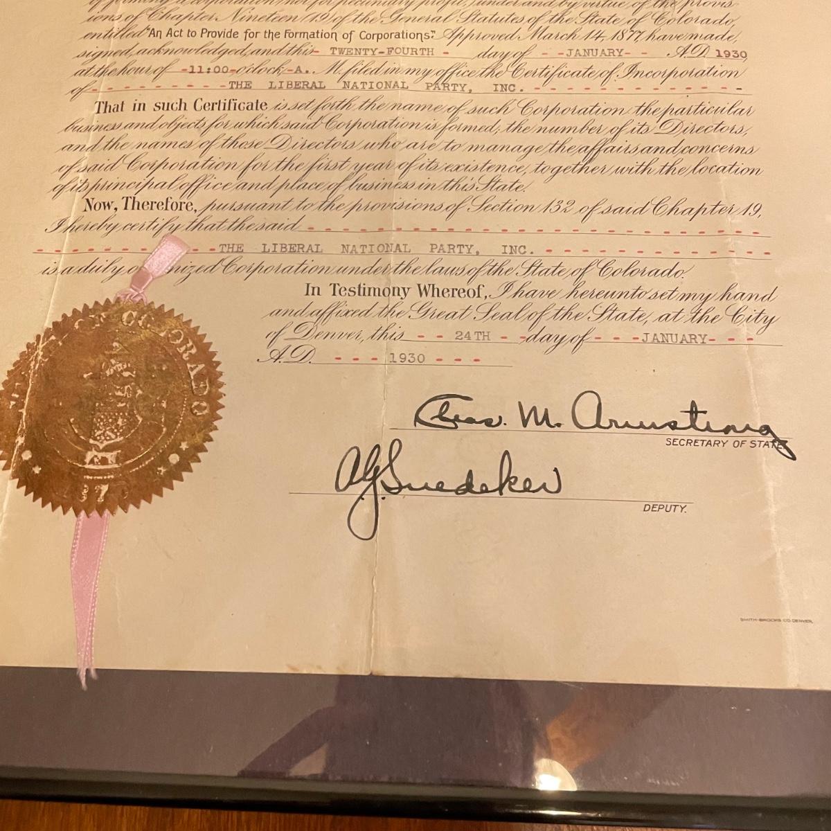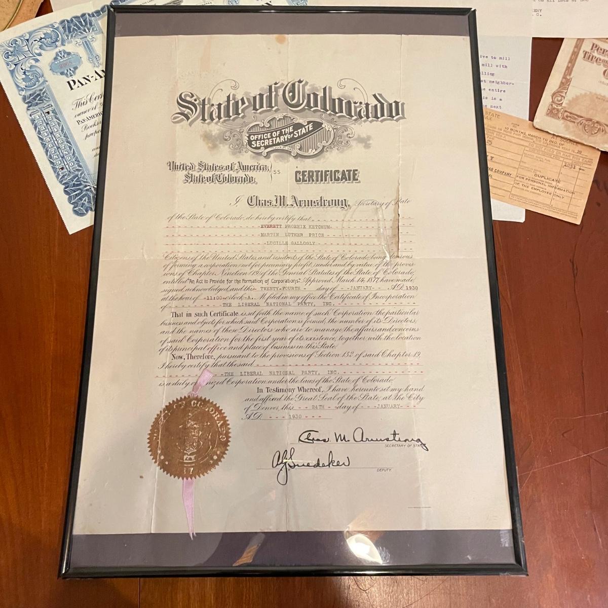 Framed State of Colorado corporation paperwork from 1919 for a corporation called "The Liberal National Party Inc" The frame and panel are plastic. Four stamped stock certificate documents. Lot includes a few other fun vintage business items. See images. Shipping available. Circular sign in group photo is not in this lot.
