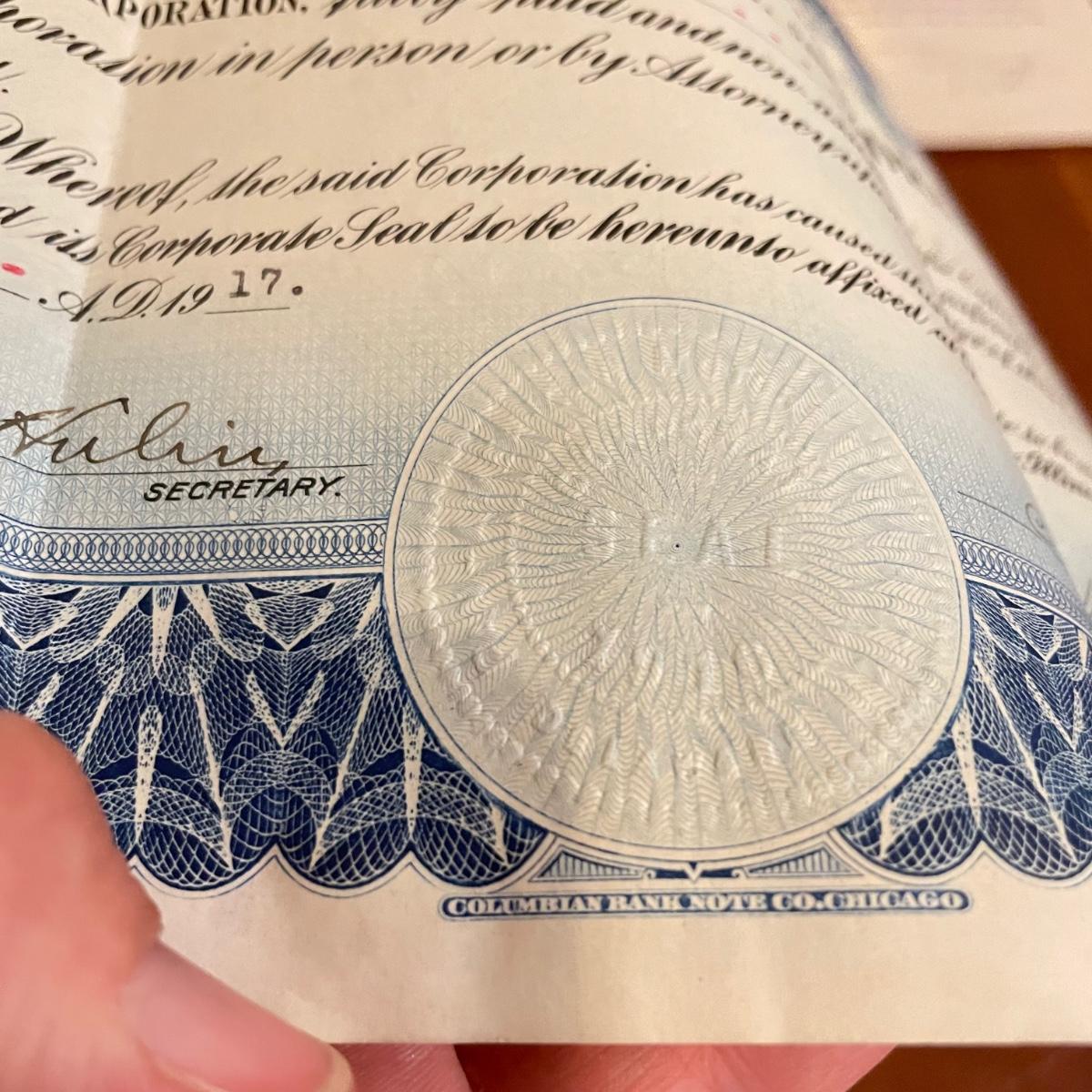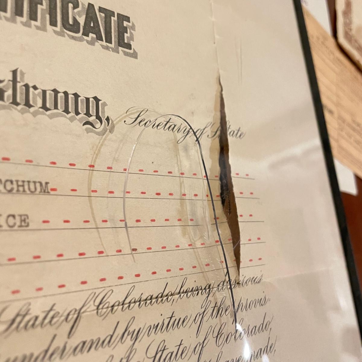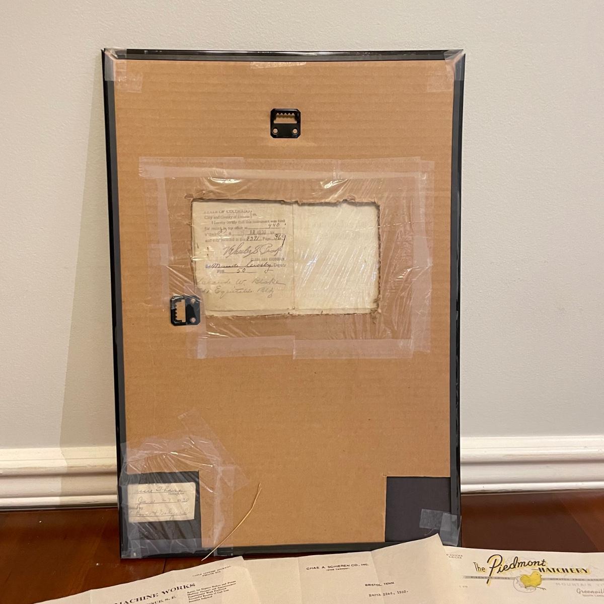 Framed State of Colorado corporation paperwork from 1919 for a corporation called "The Liberal National Party Inc" The frame and panel are plastic. Four stamped stock certificate documents. Lot includes a few other fun vintage business items. See images. Shipping available. Circular sign in group photo is not in this lot.