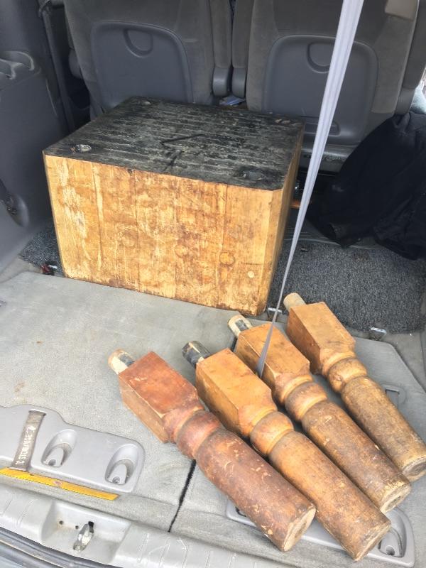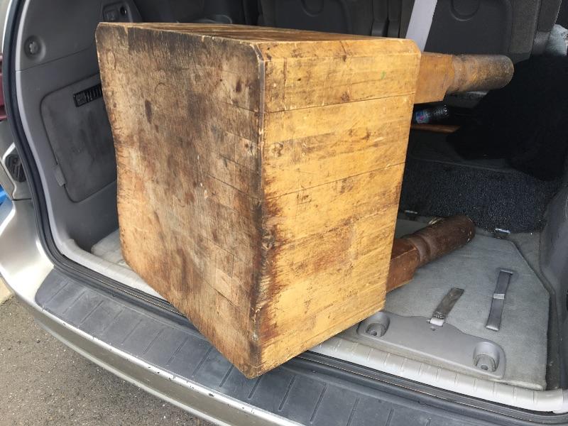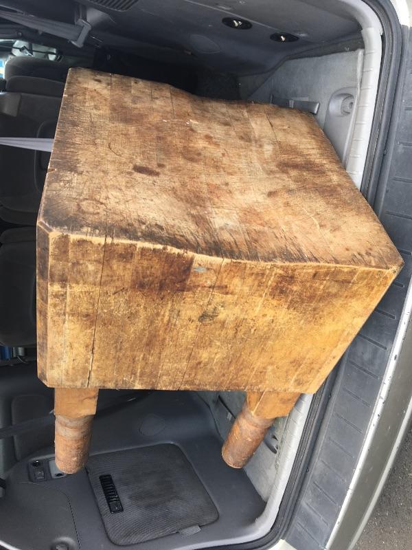 Massive primitive butcher block table. All original and ready for a good home! Measures 24”w x 24”d x 33”h. Curb delivery available for a charge, within 50 miles of Haddon Heights, NJ. You will have to unload it and bring it inside. Very heavy and rare!