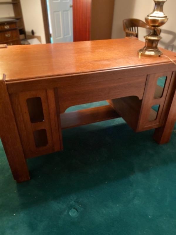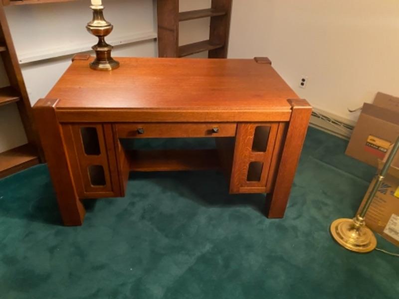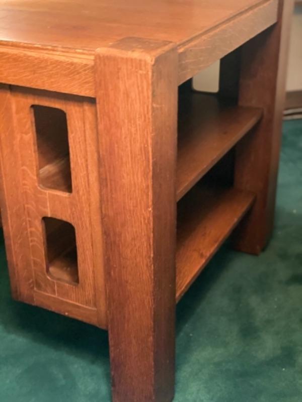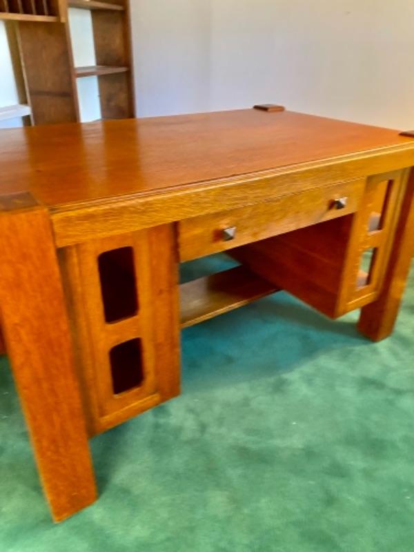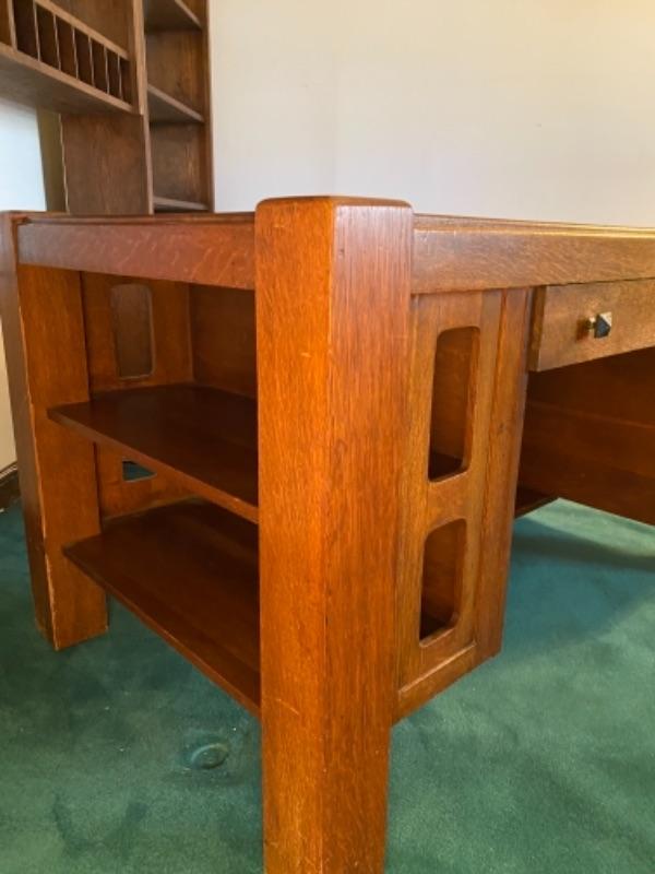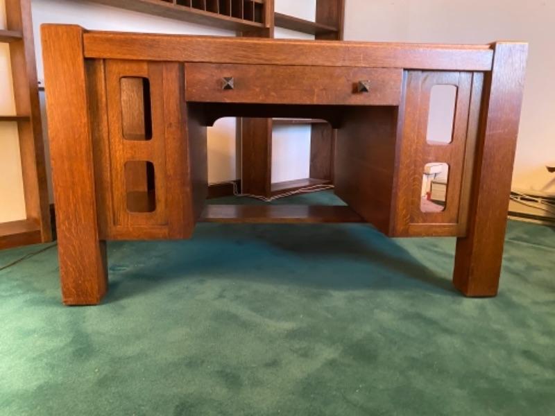 Beautiful old arts and crafts quarter sawn oak desk w side bookshelves, featuring raised dowels, dovetail construction.