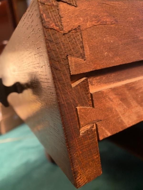 Fabulous patina , wear as per age. There is one bottom rear leg notched cut so could fit into clients space, not noticeable. Drawer knobs apparently replaced at some point.