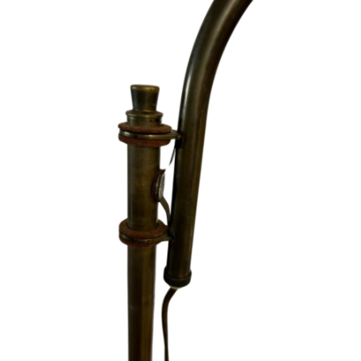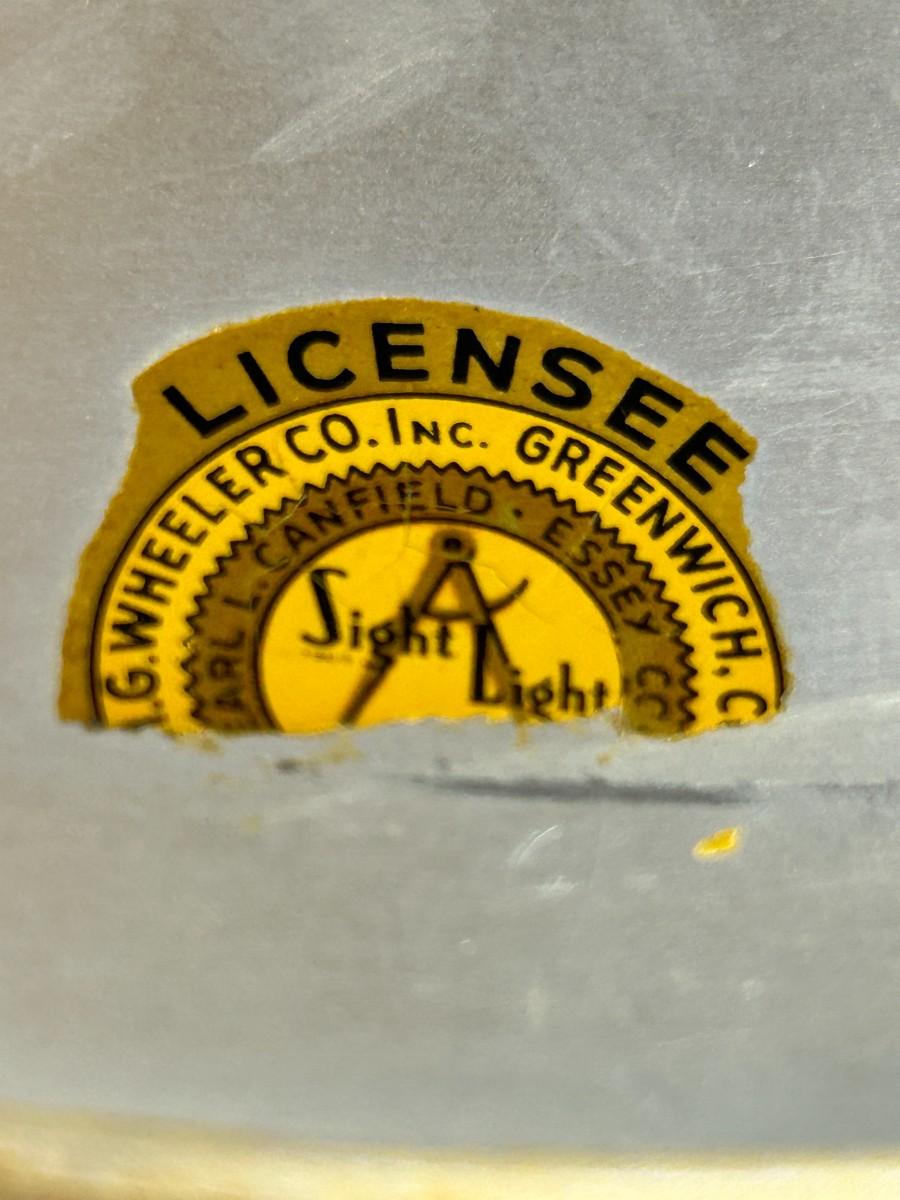Melville G. “M.G.” Wheeler, based in Connecticut, initially designed and produced the “Sight Light” table lamp in the 1940s by M.G. Wheeler Co. It is believed these lamps were initially made for submarines. The swivel lamp is made of brass and spun steel. The floor lamps came into production in the same decade.