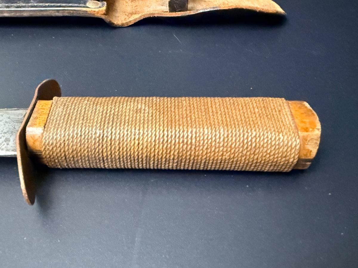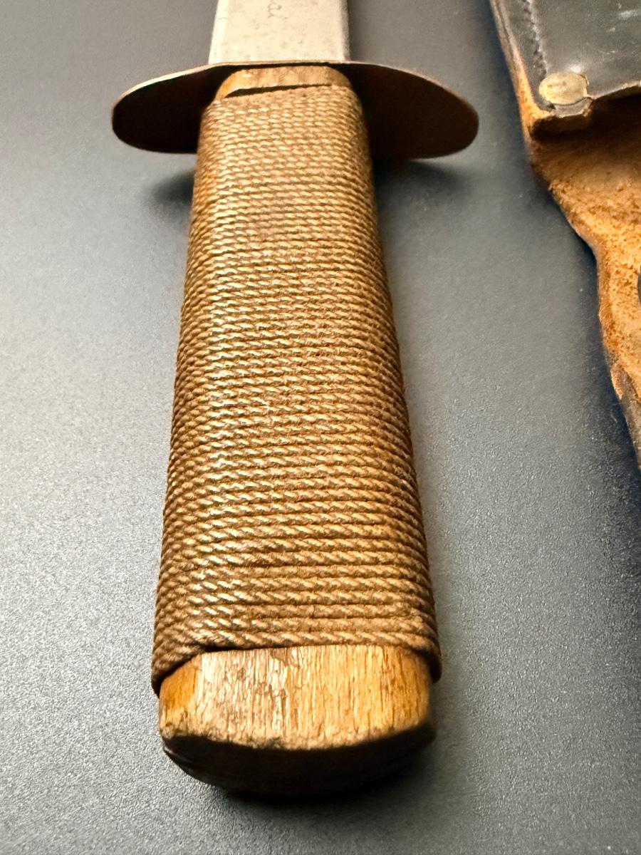 Nice Wood, rope/cord and copper handle to this Russell Green Riverworks 'Professional' knife with original leather sheath stamped 7. High carbon steel blade - see images for size.