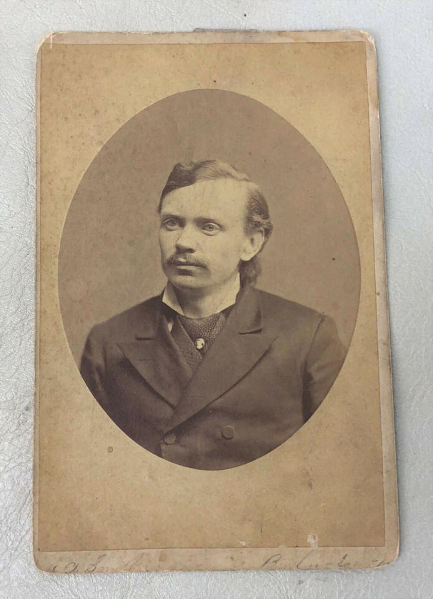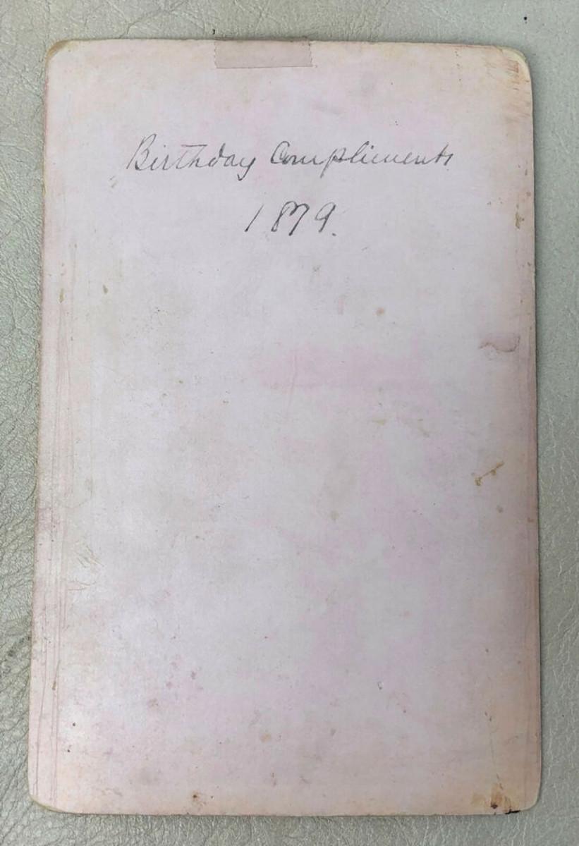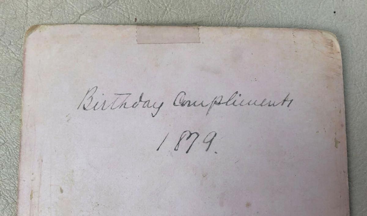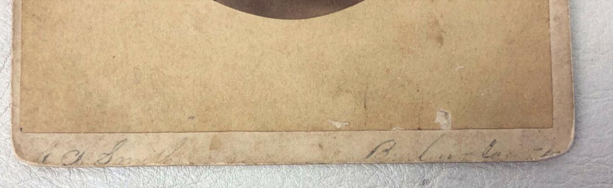 Easy to date this antique image with "Birthday Compliments 1879" written on back of this 6.5 x 4.25" cabinet card photo...less easy to discern are the pencil notations on bottom edge...Appears to be (E.J.) ? Smith and what appears to be the location?.