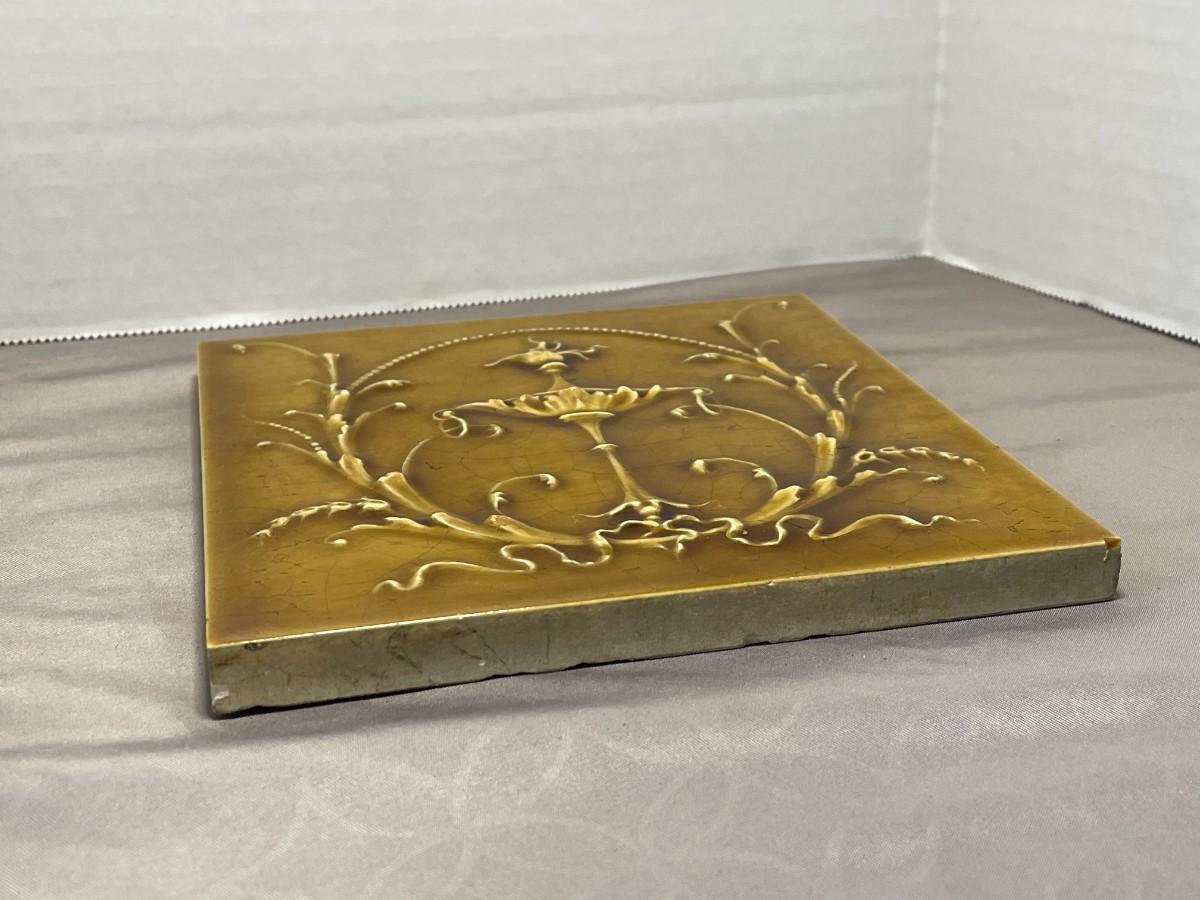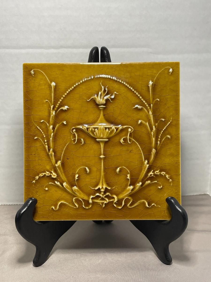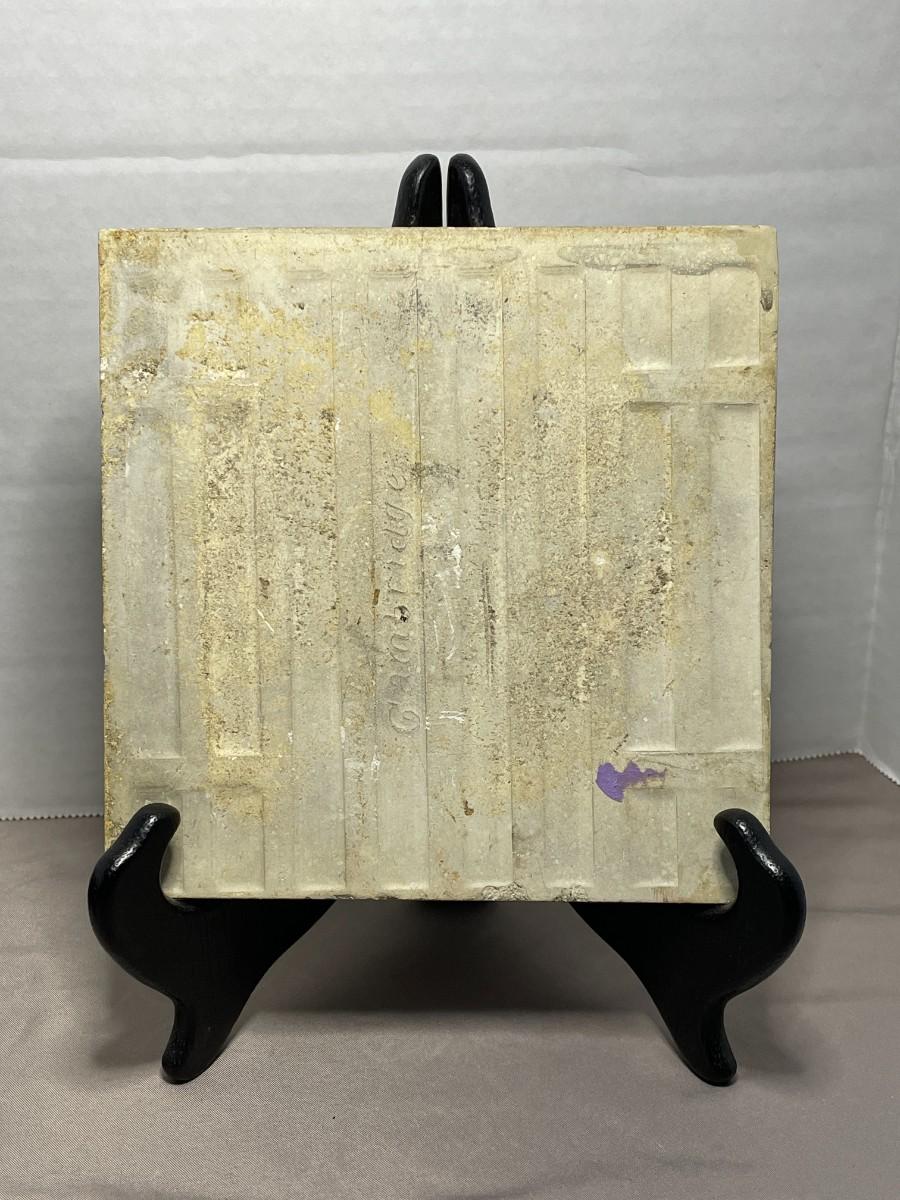 This is a beautiful ceramic tile made by Cambridge circa late 1800s-early 1900s and measures about 6 inches square. The only real issue is that there is crazing in the glaze, but who doesn't have a little crazing after 100 years? The wood stand is included.