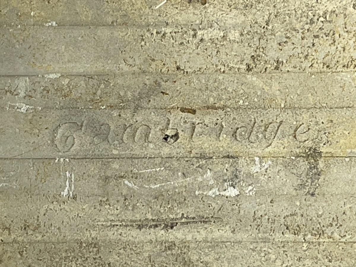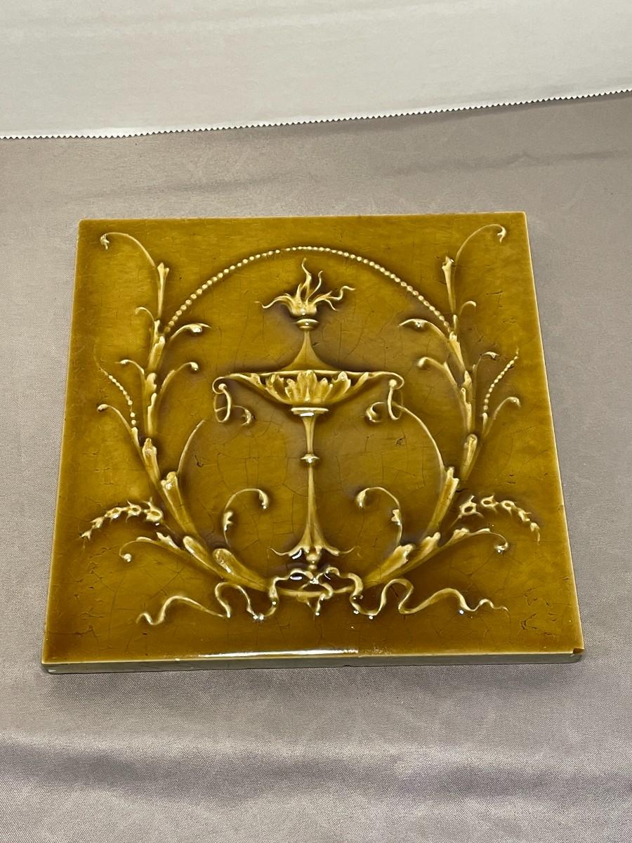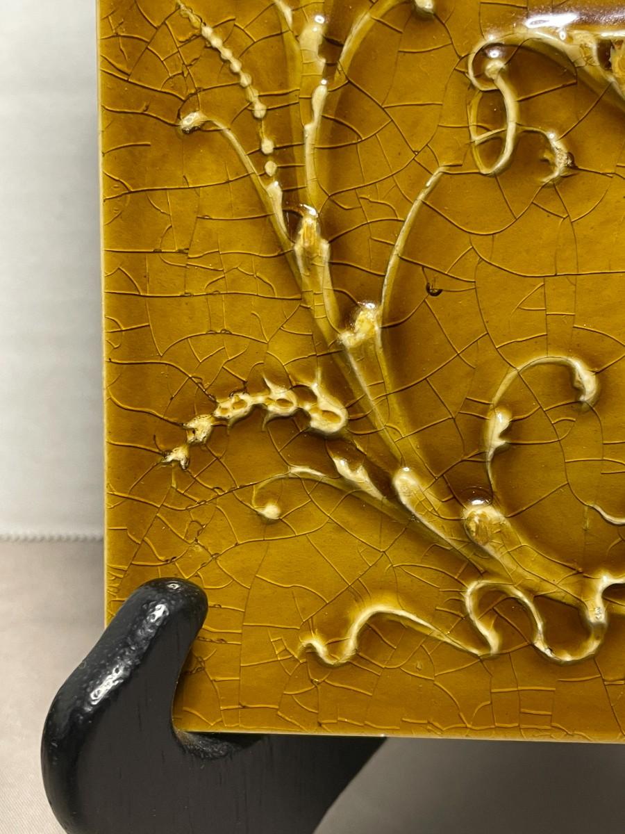 This is a beautiful ceramic tile made by Cambridge circa late 1800s-early 1900s and measures about 6 inches square. The only real issue is that there is crazing in the glaze, but who doesn't have a little crazing after 100 years? The wood stand is included.