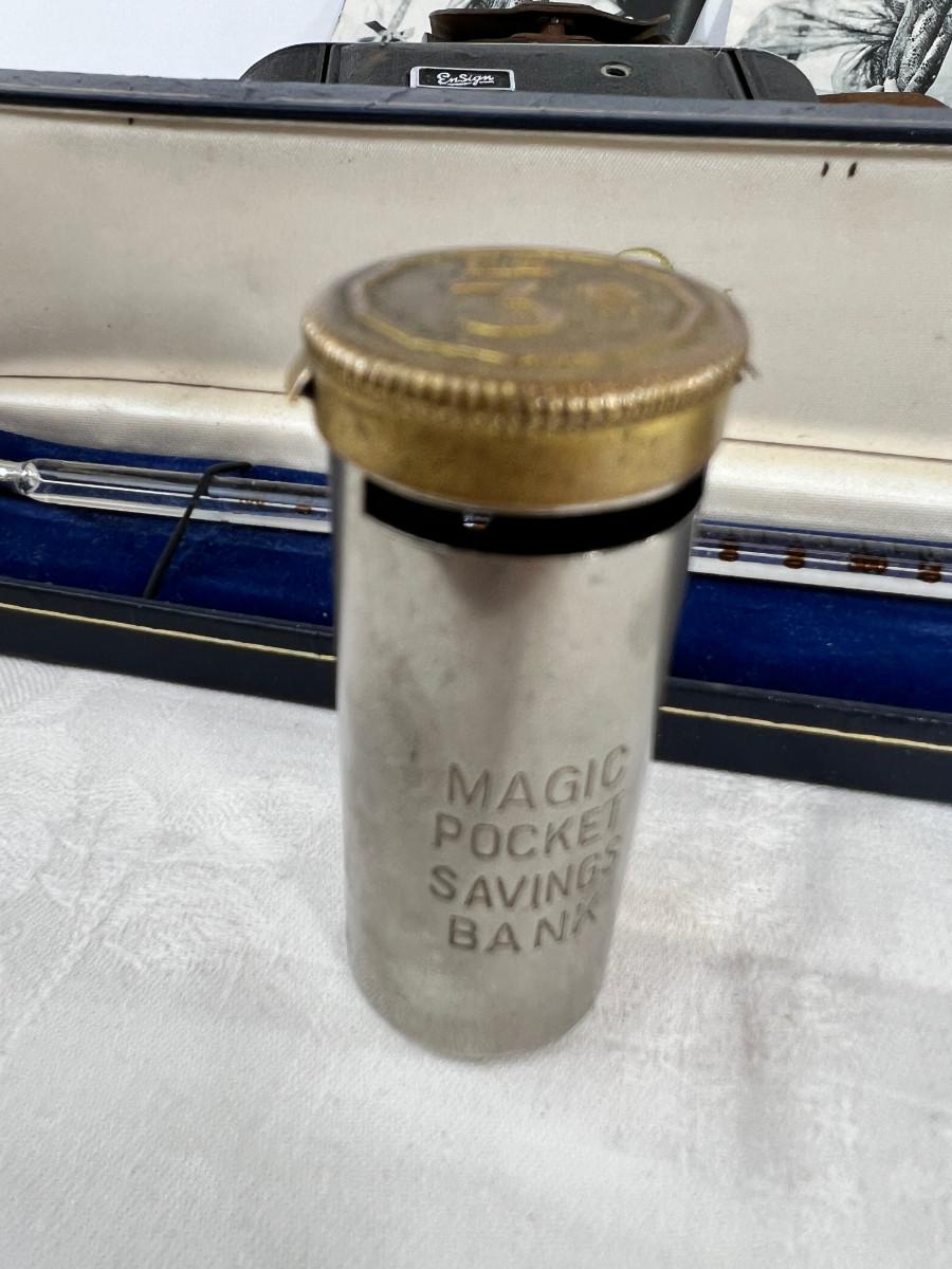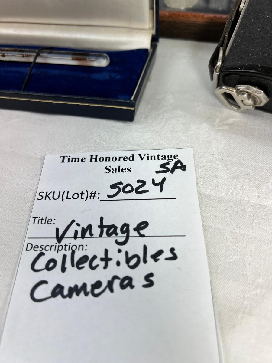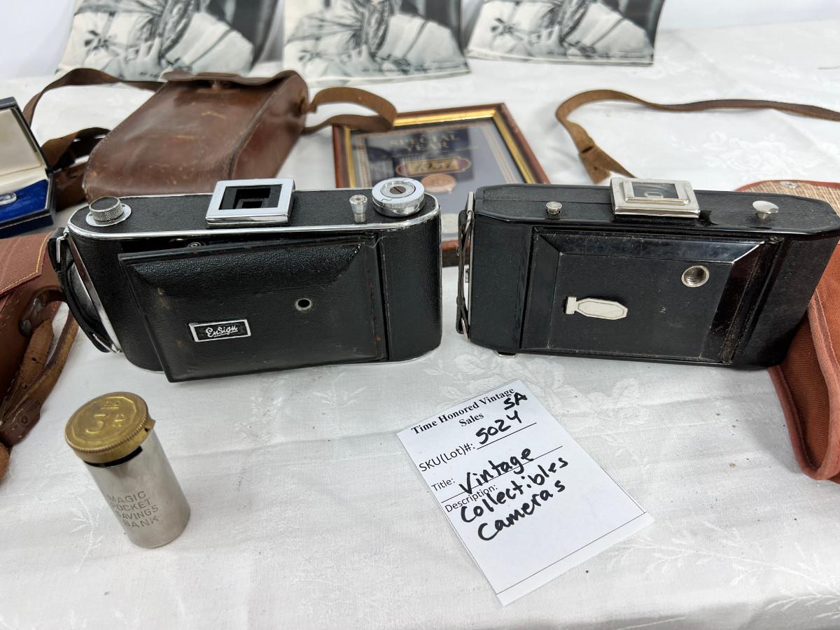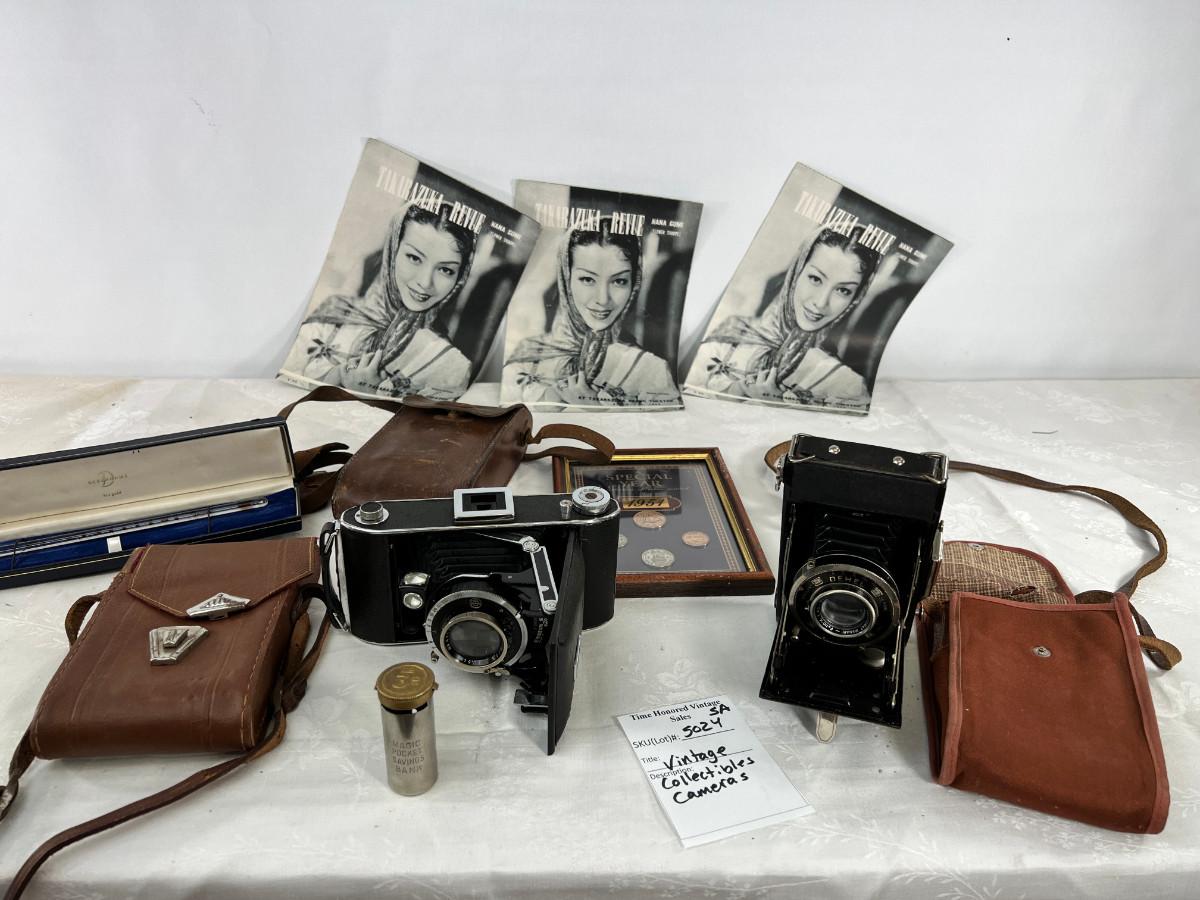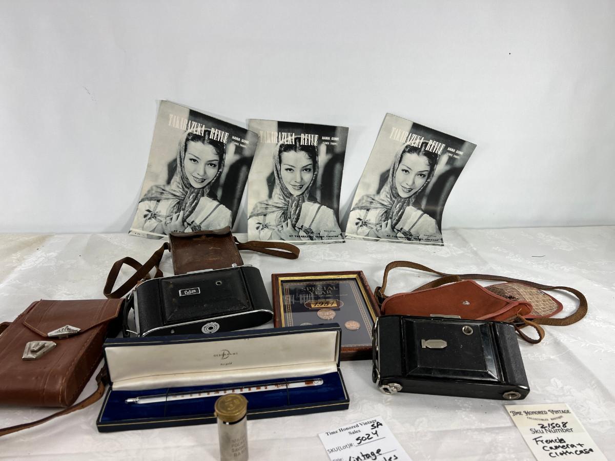 Antique Cameras, cases, 1951 coins, Thermometer . Play bills., cameras untested