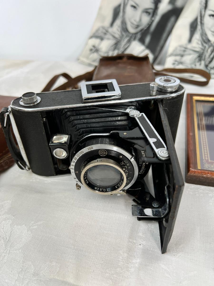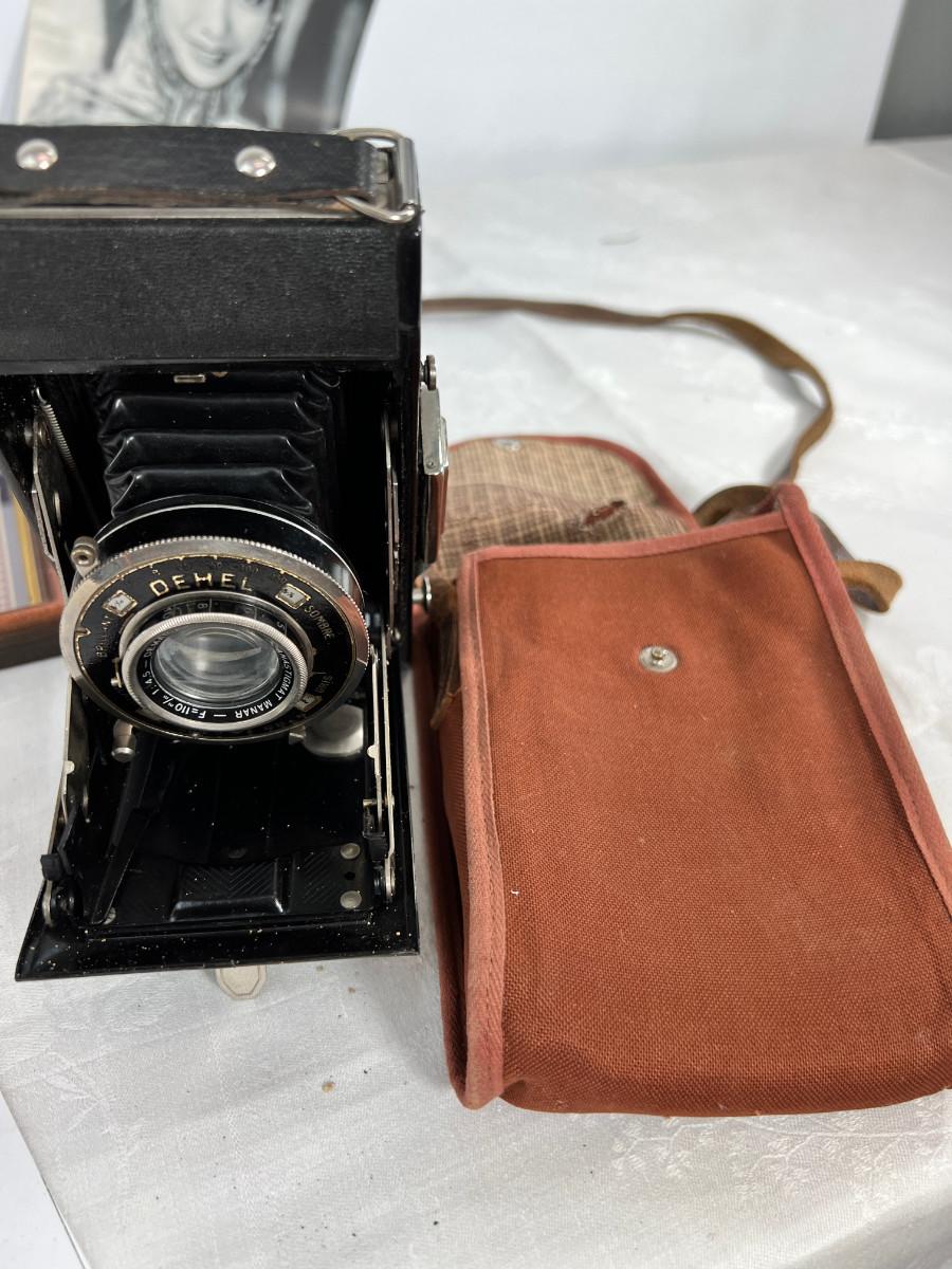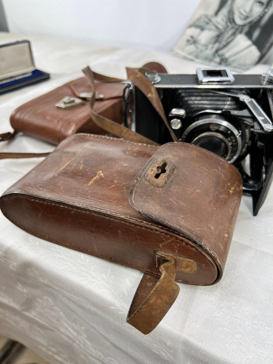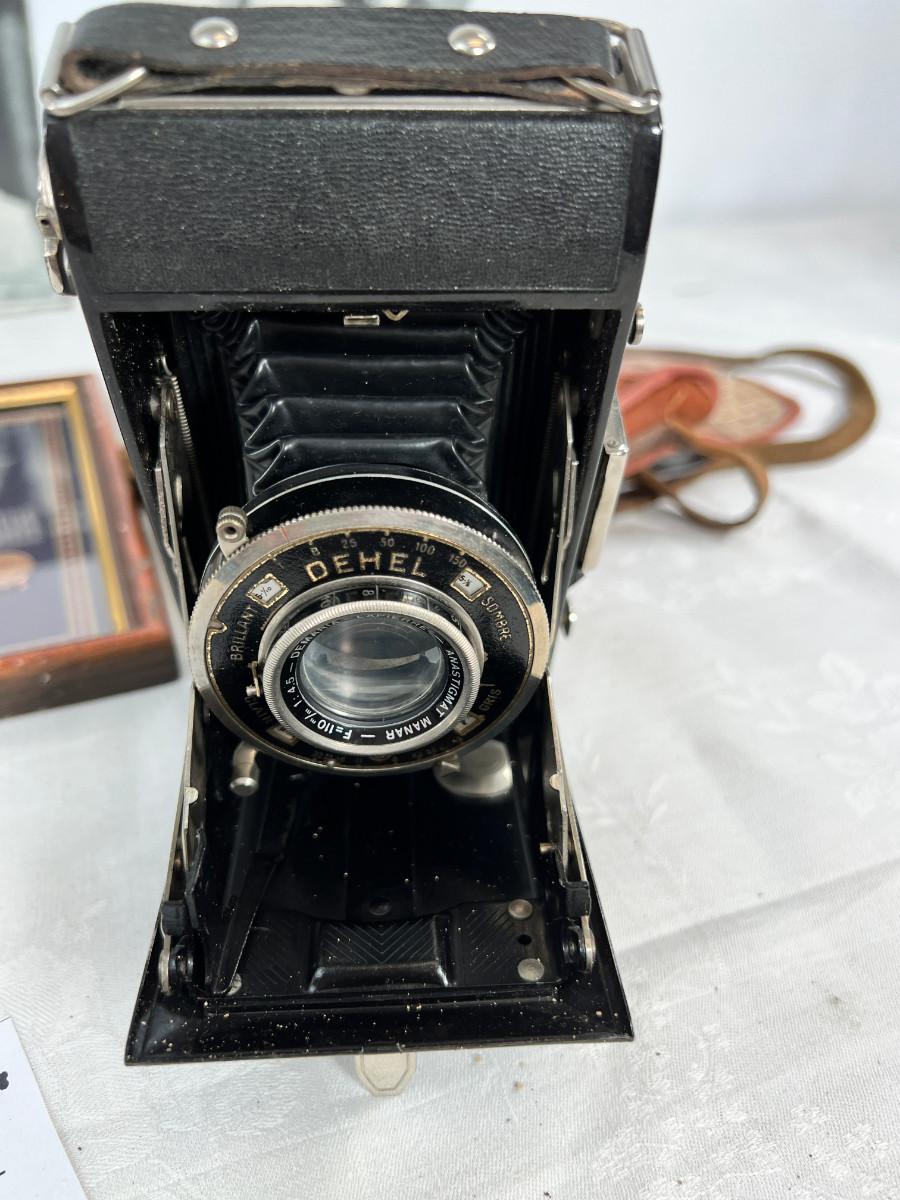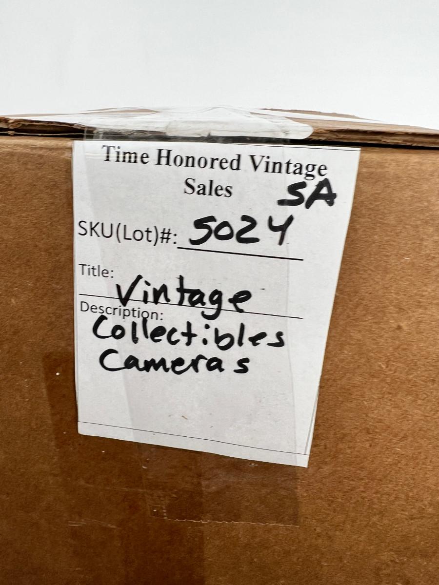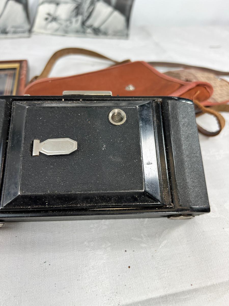 Antique Cameras, cases, 1951 coins, Thermometer . Play bills., cameras untested