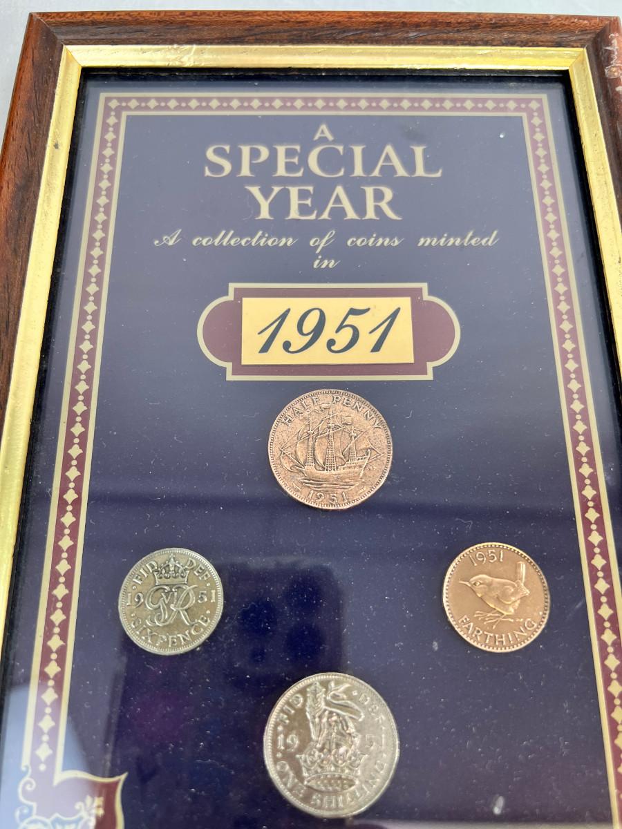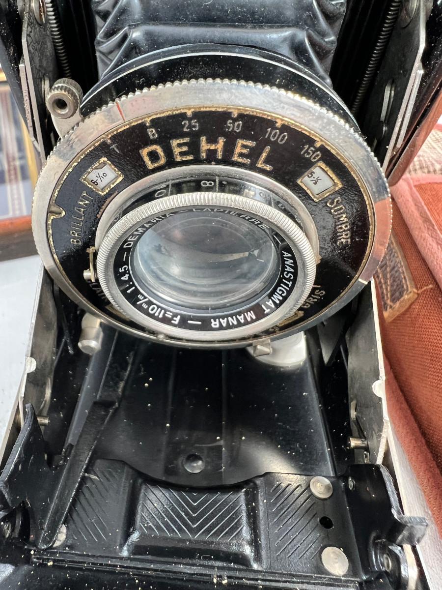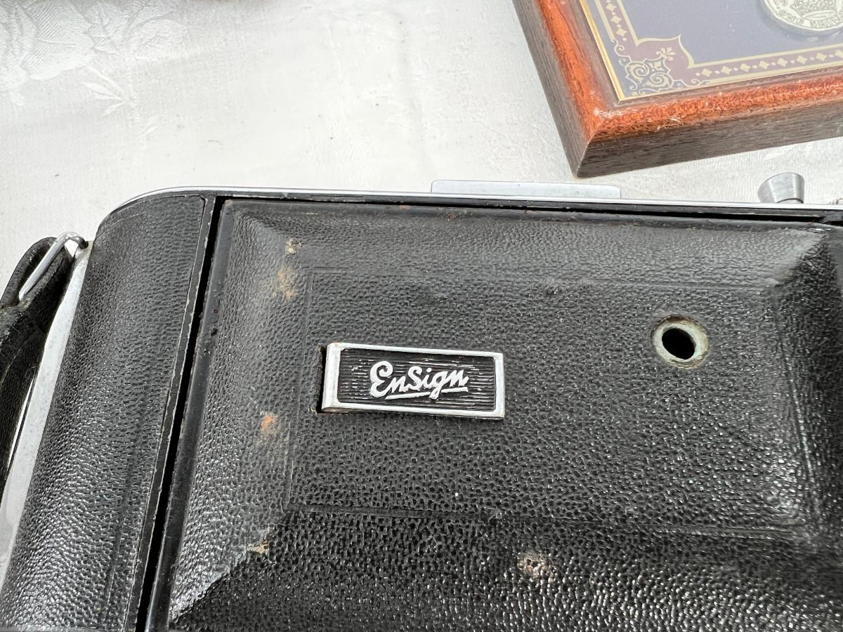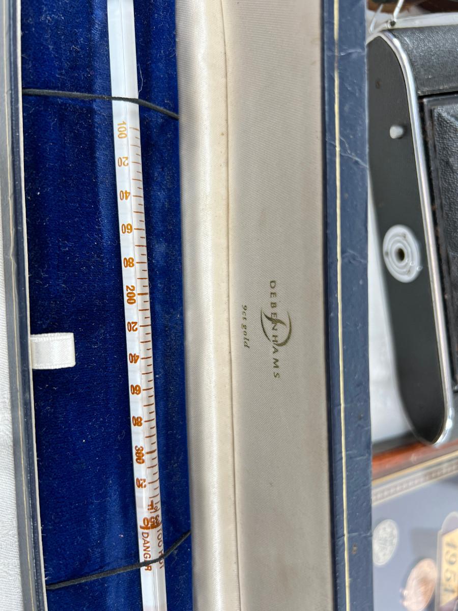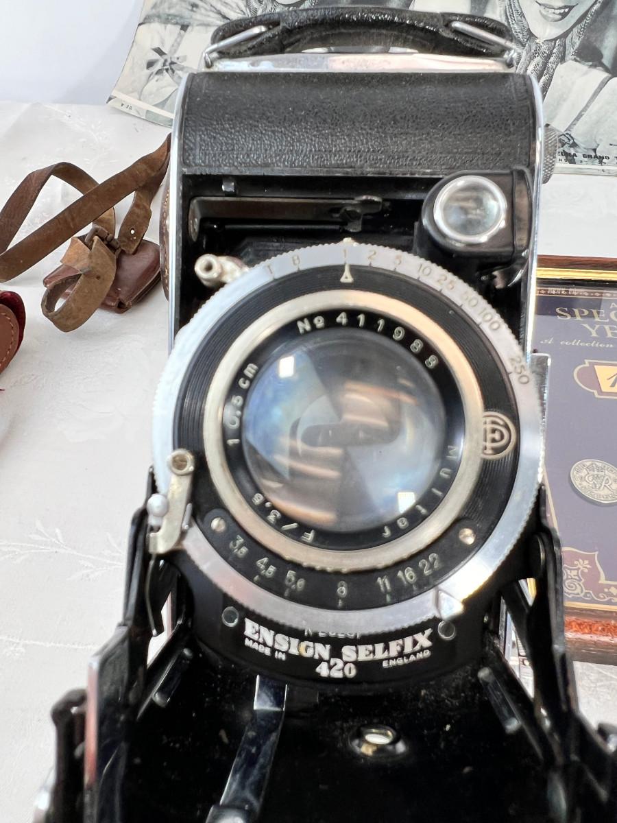 Antique Cameras, cases, 1951 coins, Thermometer . Play bills., cameras untested