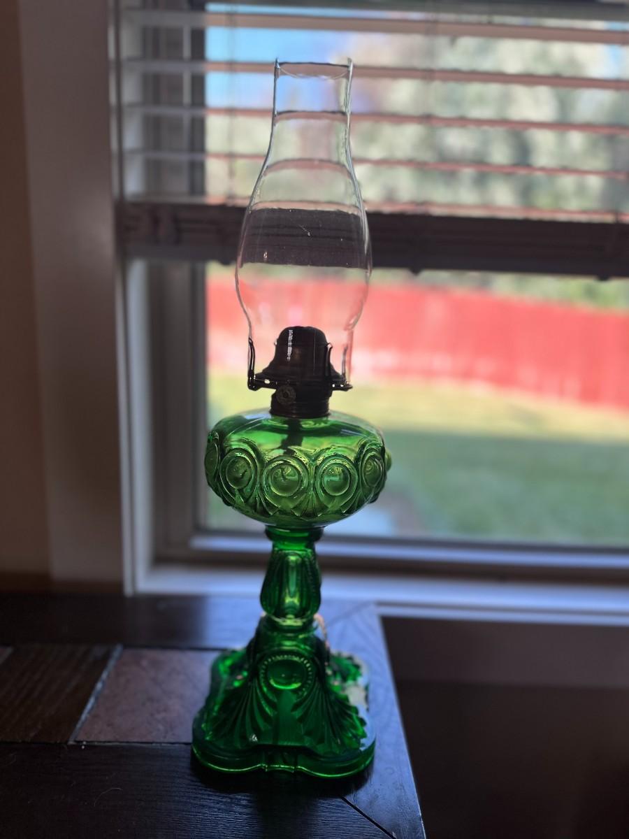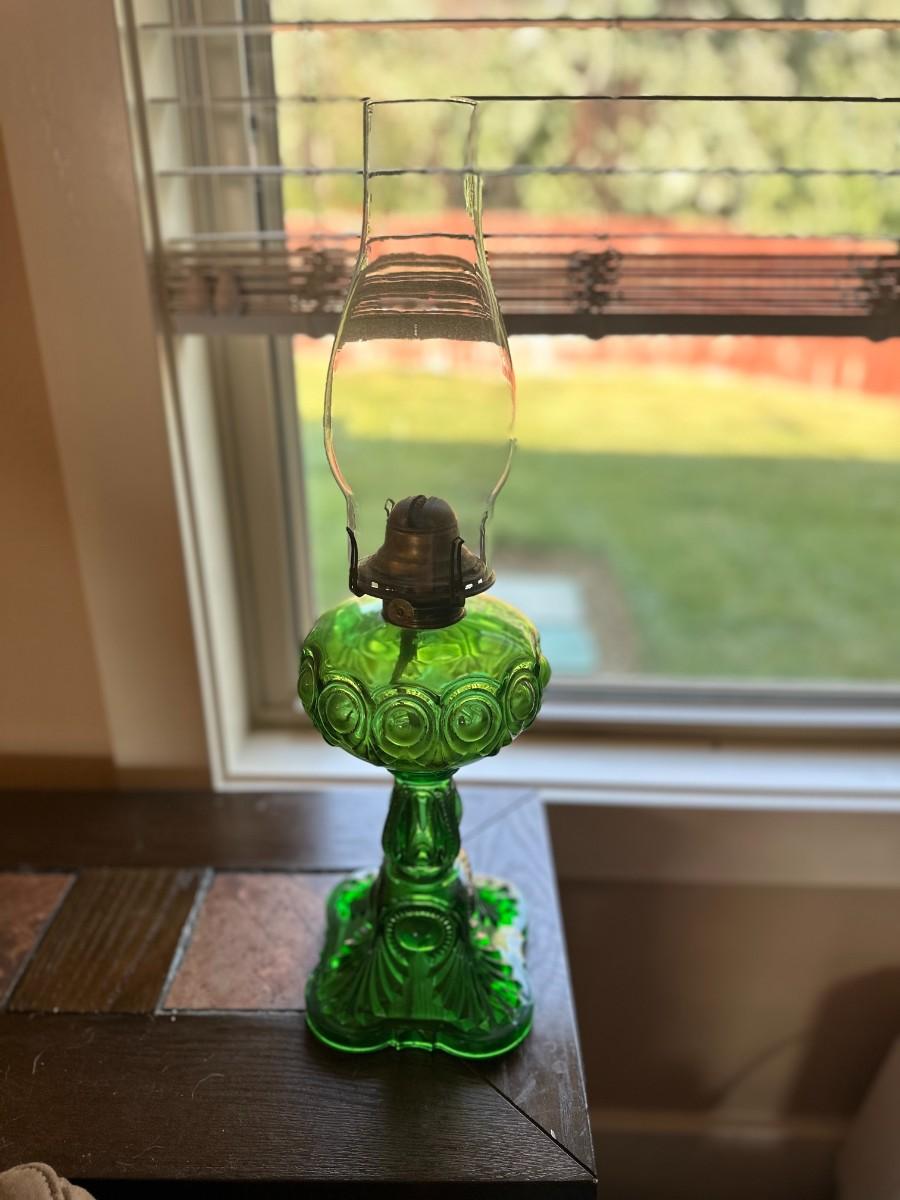 Antique Canadian Bullseye Emerald Green Glass Oil lamp, Oil lantern, Cottage Oil lamp by the Diamond Glass Co. Montreal Ca 1890-1902 Vintage