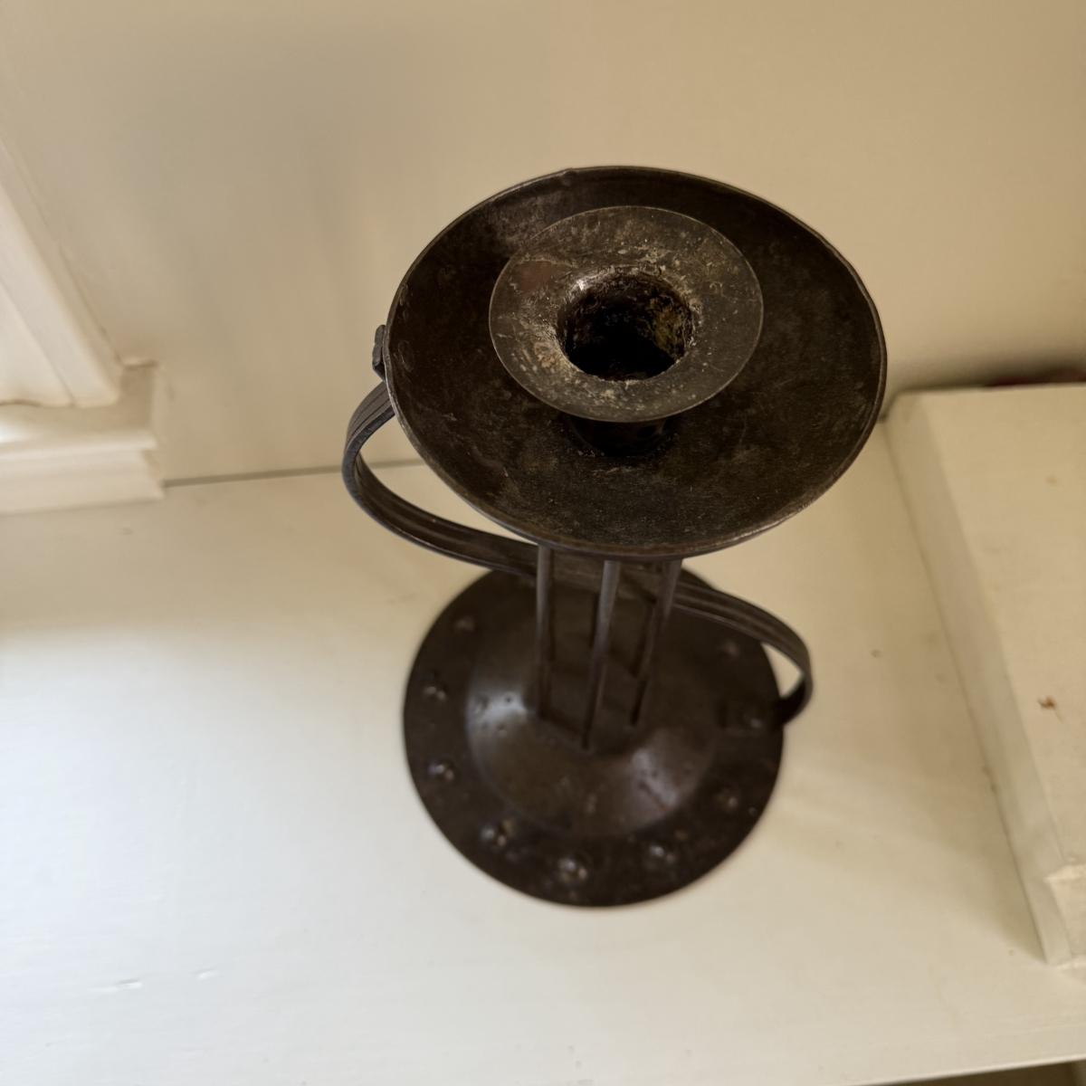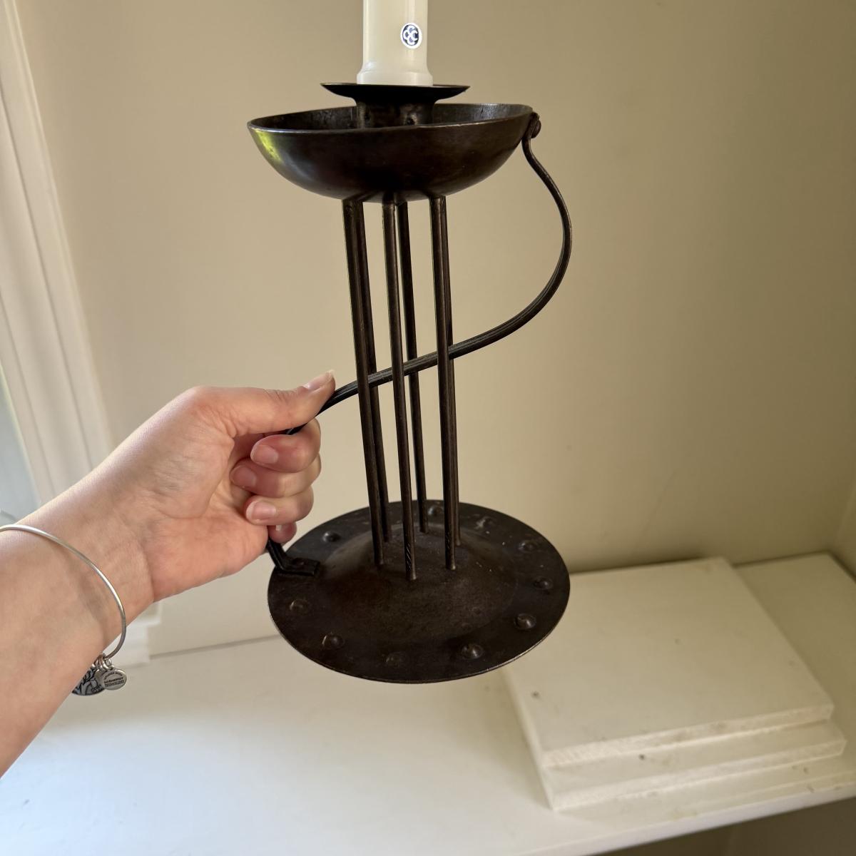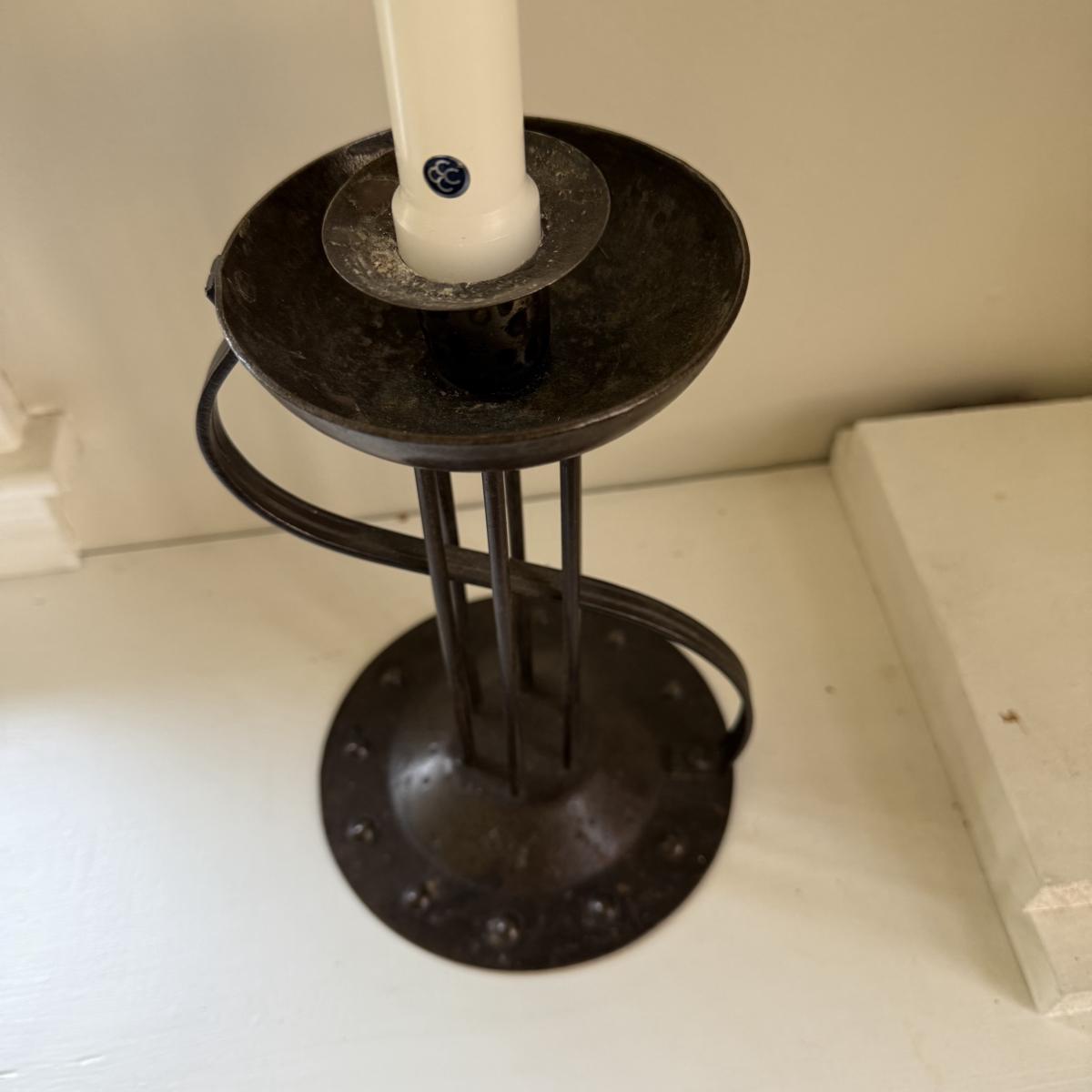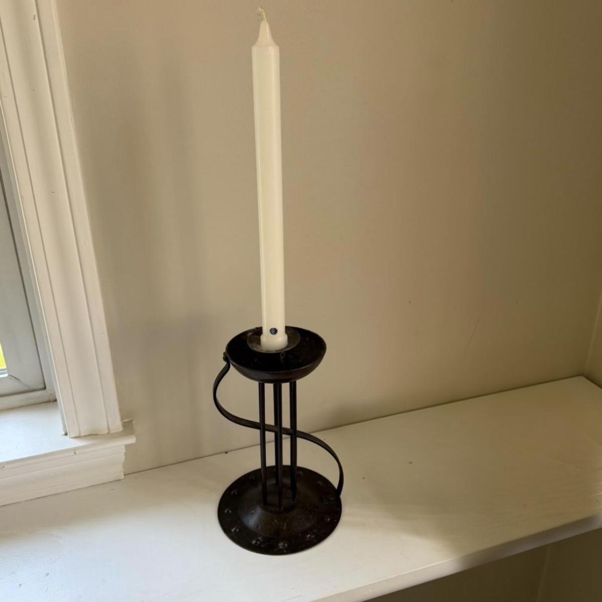 This lot contains a unique taper candle holder, stamped "Goberg" on the bottom indicating artist Hugo Berger "Goberg". It is made of iron with a circular base and rods that connect to where you sit the candle. There is an accent piece that swivels through the rods and could act as a handle. This item has a 5.5”D at the base and stands 8.5”H not including the candle. This item does include a white 12” taper candle. Shipping available.