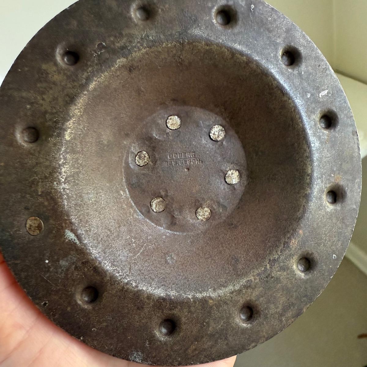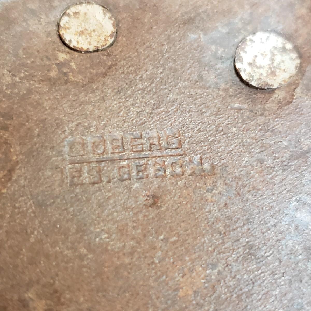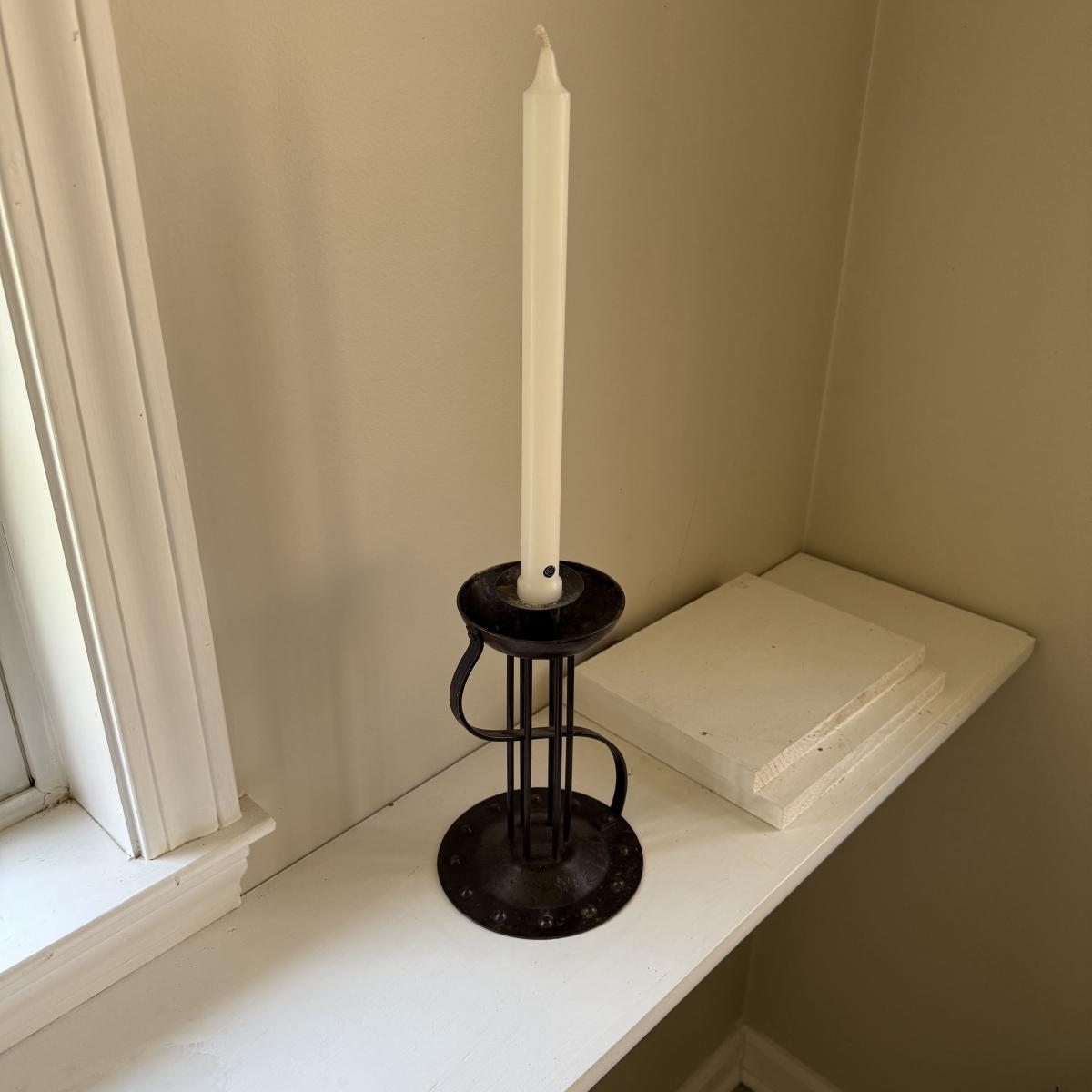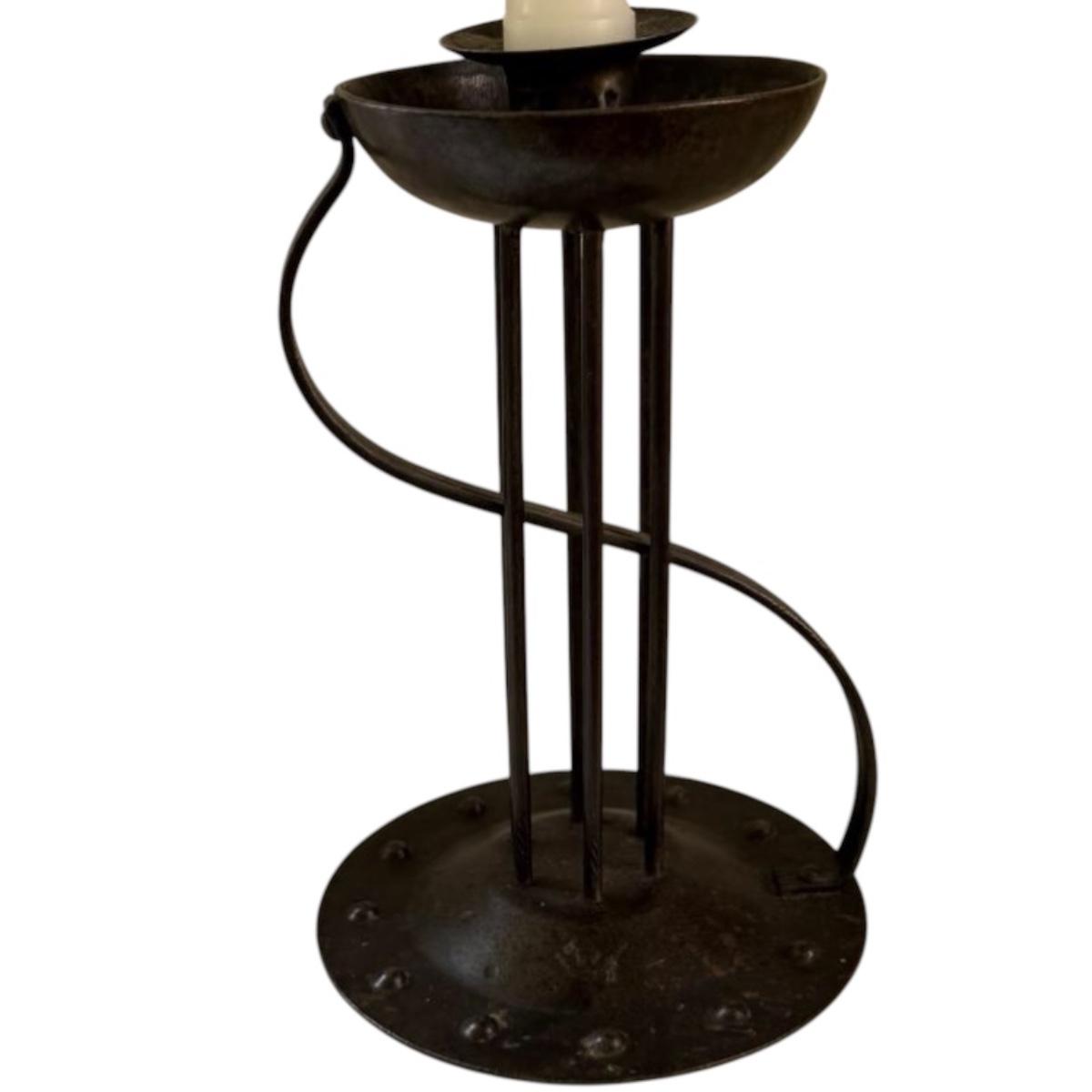 This lot contains a unique taper candle holder, stamped "Goberg" on the bottom indicating artist Hugo Berger "Goberg". It is made of iron with a circular base and rods that connect to where you sit the candle. There is an accent piece that swivels through the rods and could act as a handle. This item has a 5.5”D at the base and stands 8.5”H not including the candle. This item does include a white 12” taper candle. Shipping available.