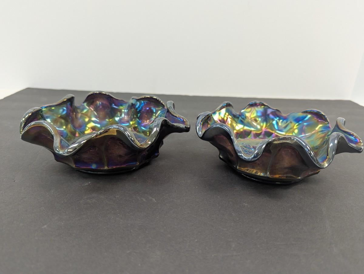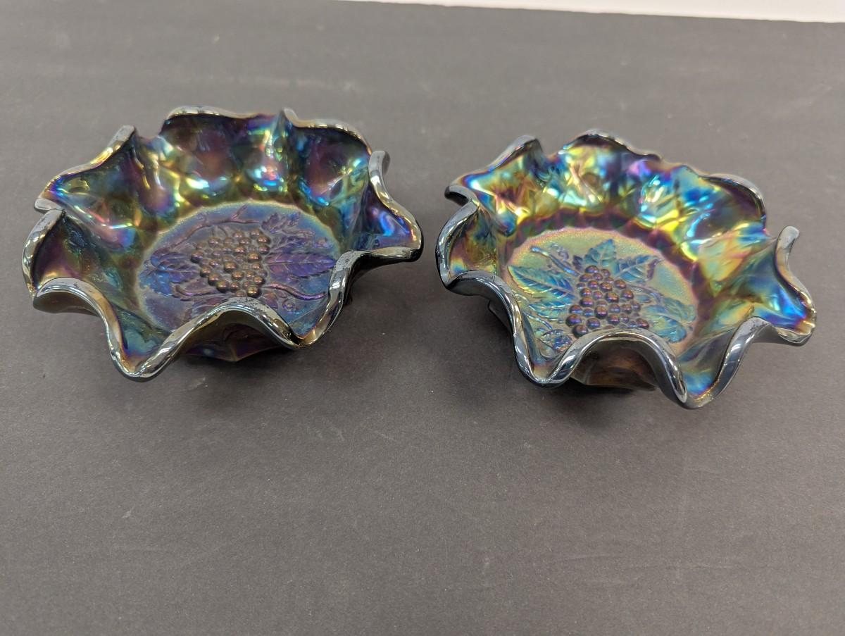 Antique Carnival Heavy Glass Grape By Imperial Radium Ruffled Candy Dishes