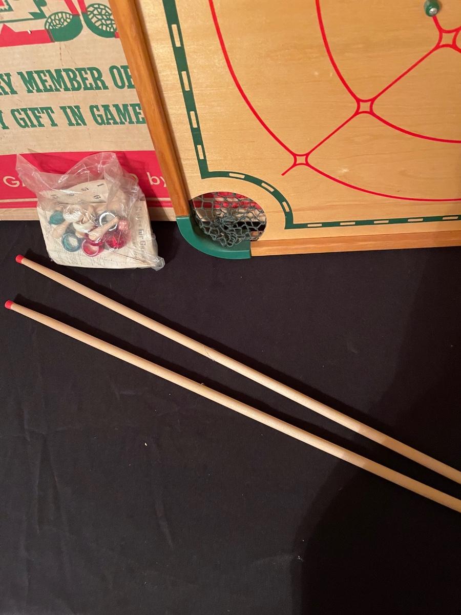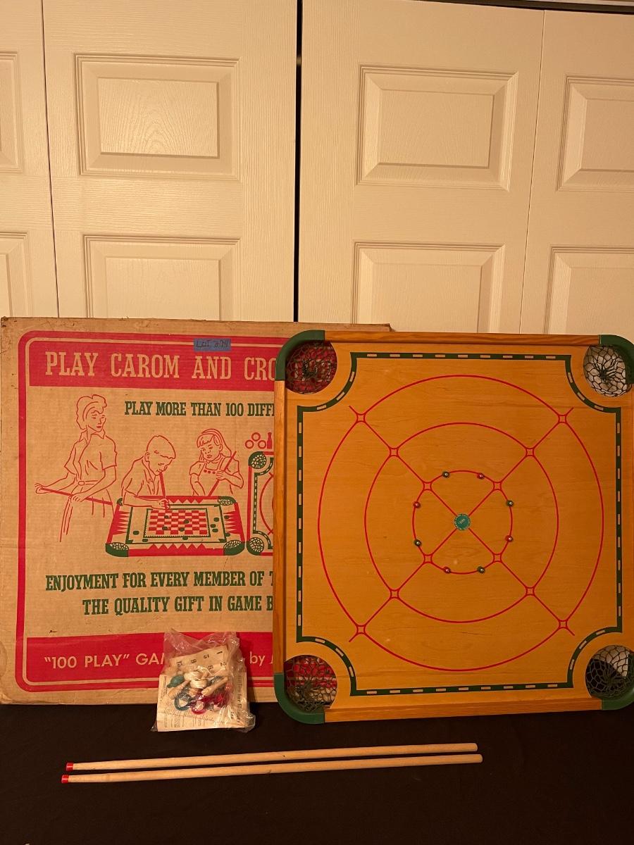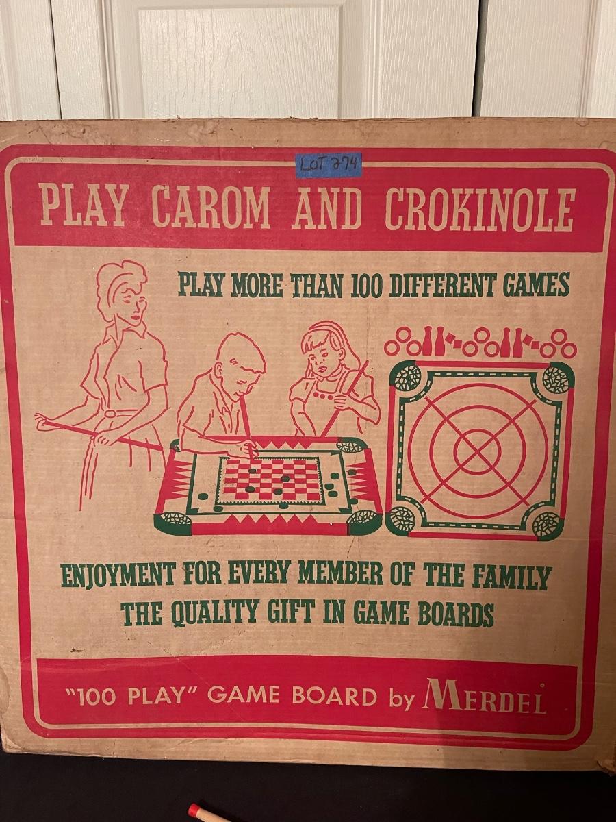 Antique Carom and Crokinole "100 play board" by Merdel includes sticks, intrustuctions, box, board and extra parts.