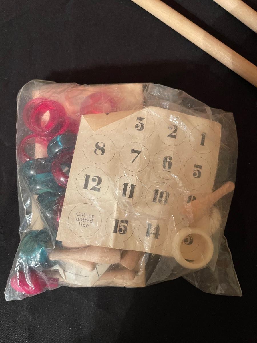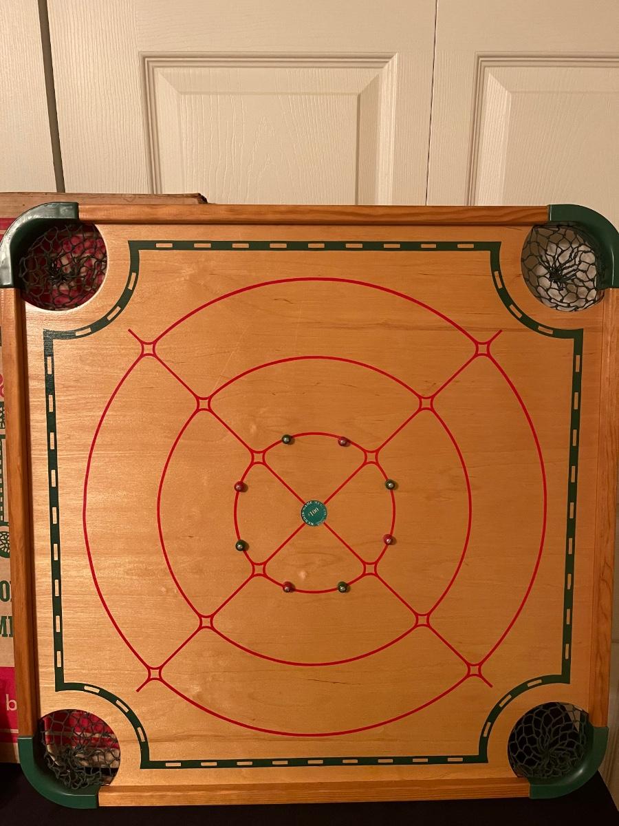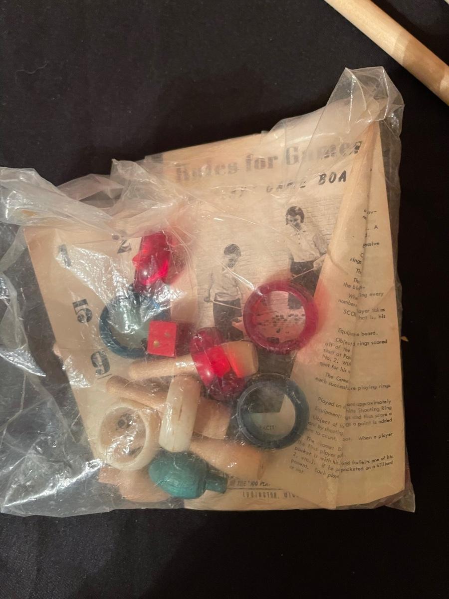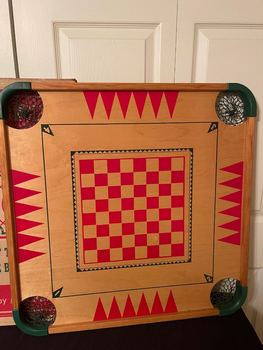 Antique Carom and Crokinole "100 play board" by Merdel includes sticks, intrustuctions, box, board and extra parts.