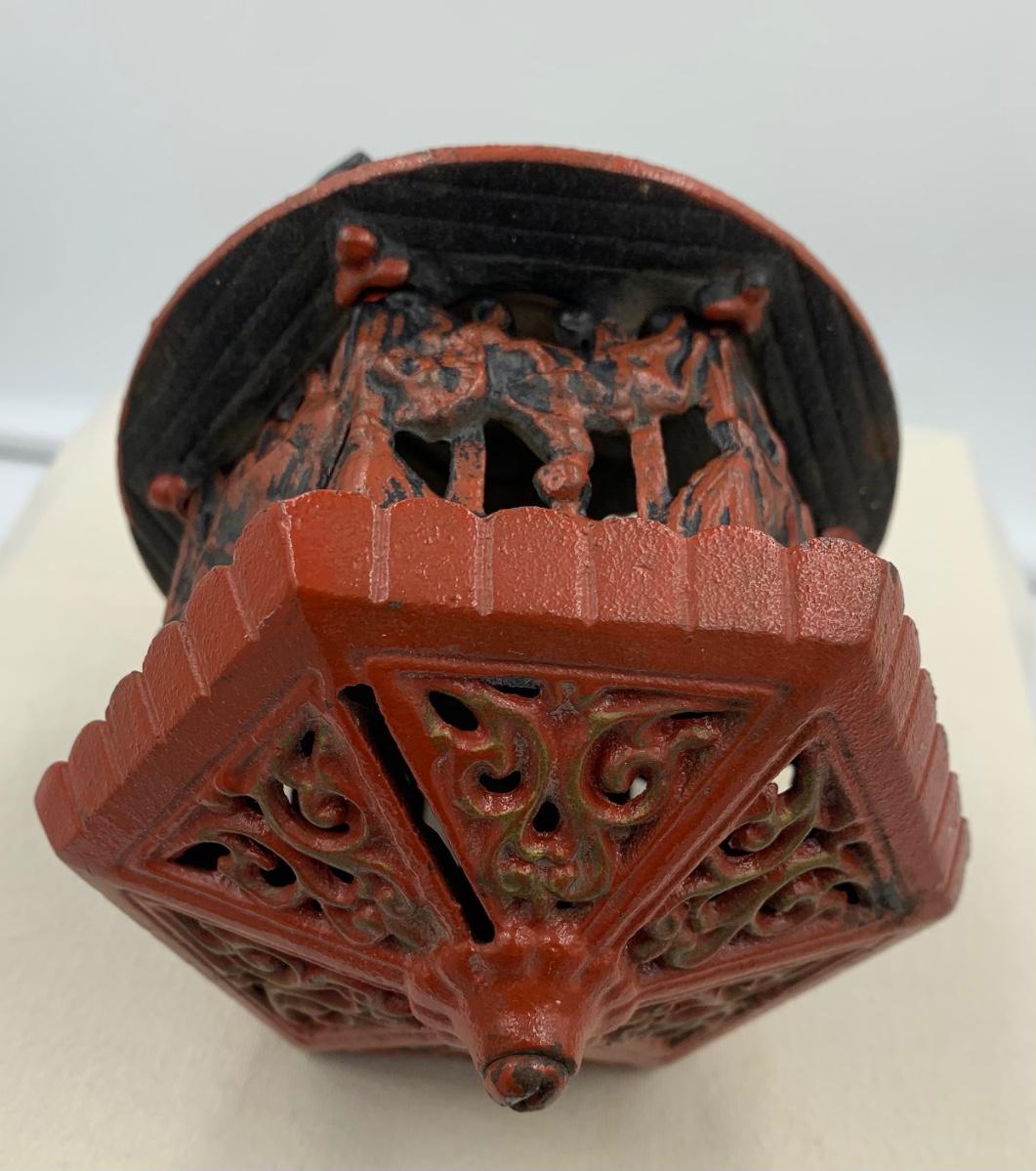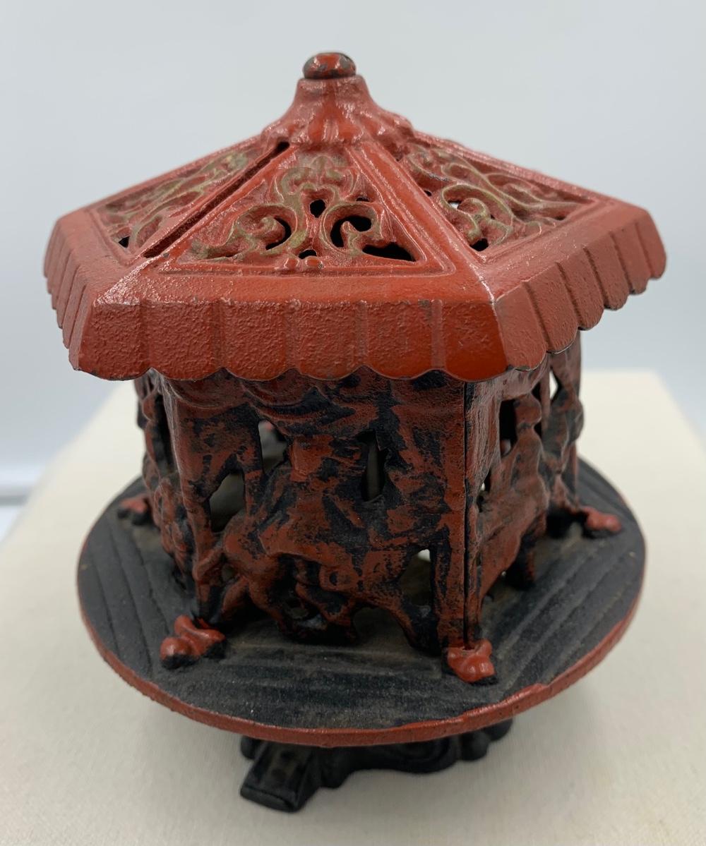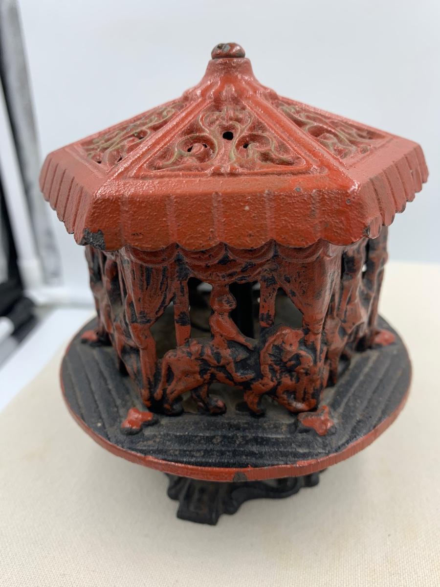 This vintage bank measures 5” H x 4.5” W. Made of cast iron.
