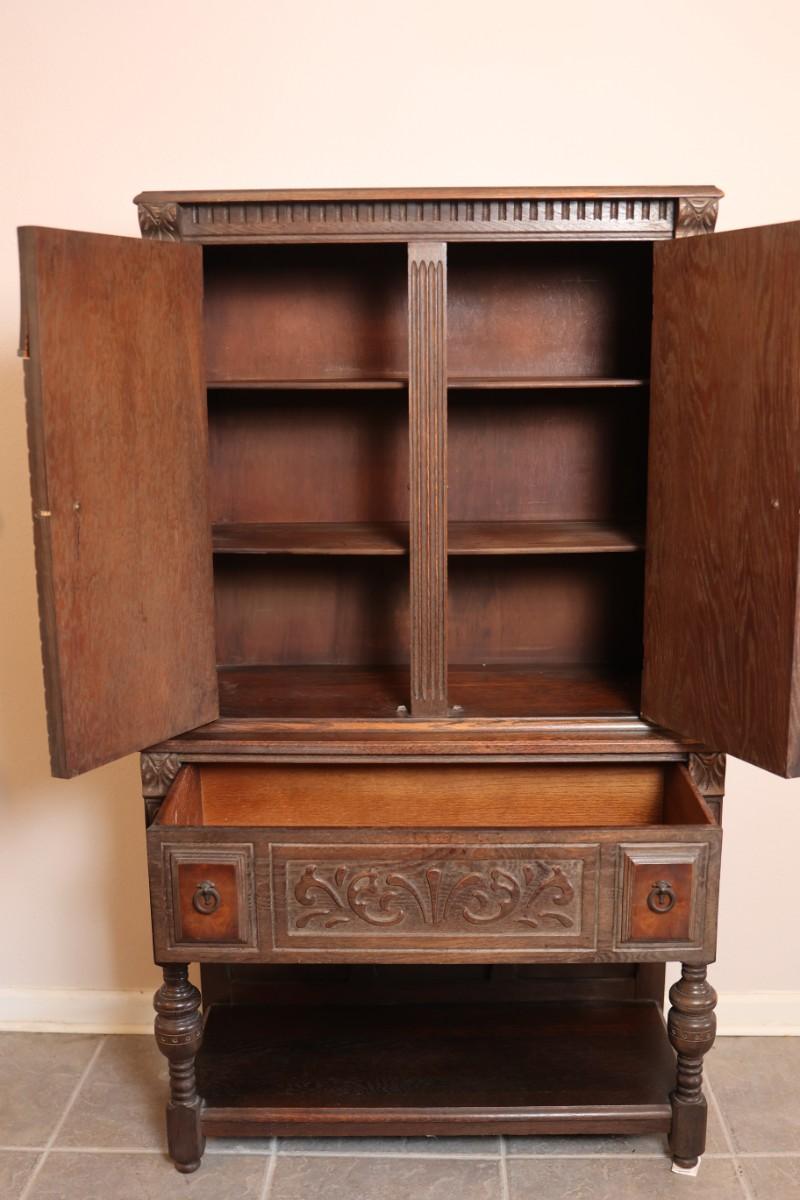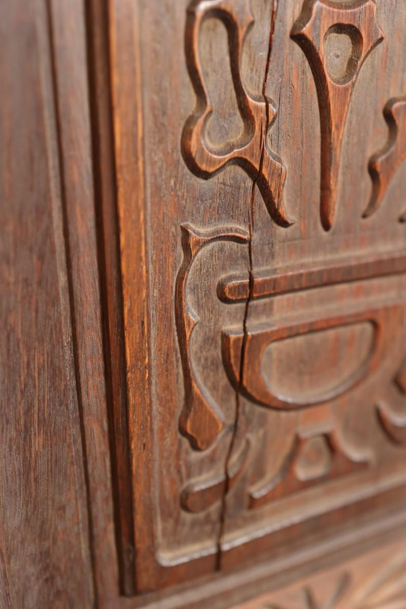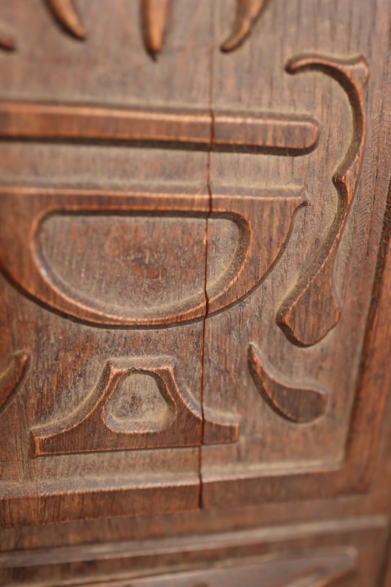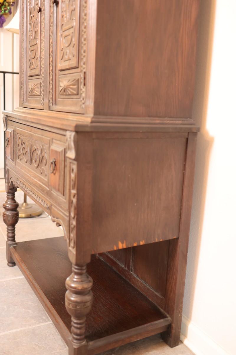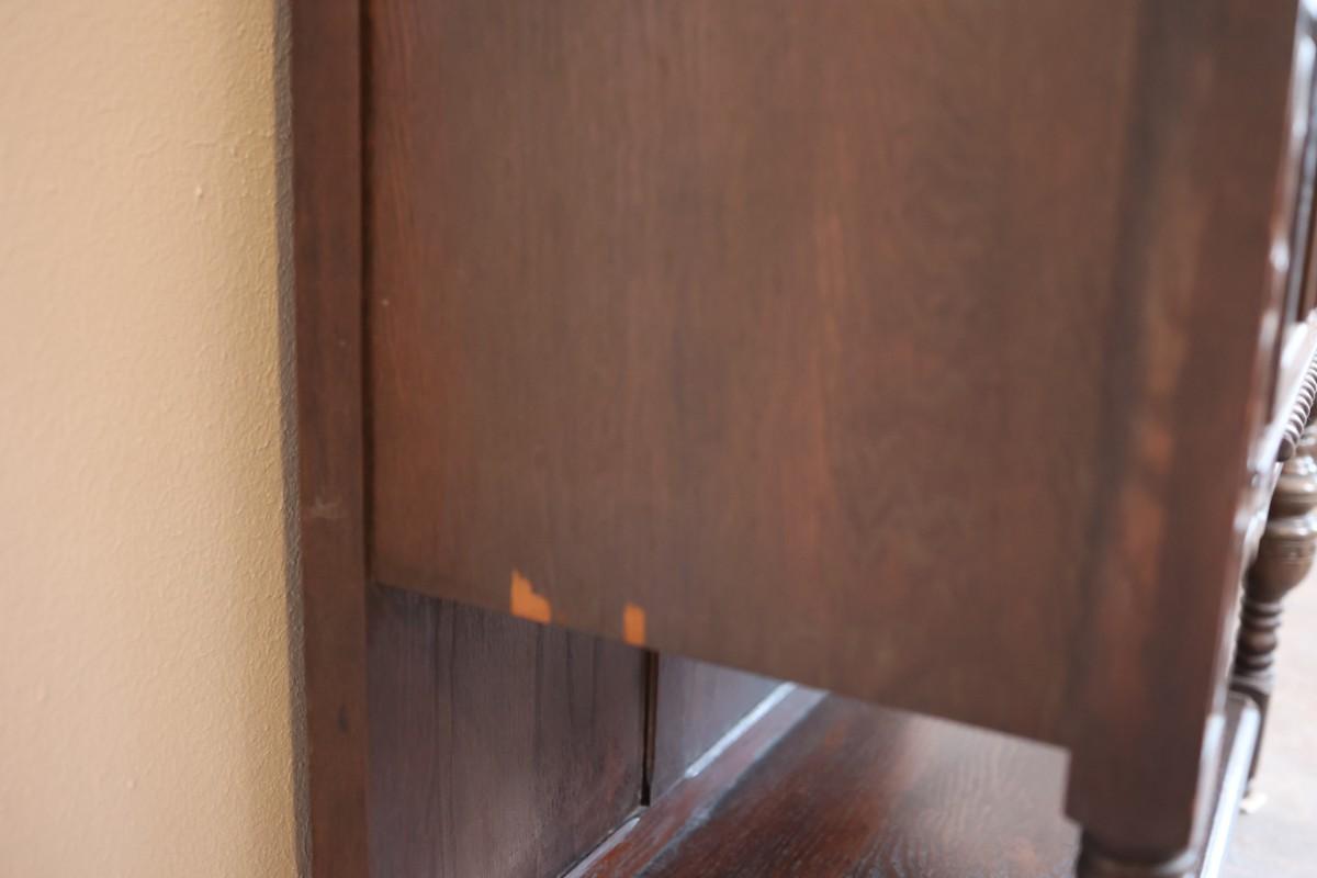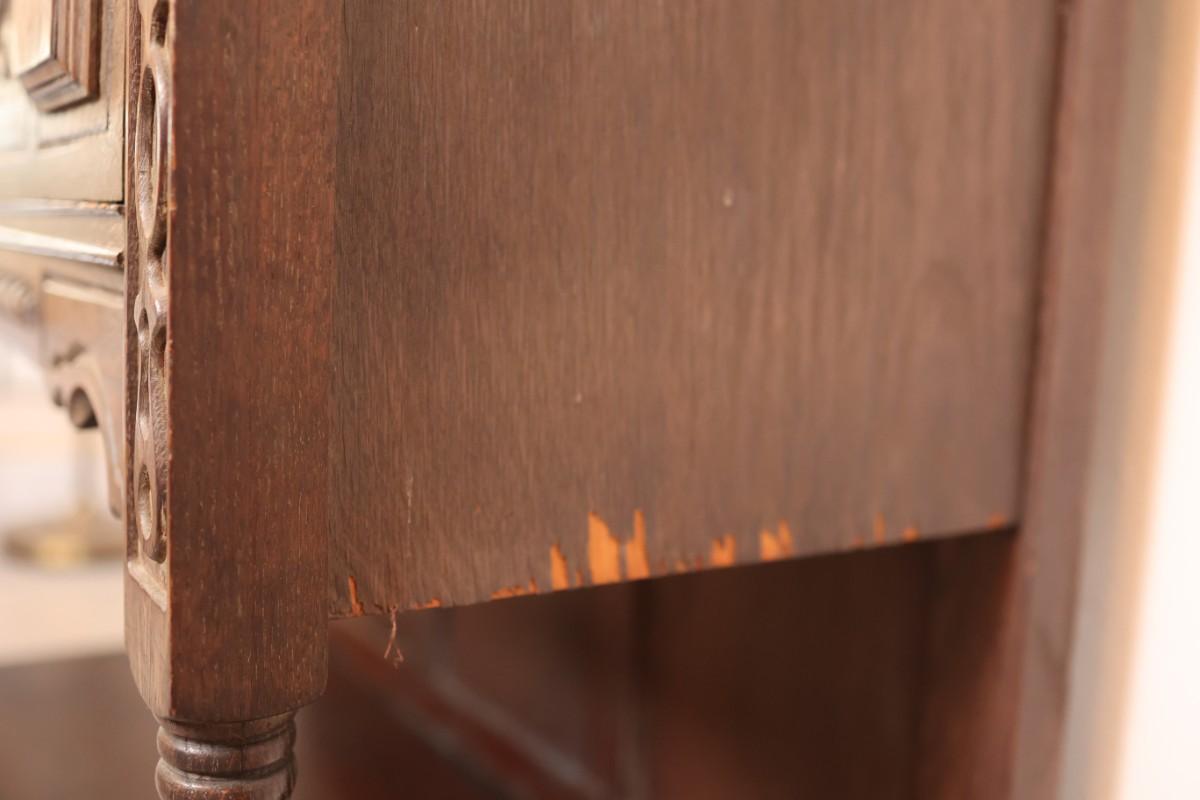 There are minor cracks in the doors, pictured. They are not noticeable until you look close. The cracks do not go through the wood. Some veneer is missing on the bottom side of the piece, pictured.