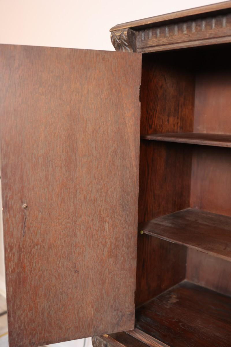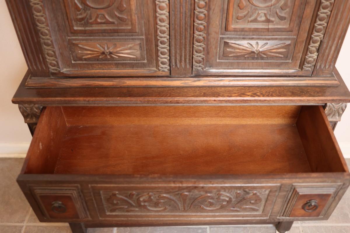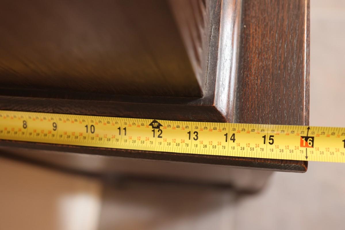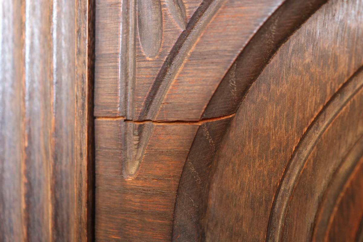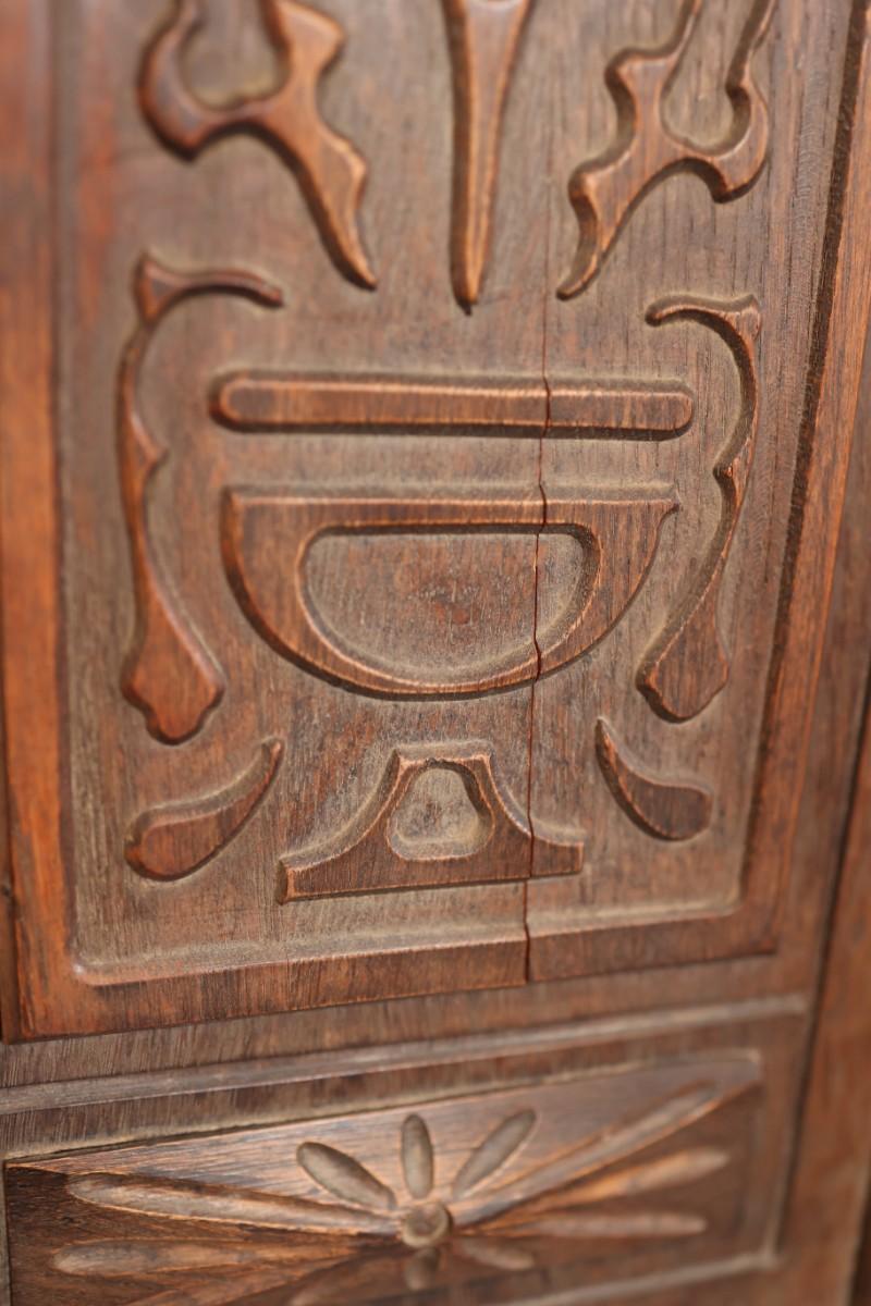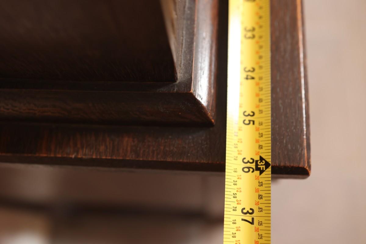 There are minor cracks in the doors, pictured. They are not noticeable until you look close. The cracks do not go through the wood. Some veneer is missing on the bottom side of the piece, pictured.