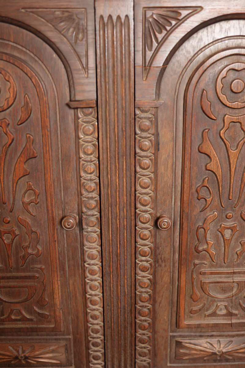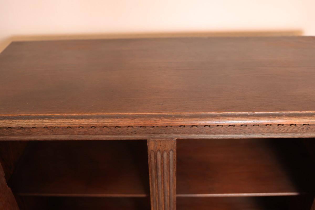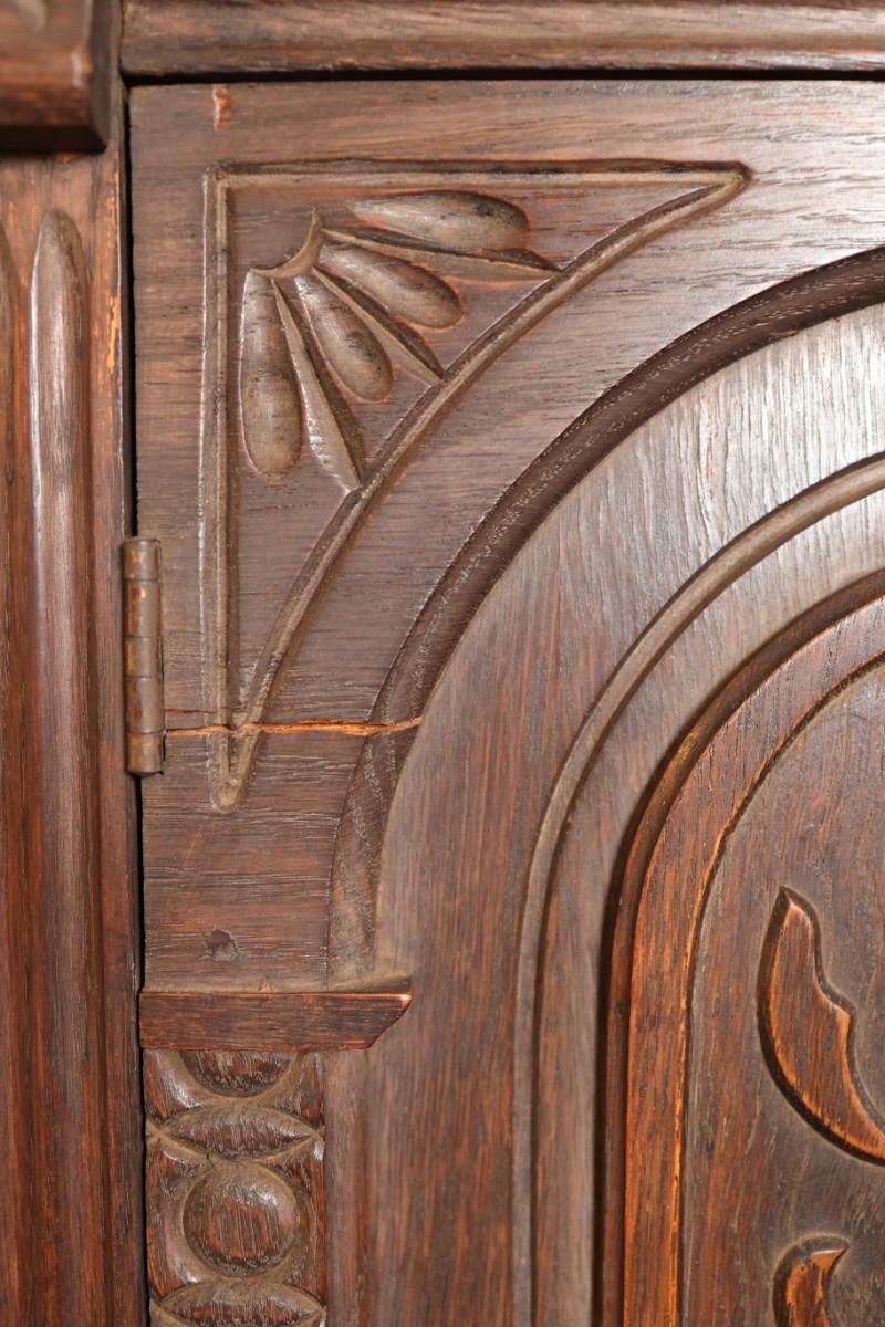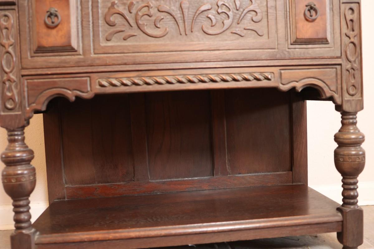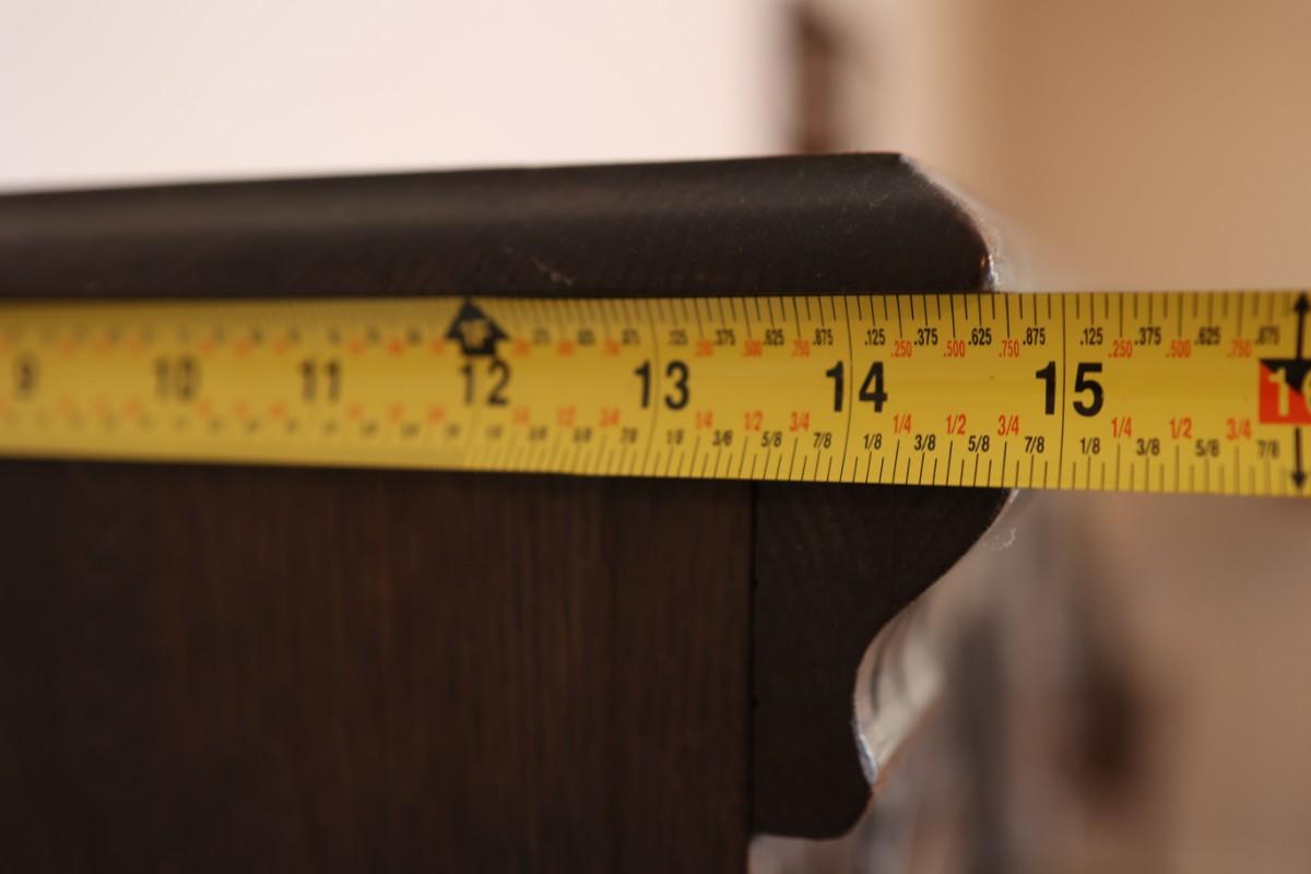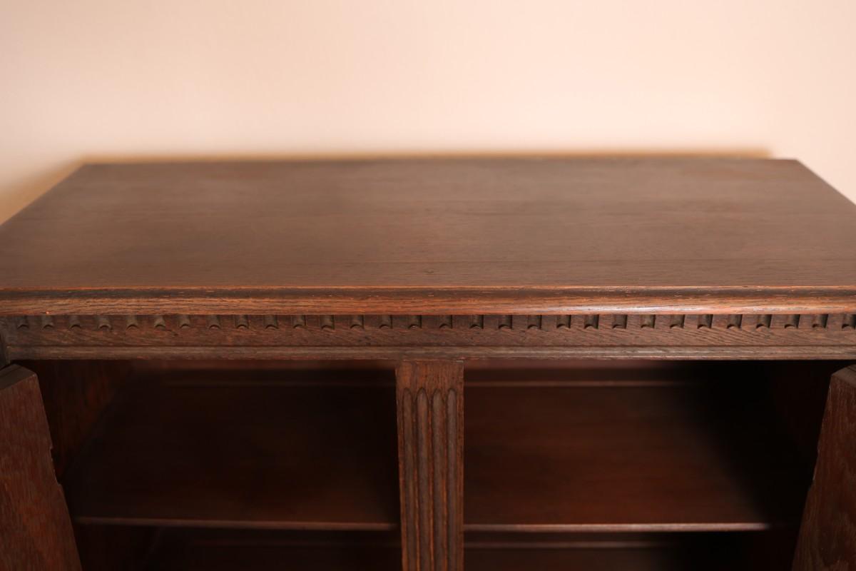 There are minor cracks in the doors, pictured. They are not noticeable until you look close. The cracks do not go through the wood. Some veneer is missing on the bottom side of the piece, pictured.