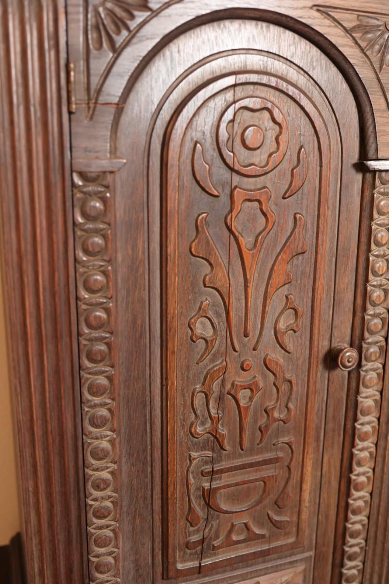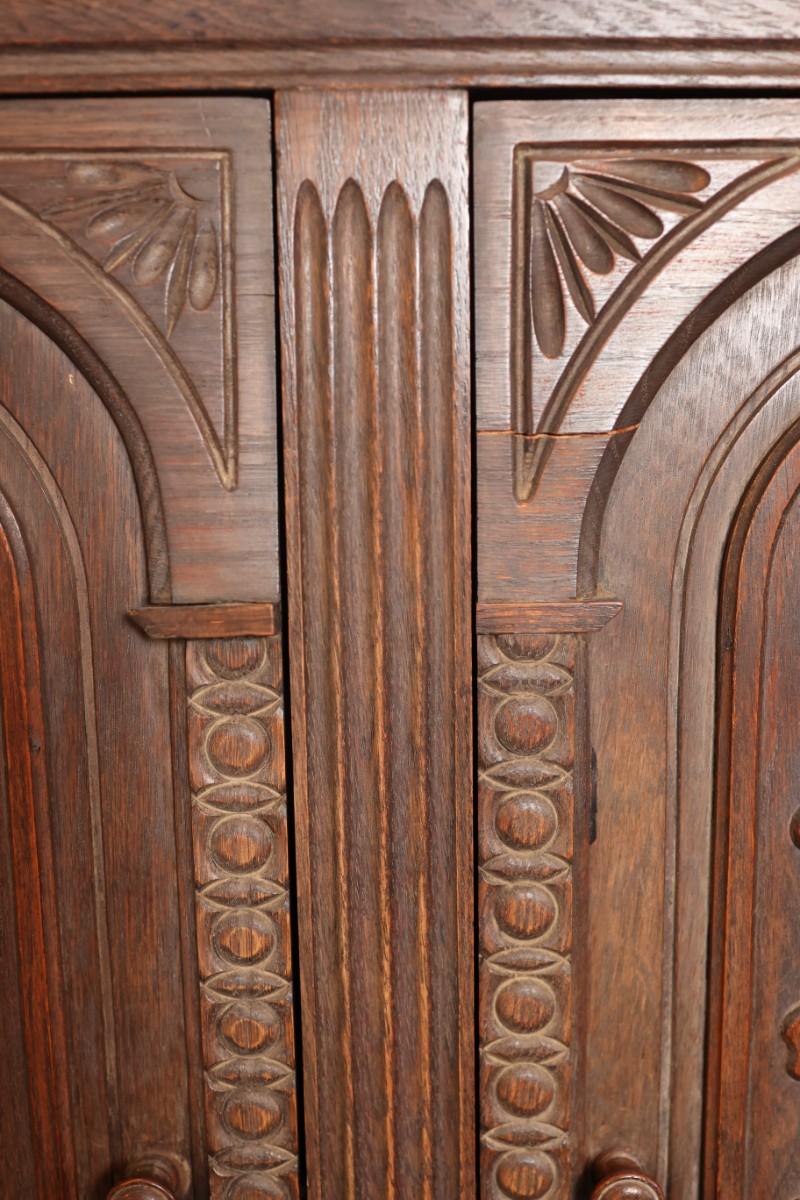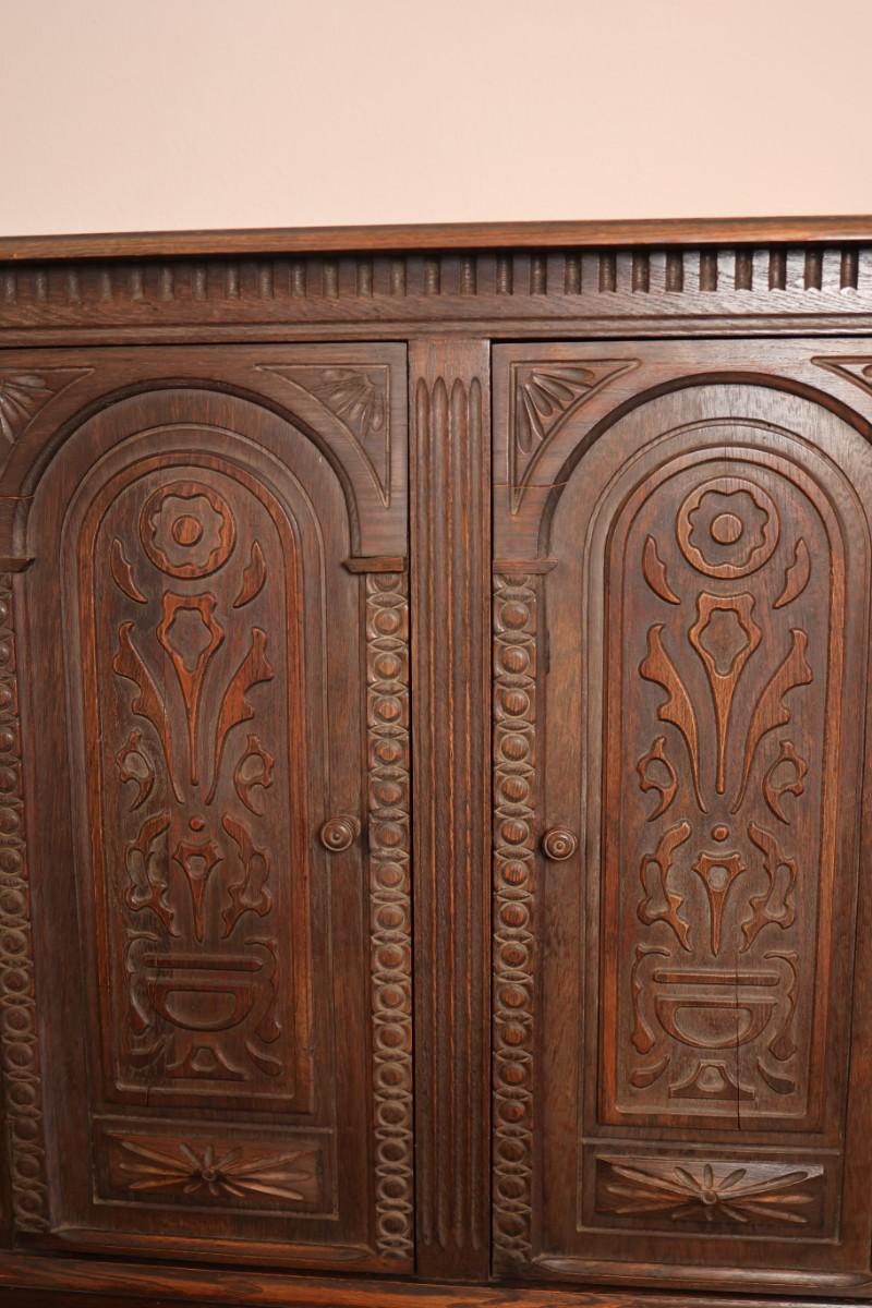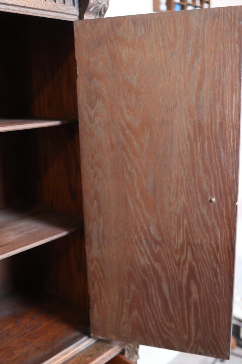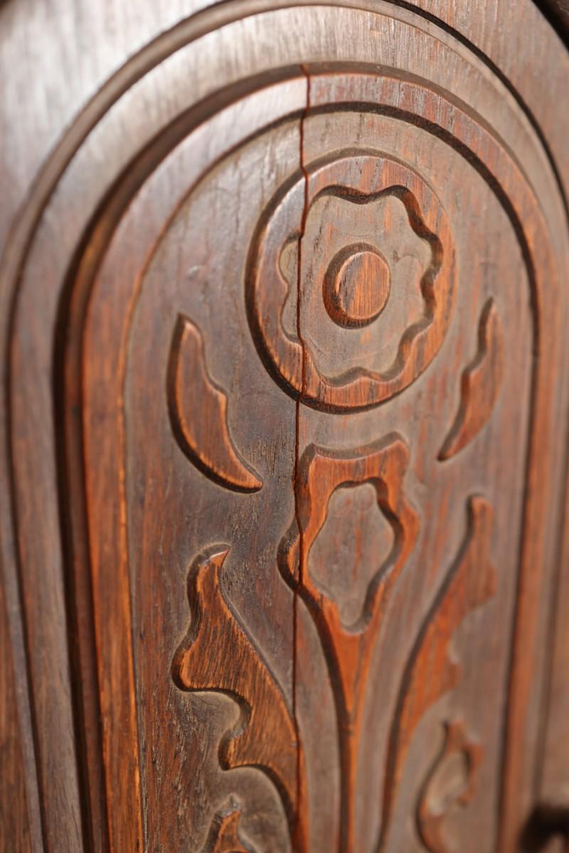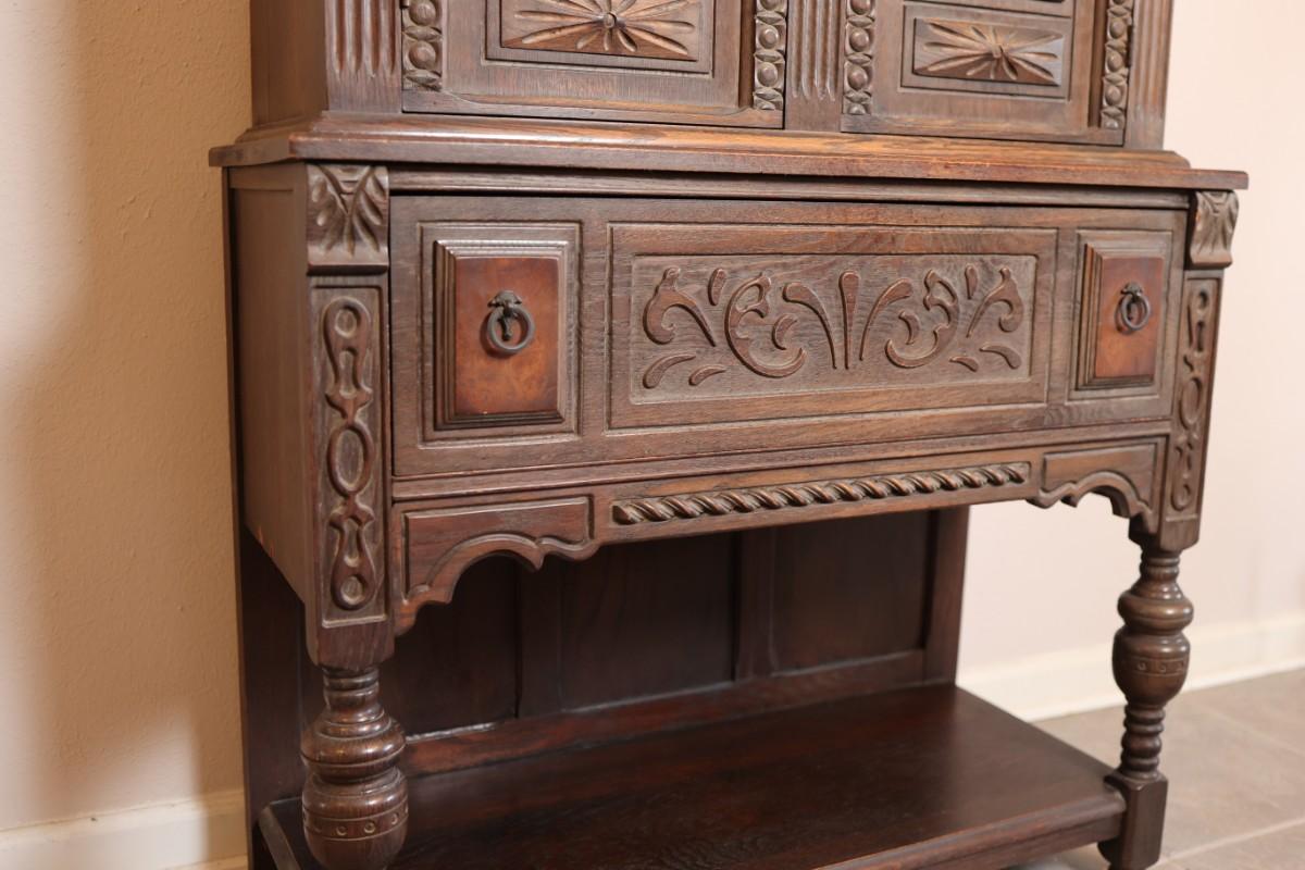 There are minor cracks in the doors, pictured. They are not noticeable until you look close. The cracks do not go through the wood. Some veneer is missing on the bottom side of the piece, pictured.