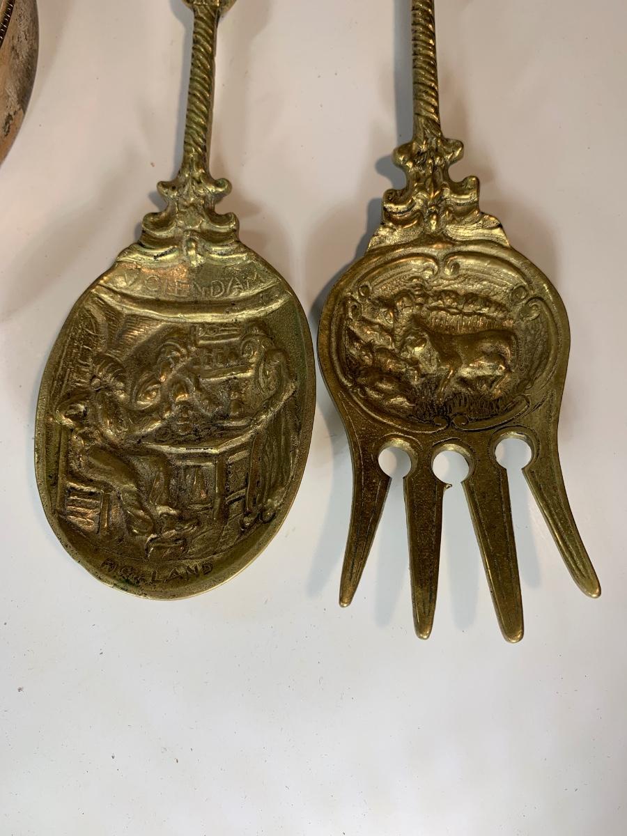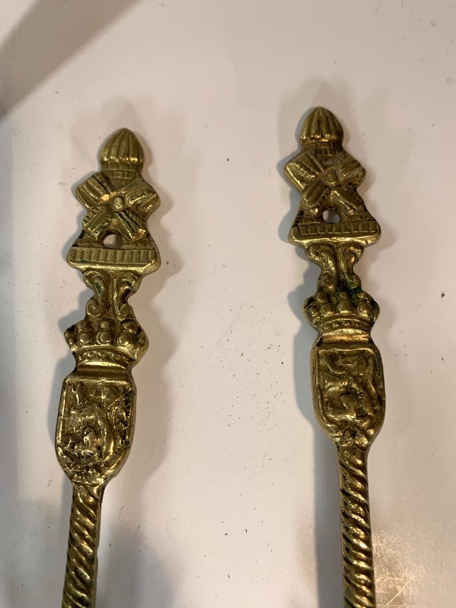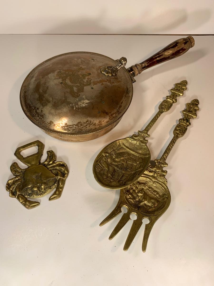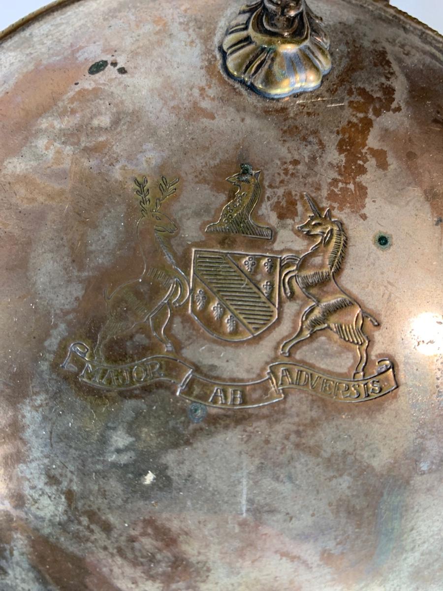 Warming pan inscribed with coat of arms and three brass items all of good quality