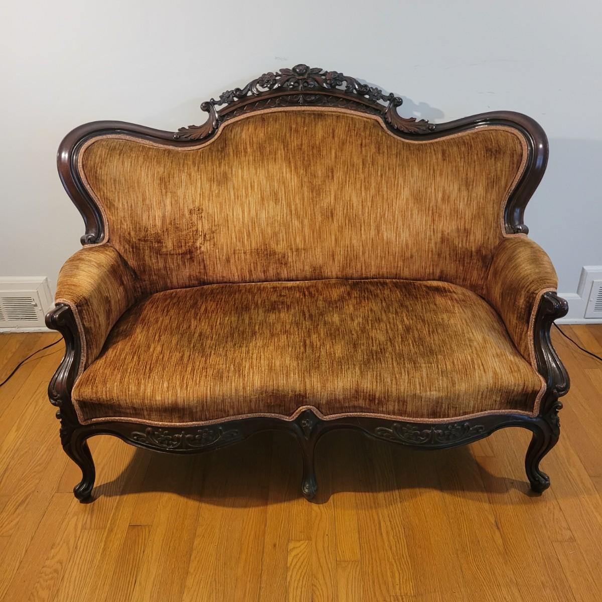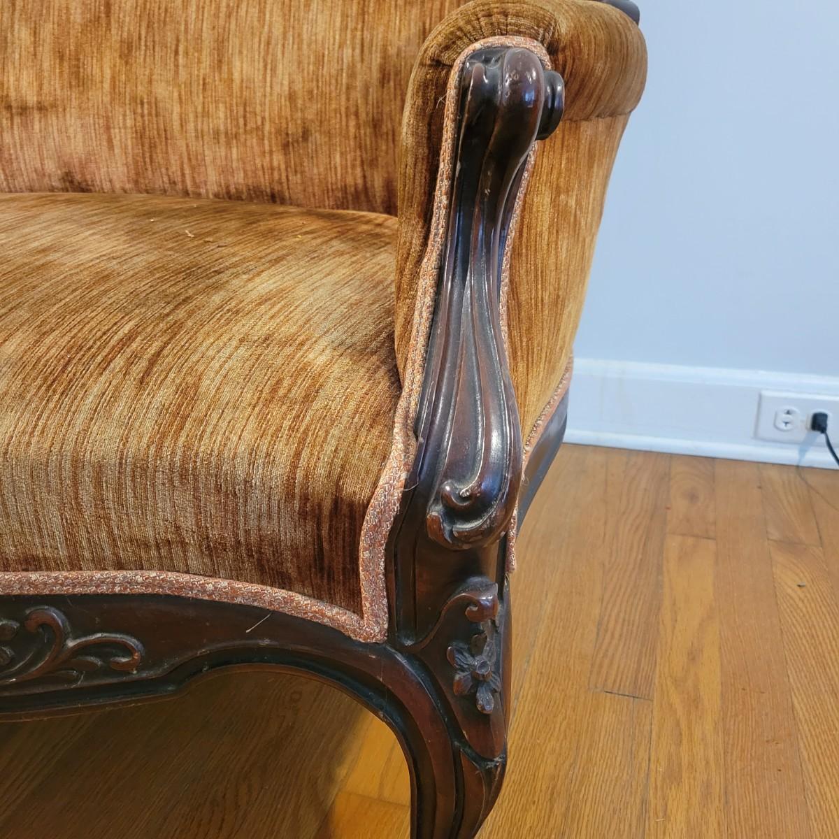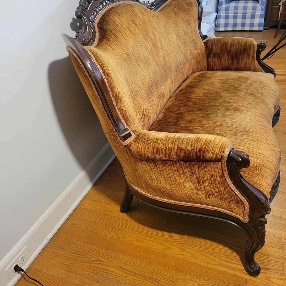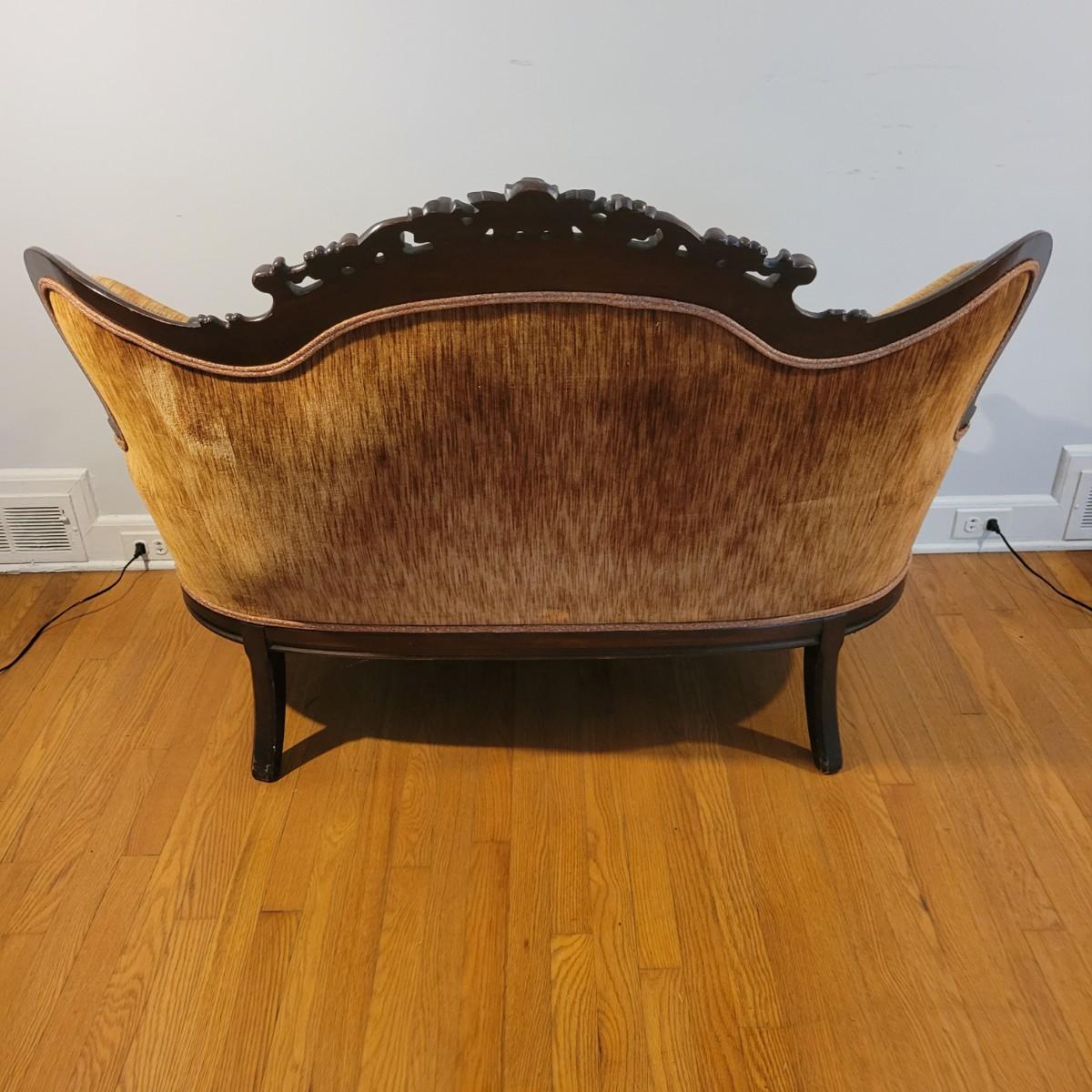 A beautiful carved wood framed loveseat with harvest gold upholstery in good condition. The upholstery has a soft velvet feel to it. There are no notable scratches, gouges or stains. There are some minor edges with the stain rubbed off. Loveseat measures approximately 53" x 30" x 38" and the seat height is approximately 15". Local pickup only.