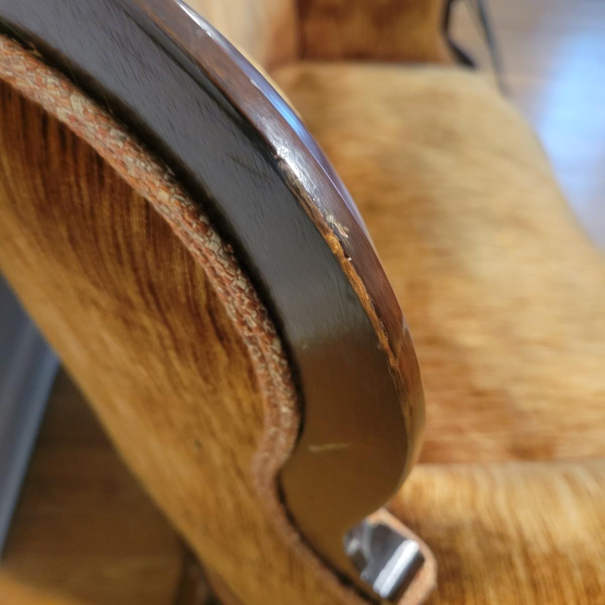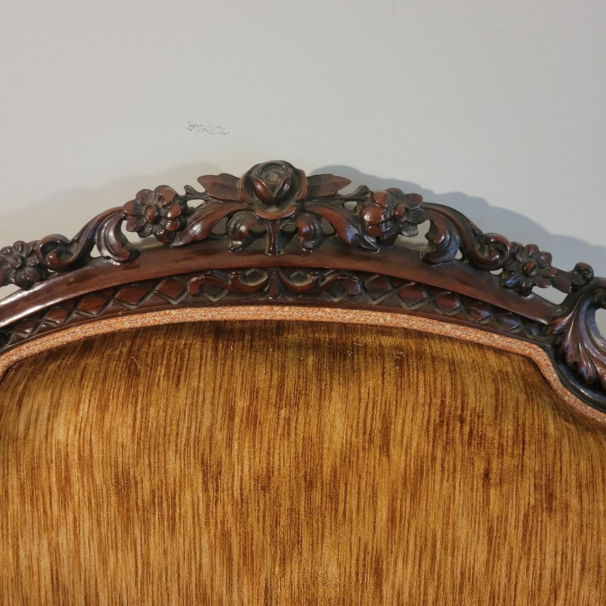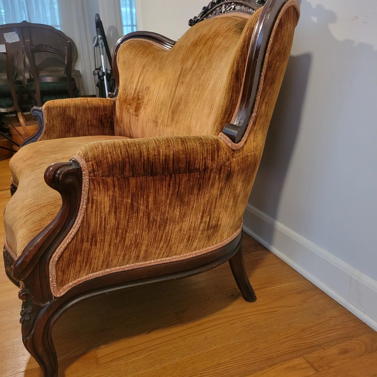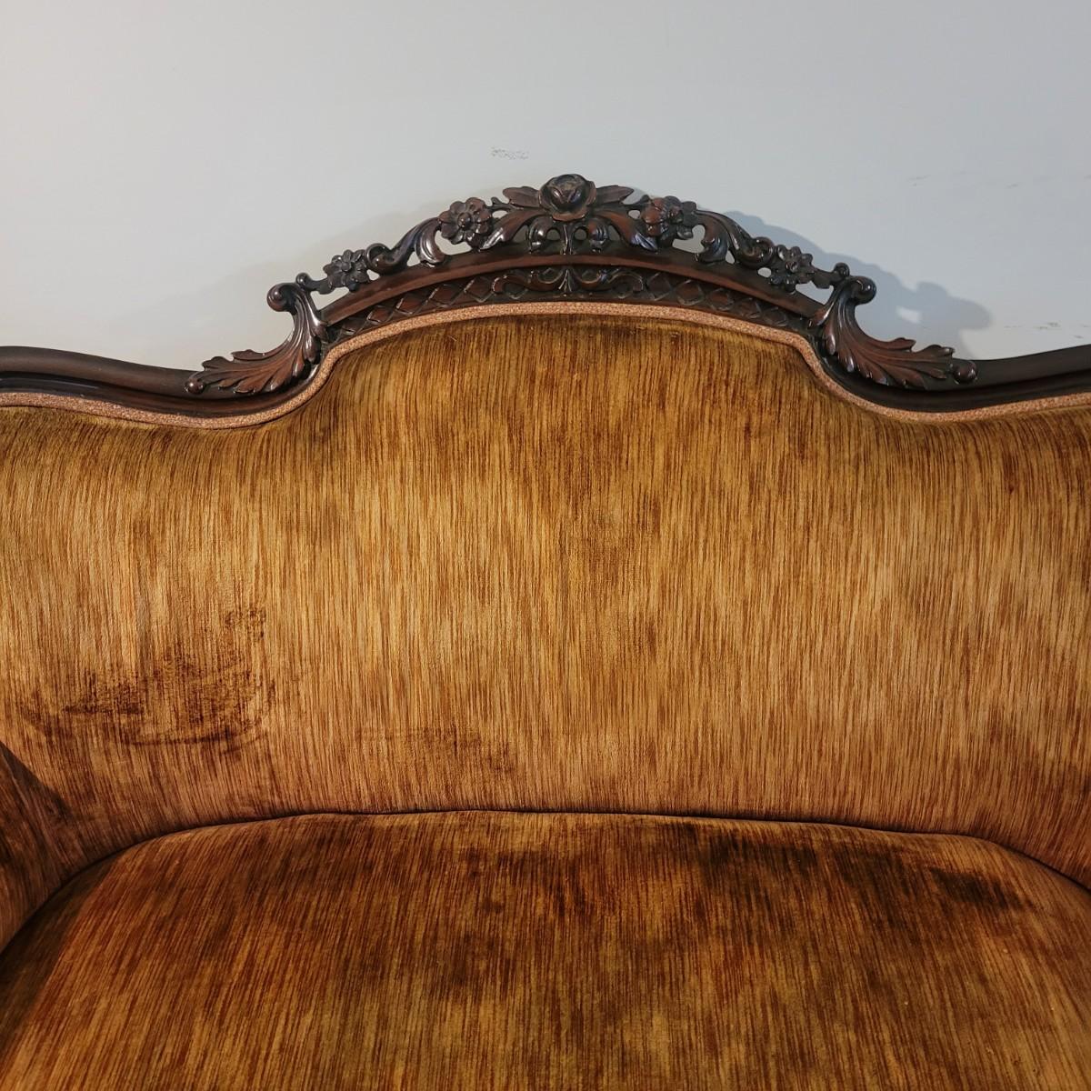 A beautiful carved wood framed loveseat with harvest gold upholstery in good condition. The upholstery has a soft velvet feel to it. There are no notable scratches, gouges or stains. There are some minor edges with the stain rubbed off. Loveseat measures approximately 53" x 30" x 38" and the seat height is approximately 15". Local pickup only.