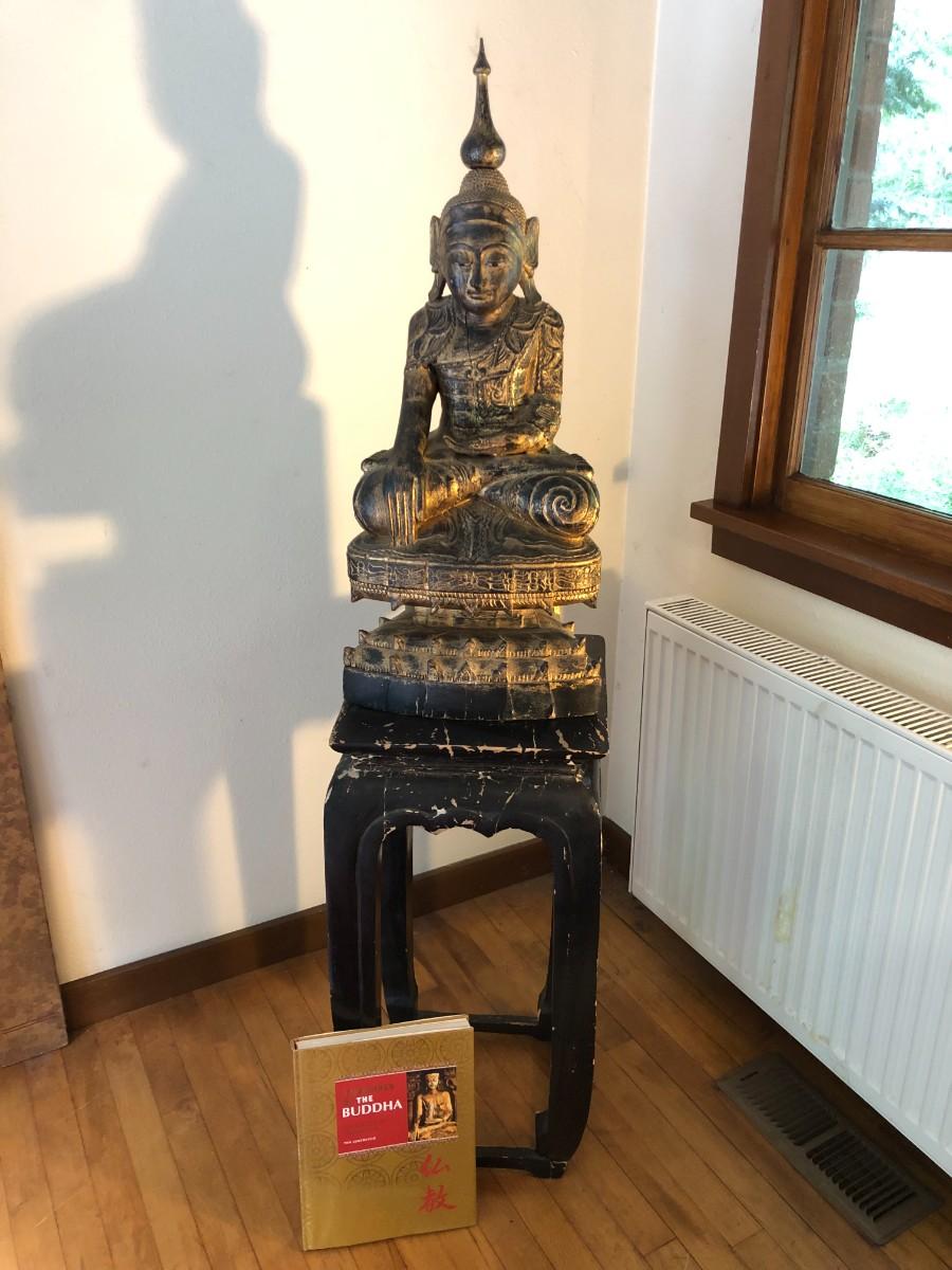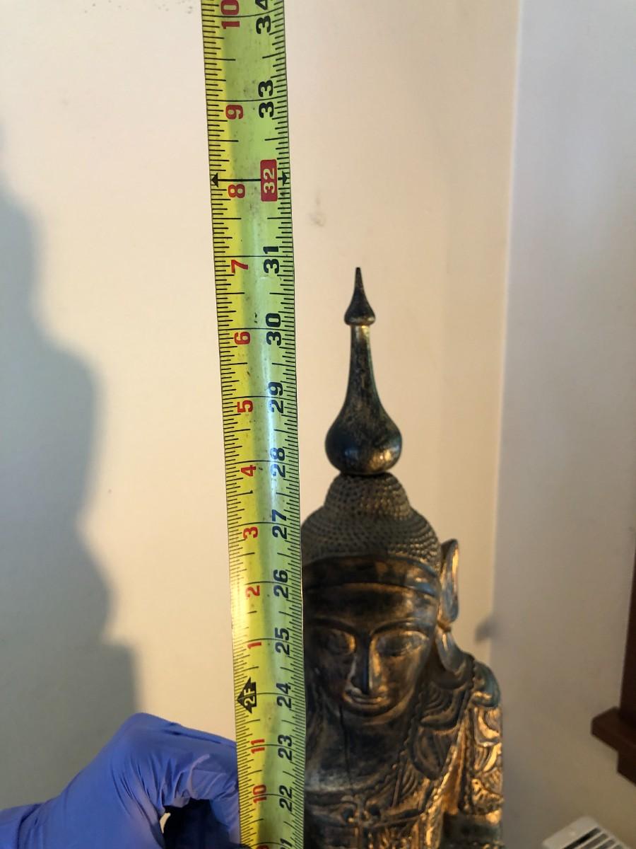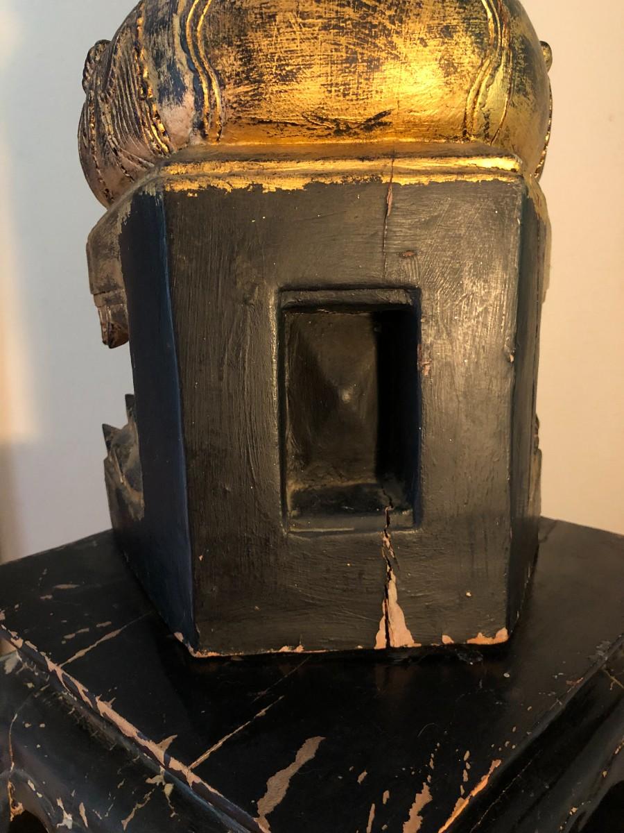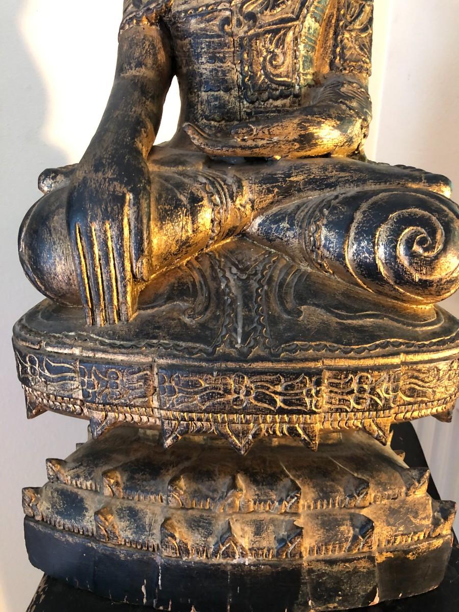 Rare and Beautiful Piece! Burmese Asian style, black and gold, carved wood Buddha statue and stand (and book, shown in photo). Wonderful carved wood details. Statue is approximately 31 inches tall. Seated Buddha. Head piece is removable. There is one significant crack in the statue (shown in photos).