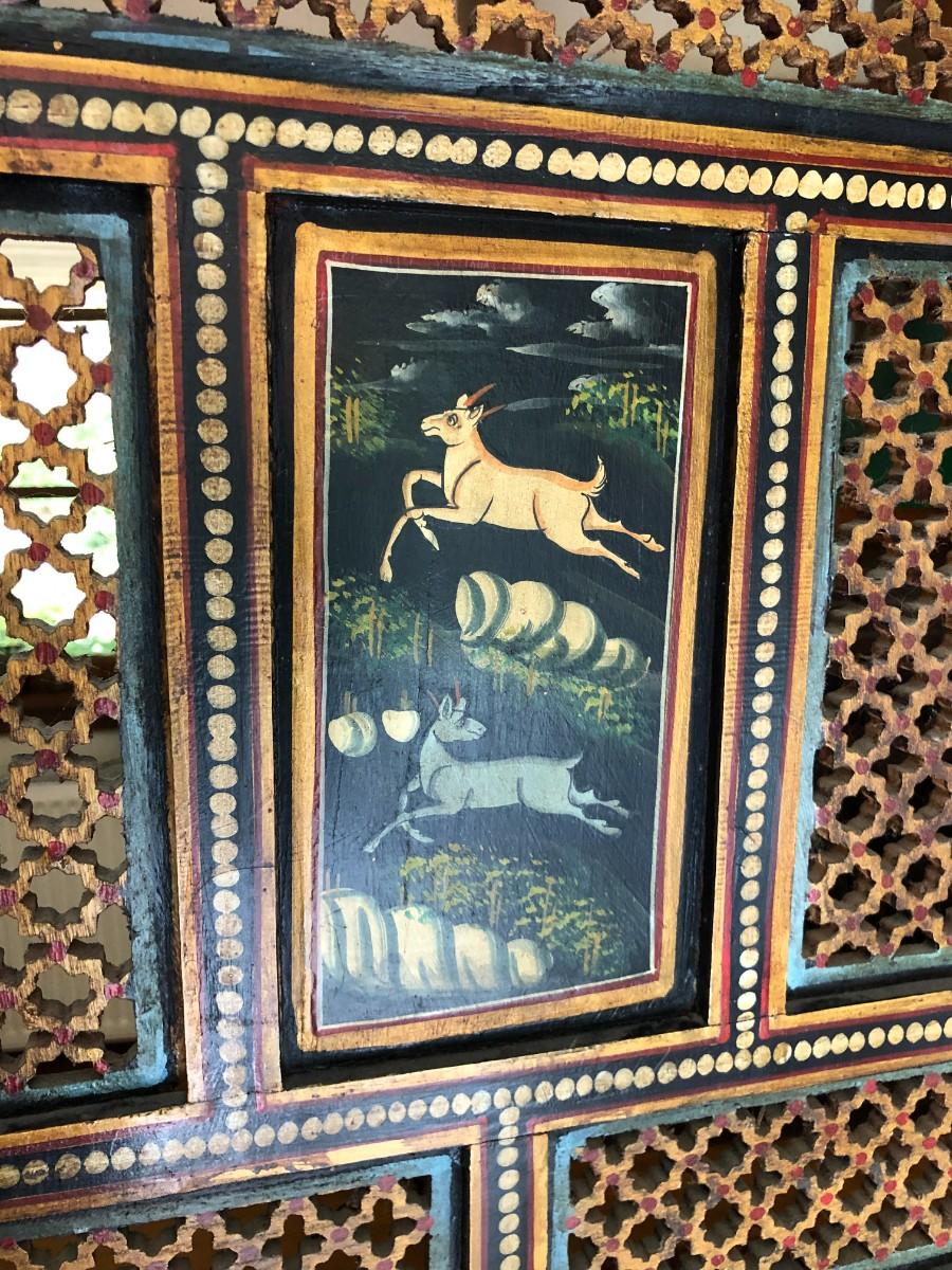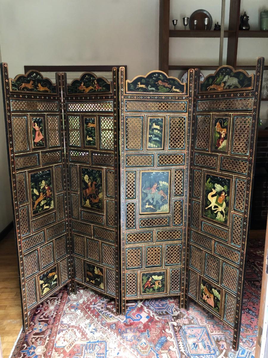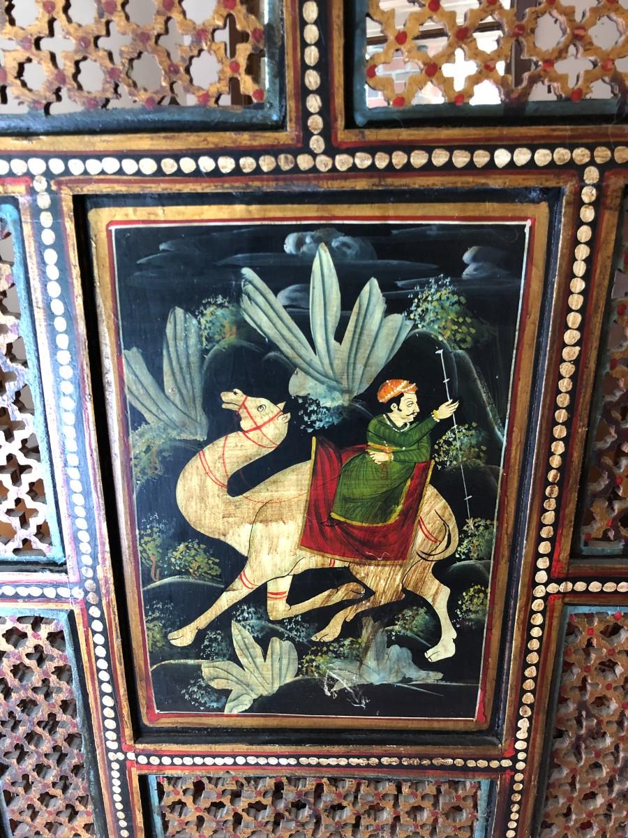 Antique Carved Wood Hand Painted Indian Rajasthani 4 Panel Screen