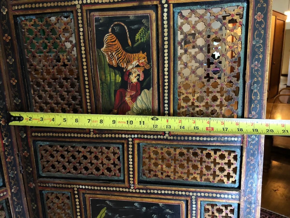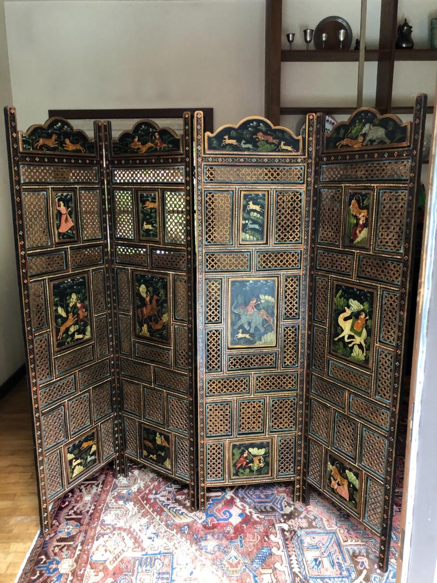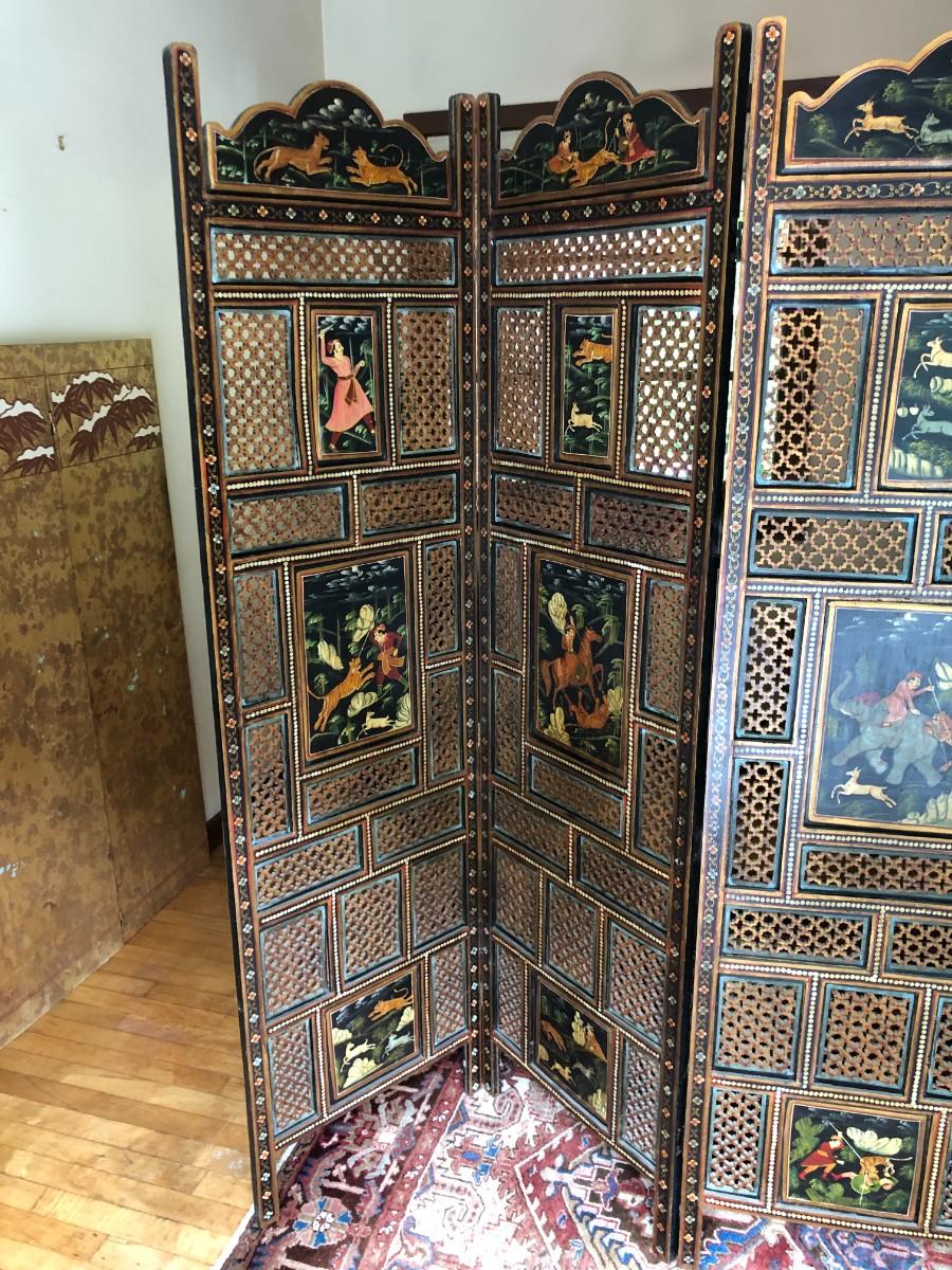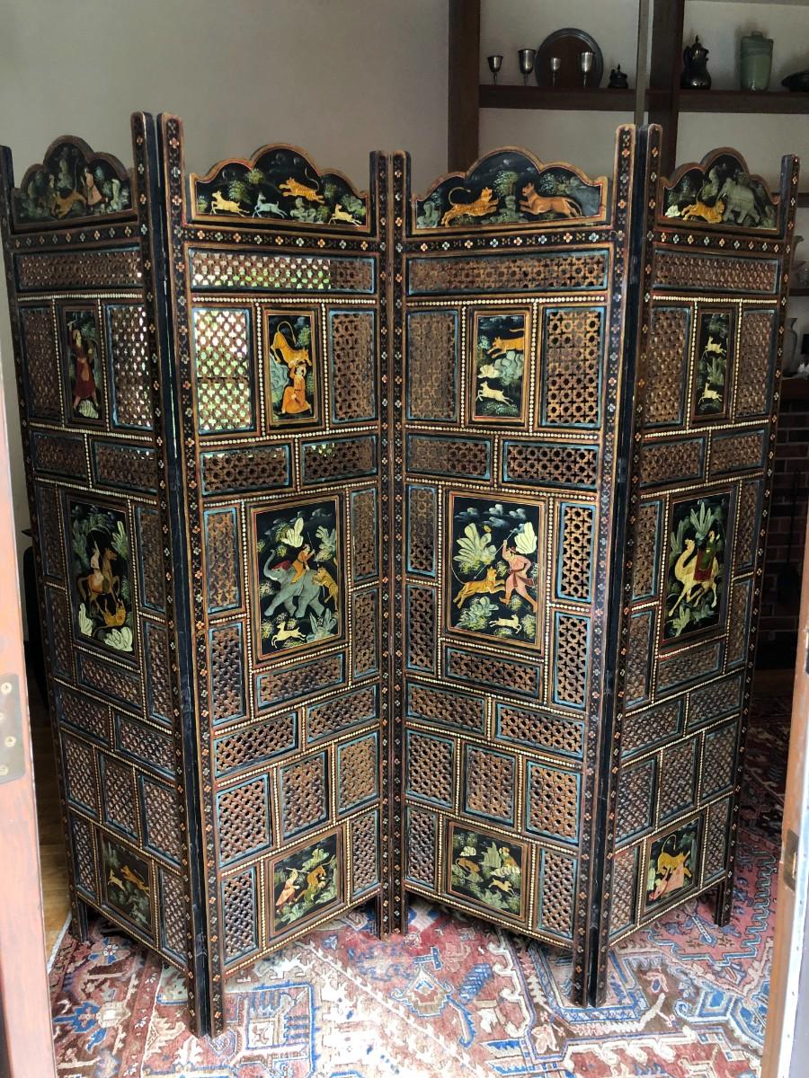 Antique Carved Wood Hand Painted Indian Rajasthani 4 Panel Screen