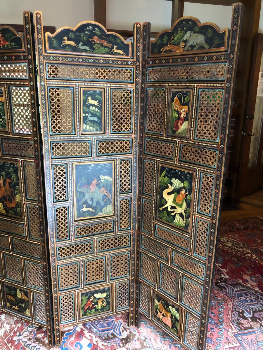 Beautiful antique Indian wood screen- hand painted with scenes of tiger hunting and traveling scenes. Rajasthani style. Dressing screen or privacy screen. Great for home décor. Very good condition. Four panels.