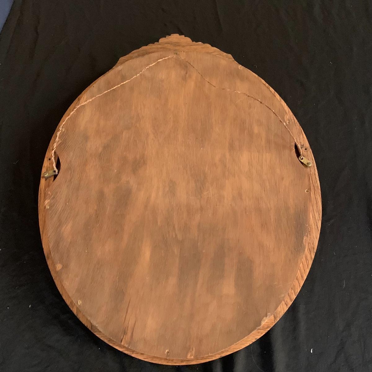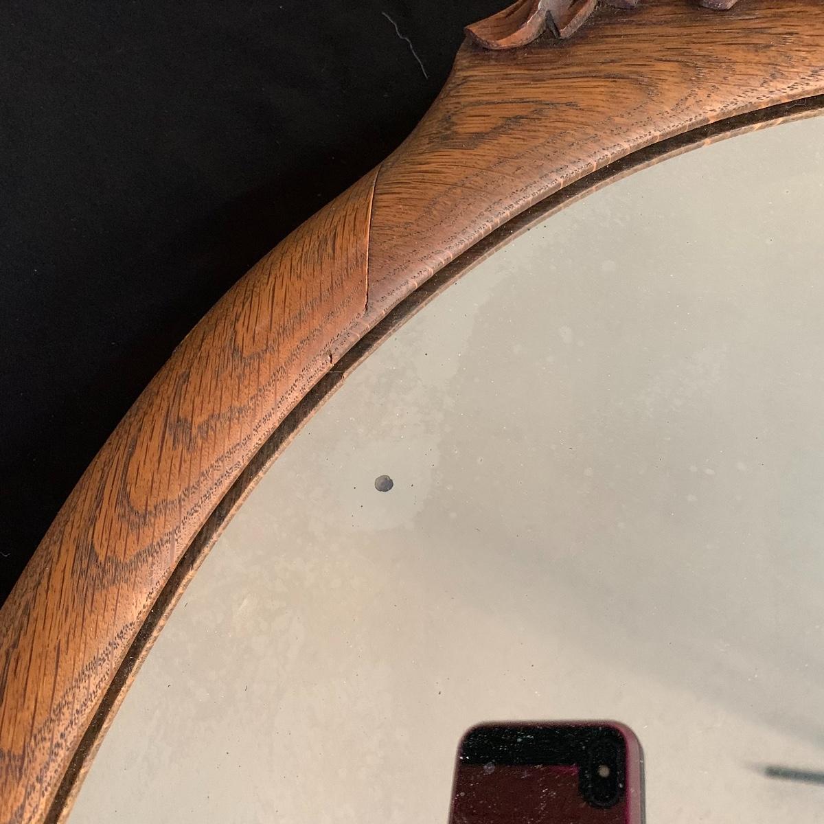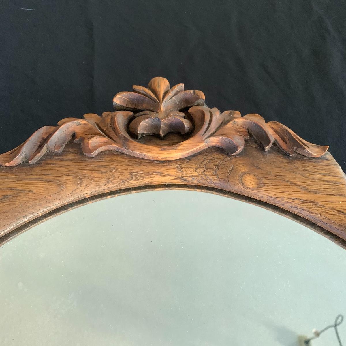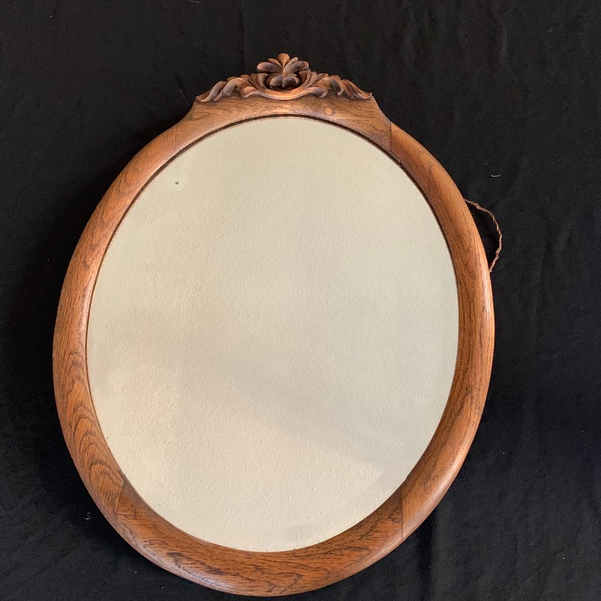Beautiful beveled oval mirror in a wood frame with carved motif at the top measures 24” x18”. Mirror has some discoloring but in fine condition. Hangs vertical. Local pick up only.