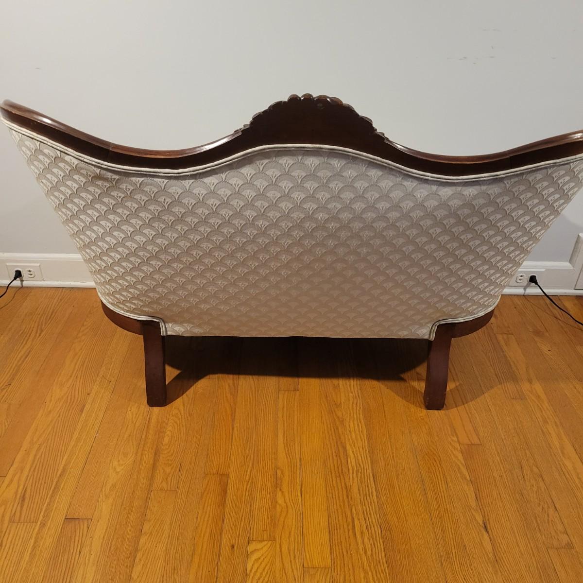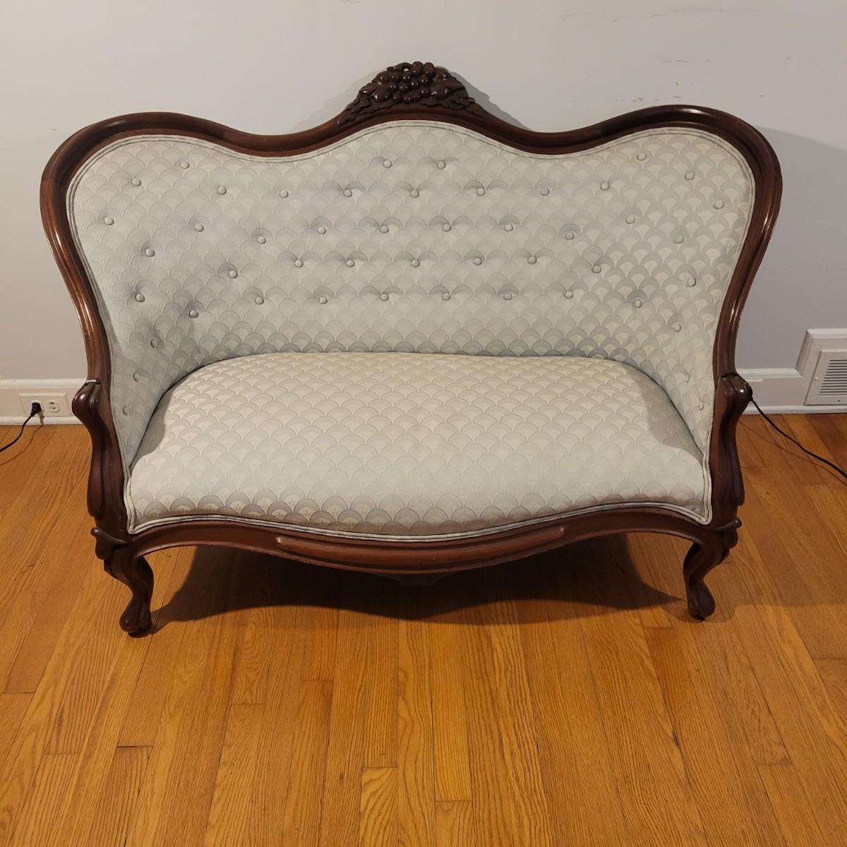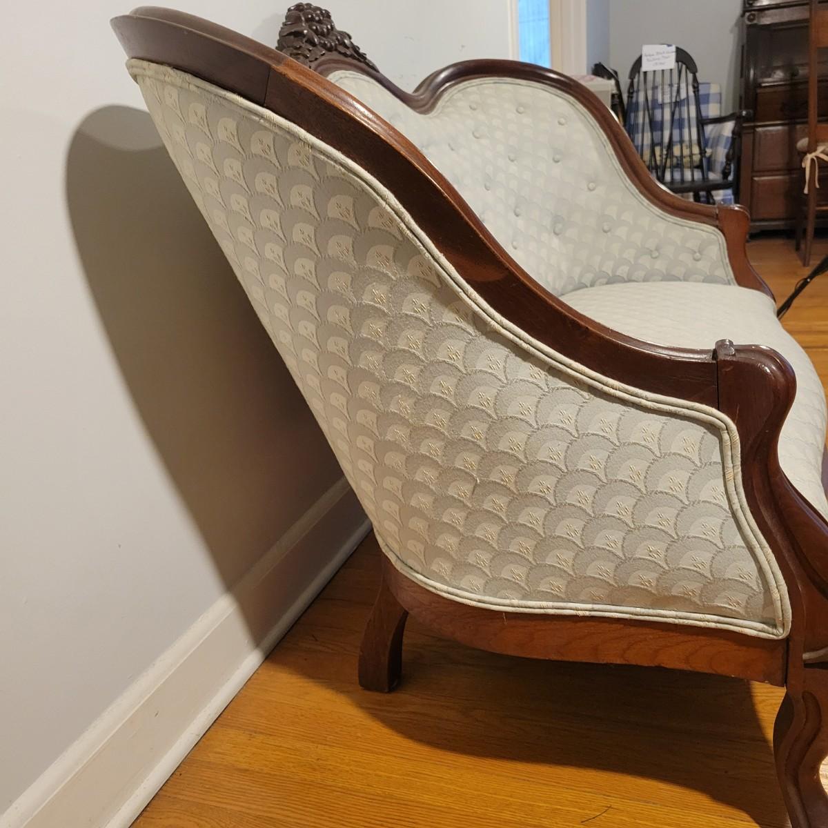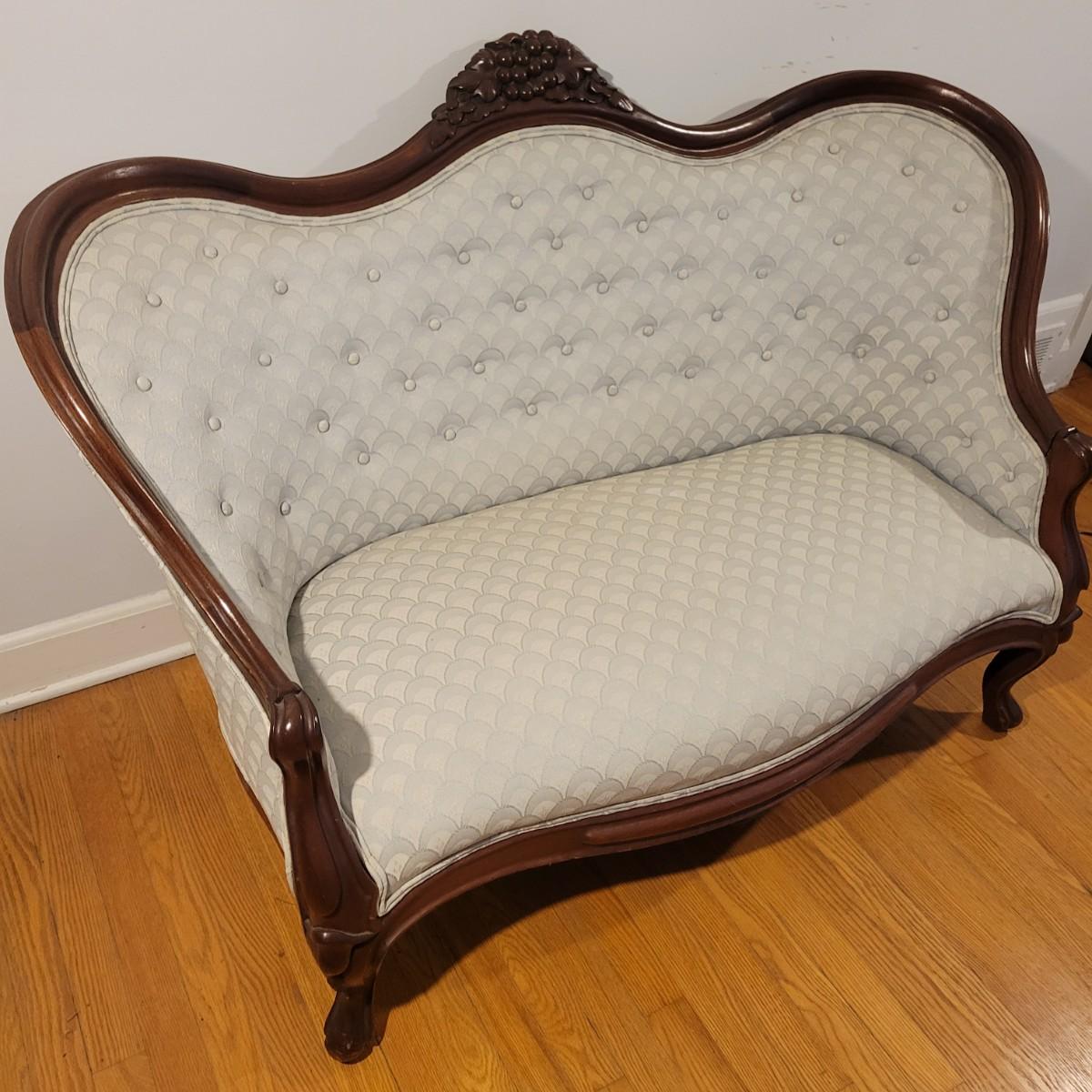 Beautiful antique wood carved loveseat in good condition. Upholstery has no stains or tears and the wood has no scratches or gouges. One side has a small crack in the wood where the leg attaches to the arm of the loveseat. Loveseat measures approximately 52" x 27" x 34". Seat height is approximately 14". Local pickup only