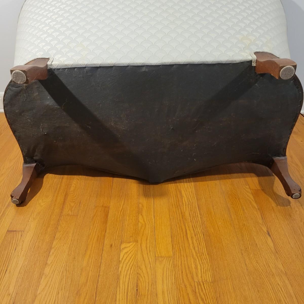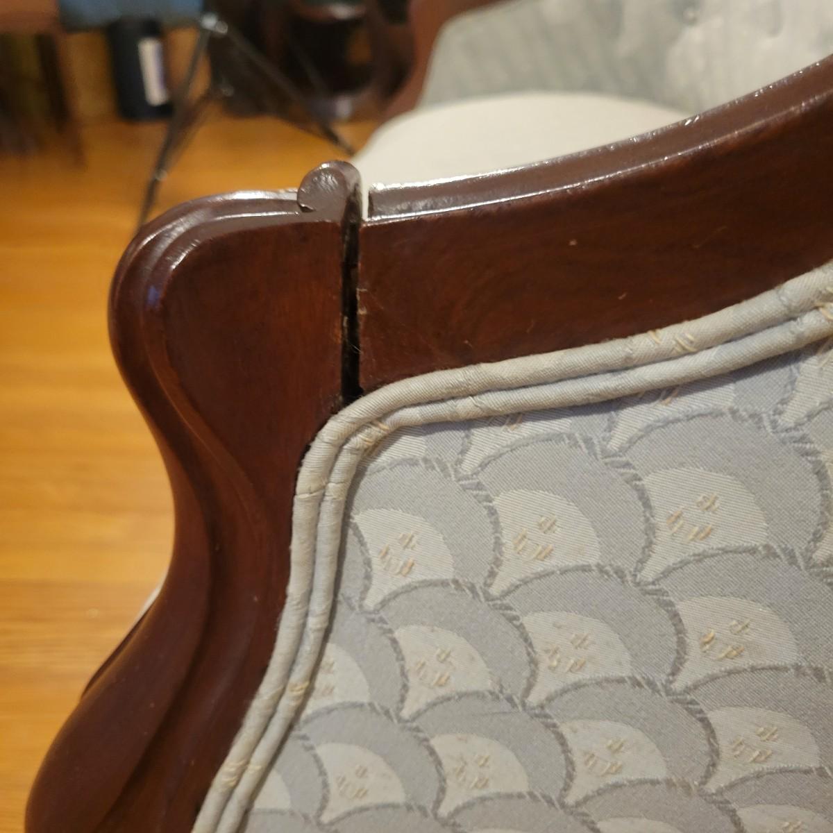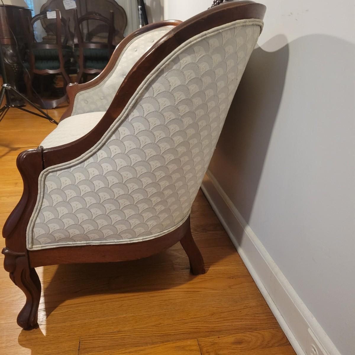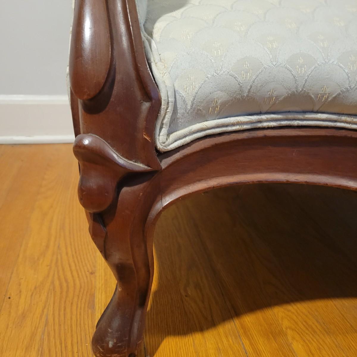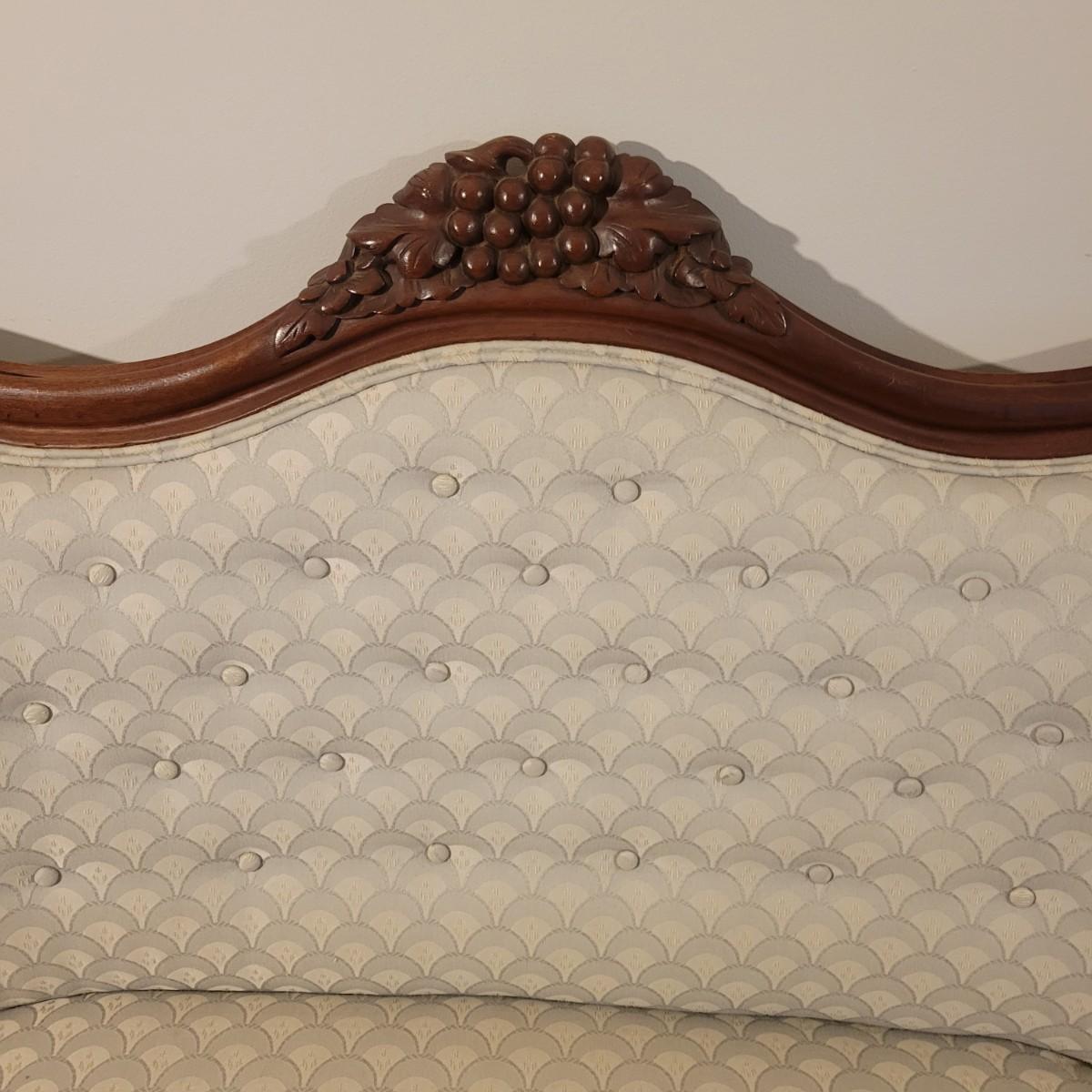 Beautiful antique wood carved loveseat in good condition. Upholstery has no stains or tears and the wood has no scratches or gouges. One side has a small crack in the wood where the leg attaches to the arm of the loveseat. Loveseat measures approximately 52" x 27" x 34". Seat height is approximately 14". Local pickup only
