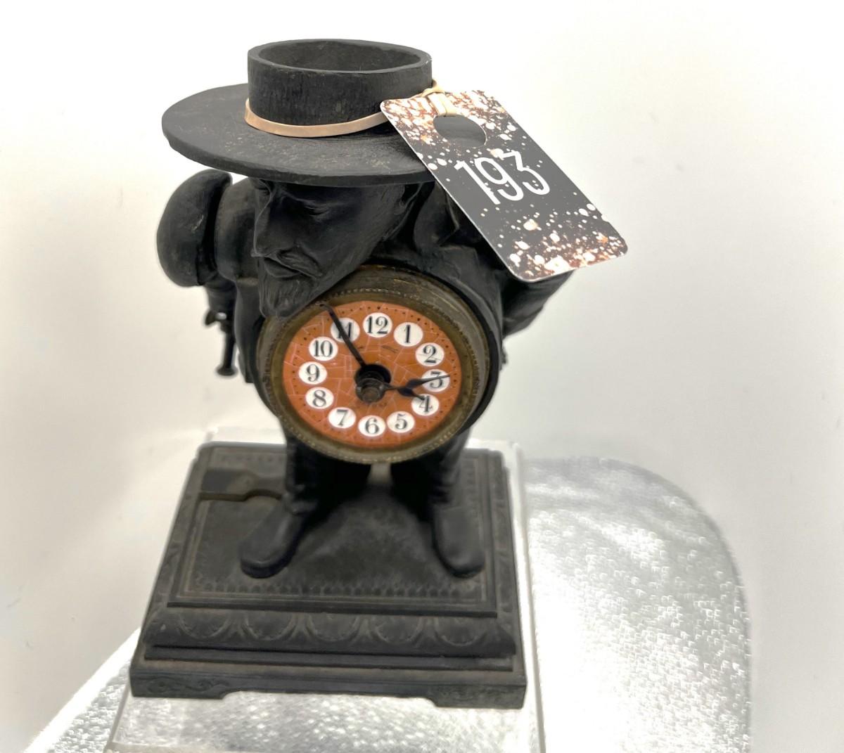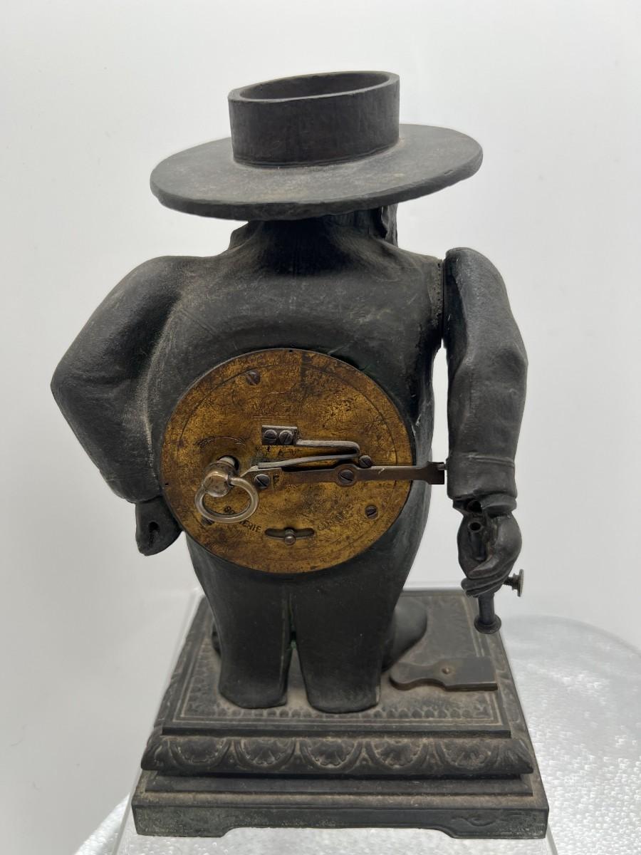 We are told that when the clock strikes the hour, the arm rises up, lights a match, and lights the candle in the hat.
