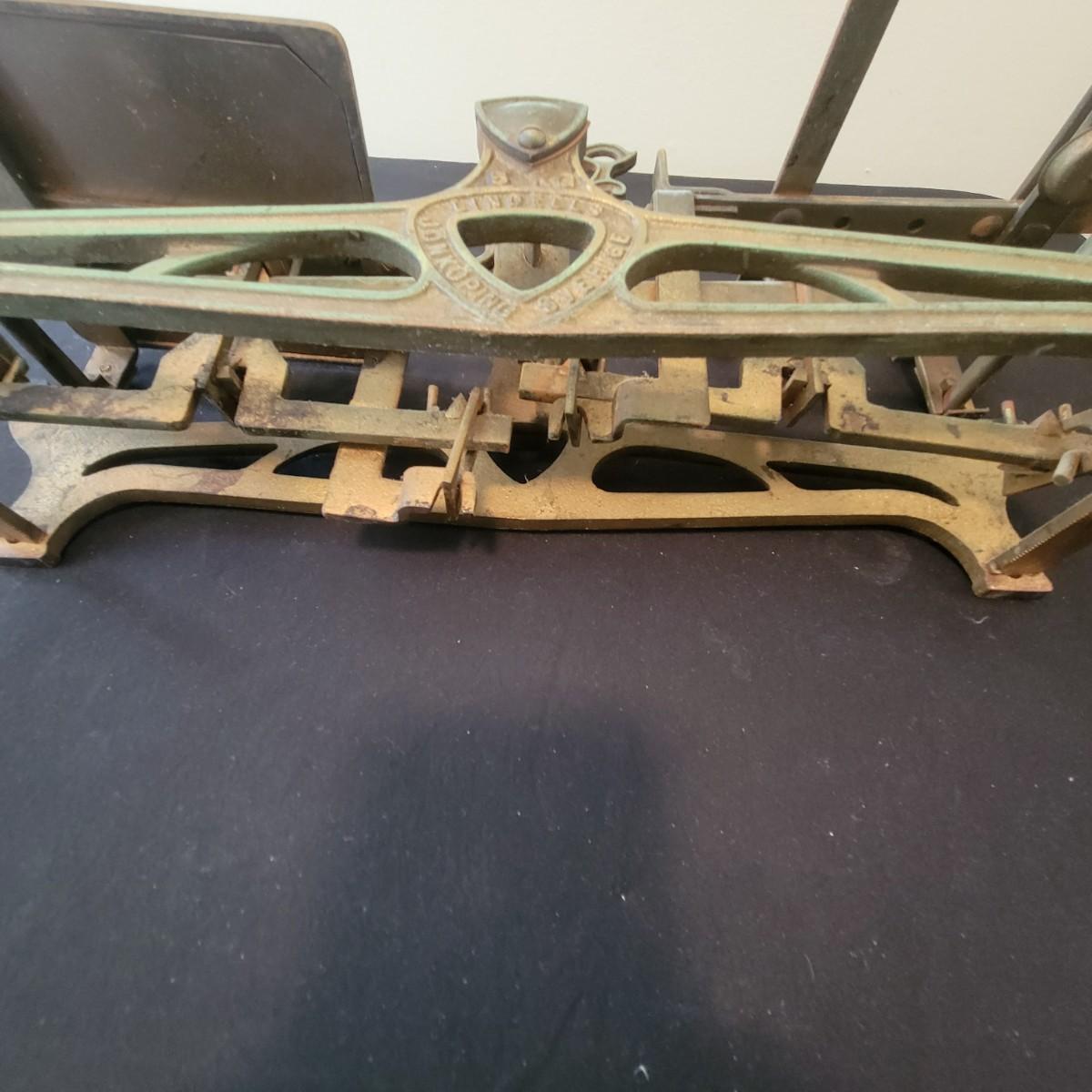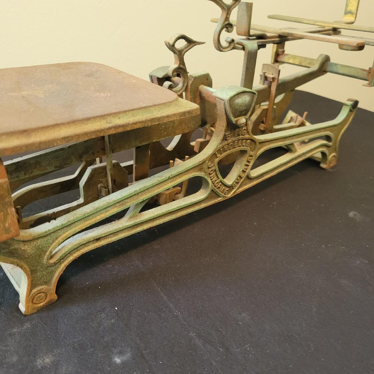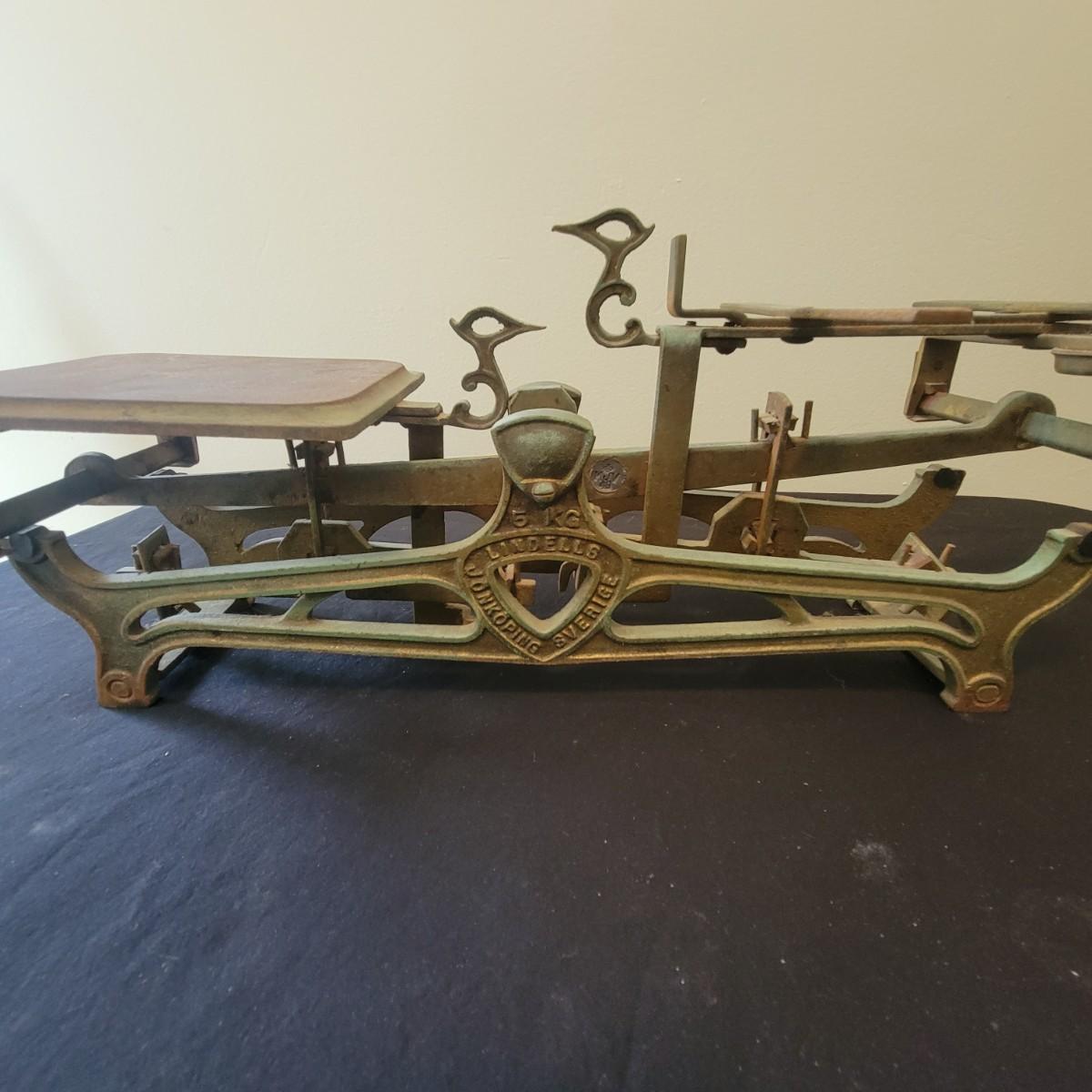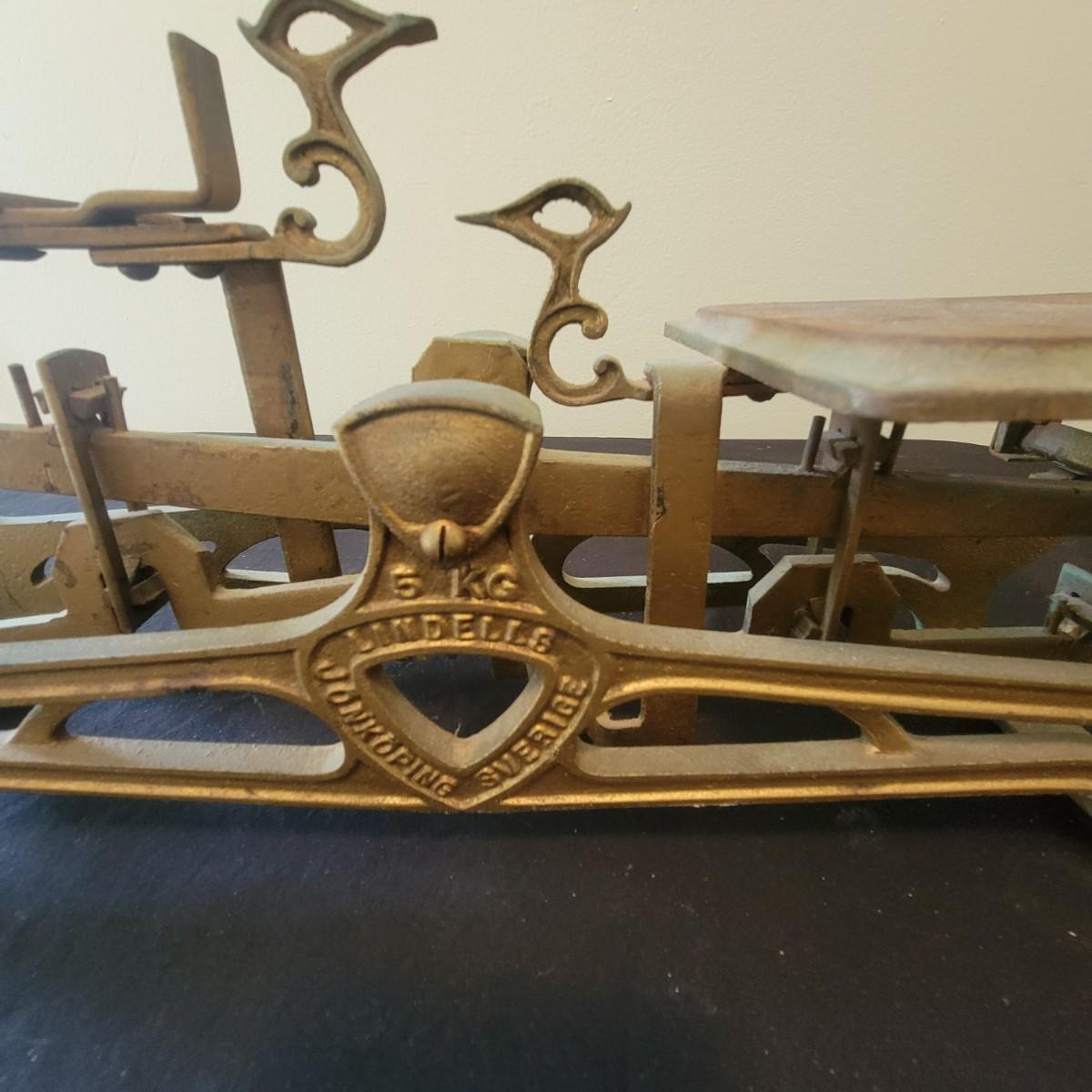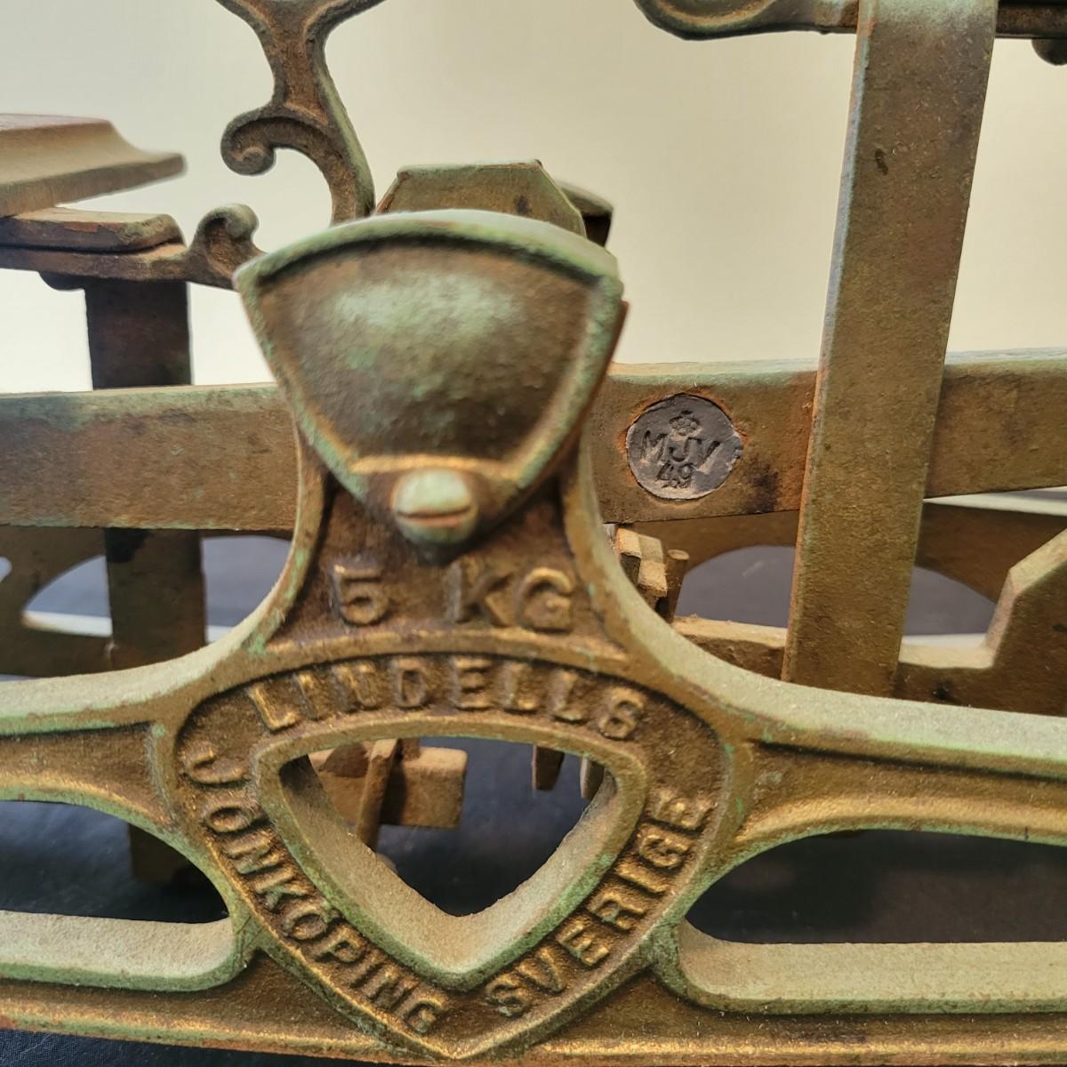 Cast iron scale produced by Lindelle, Jonkoping and Sverige. Made of cast iron and in beautiful condition. Has a faux copper patina and is scaled to measure 5kgs. All parts appear to be present and working. Shipping available.